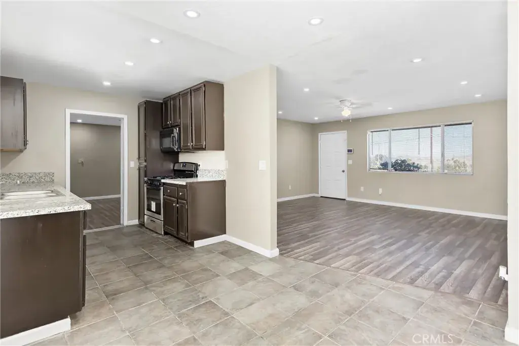 As you enter, you’re greeted by a nicely sized living room that flows seamlessly into the kitchen and breakfast nook, creating an open and inviting layout. The kitchen features granite countertops and brand-new stainless steel appliances, including a dishwasher, microwave, and gas range.