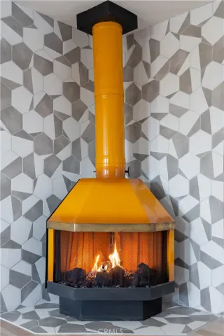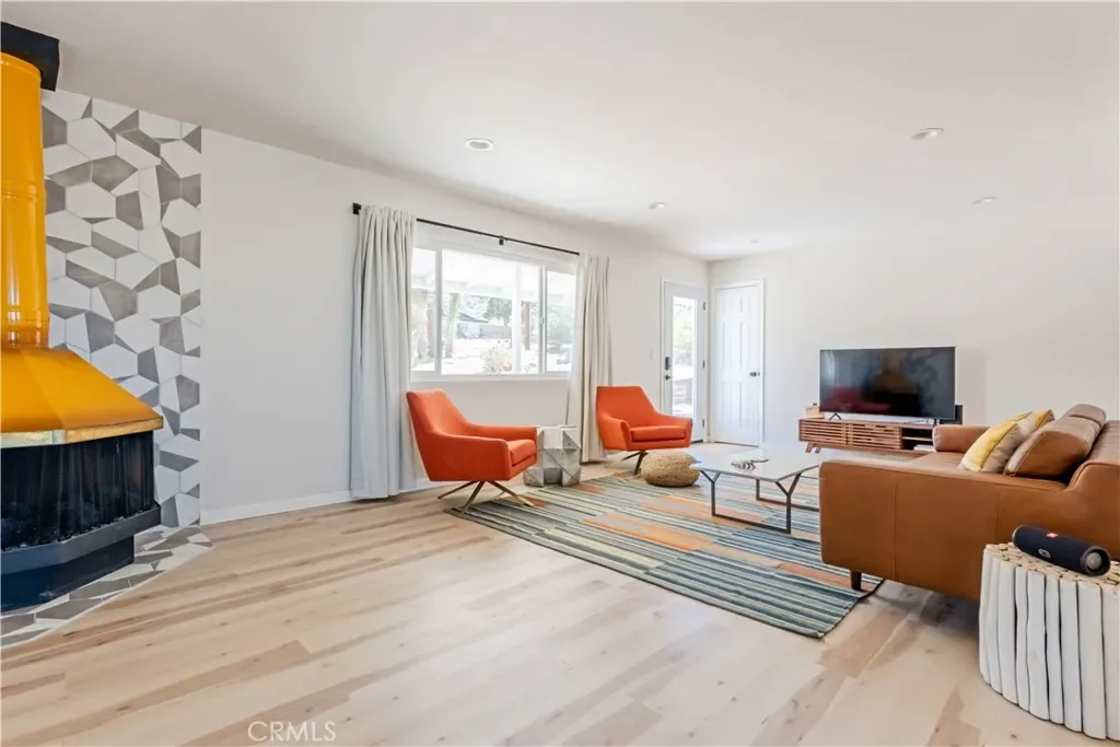Inside, the home has been refreshed with a clean, modern aesthetic. The remodeled kitchen features stone counters, stainless steel appliances, and generous cabinetry, opening to the dining area with large windows and sliding doors that connect easily to the backyard patio. The living room centers around a distinctive freestanding fireplace with a geometric tile surround, creating a comfortable focal point for the space.