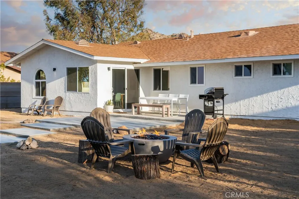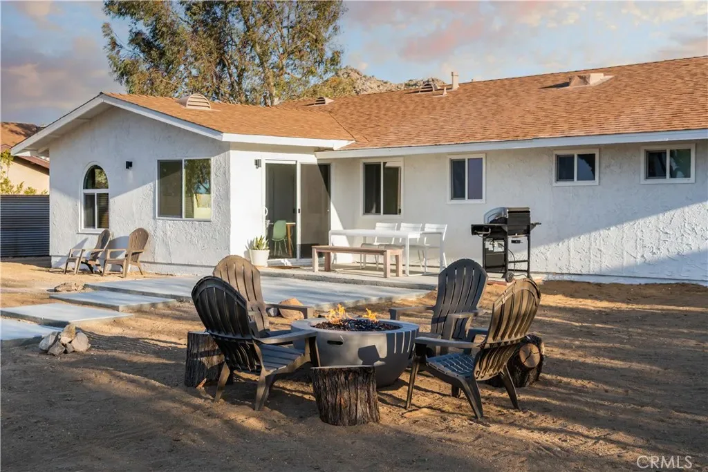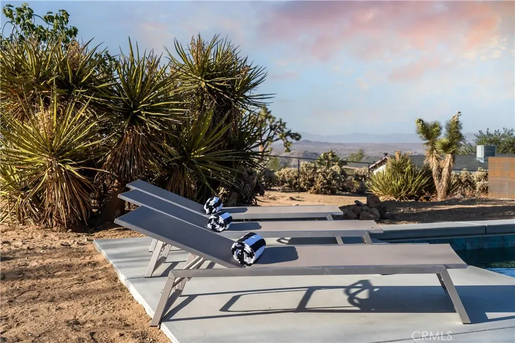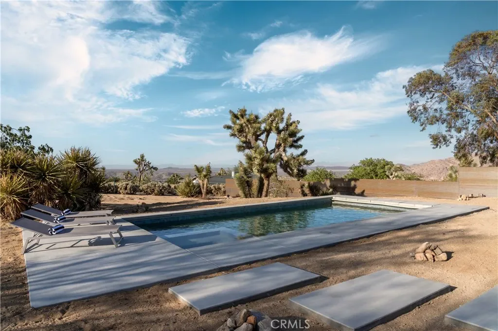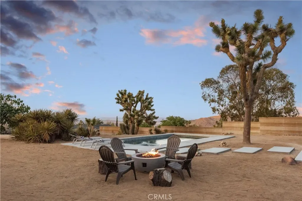 Set against the rugged hills and open desert skies of Joshua Tree, this updated home offers a comfortable high desert setting with space to relax and enjoy the outdoors. The backyard is designed for desert living, featuring a private pool and spa, a spacious concrete deck for lounging, and a fire pit area that’s perfect for evenings under the stars. The surrounding landscape and nearby boulder hills create a scenic backdrop that feels distinctly Joshua Tree.