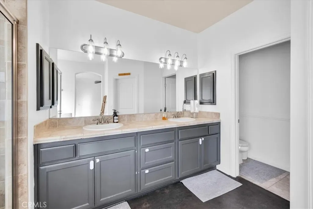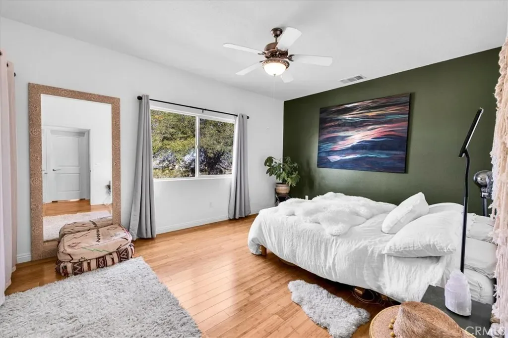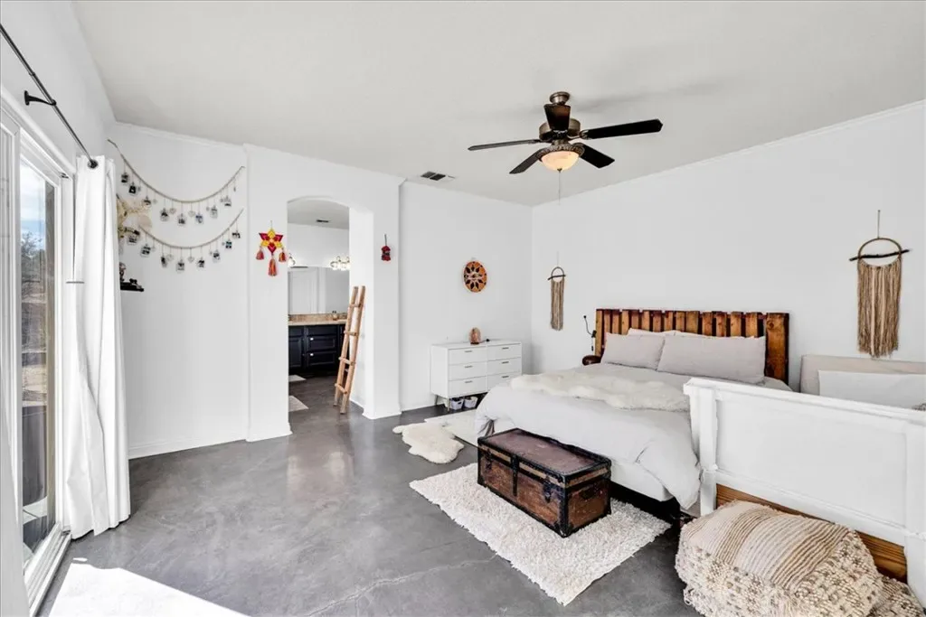 Entering the primary suite, you’ll be taken aback as it resembles a luxury resort. Spacious and inviting, with concrete flooring and a sliding glass door, this space is a true sanctuary. The luxury primary bathroom rivals any spa-like experience, outfitted with a soaking tub, a large walk-in tiled shower, a dual vanity, and a large closet—there’s no better setup!