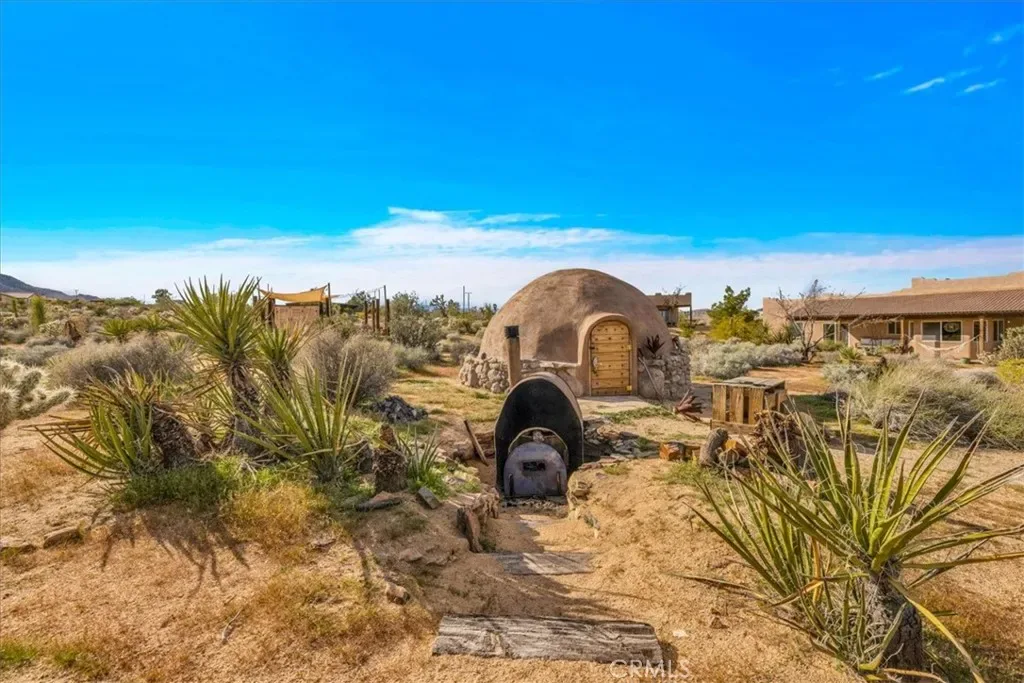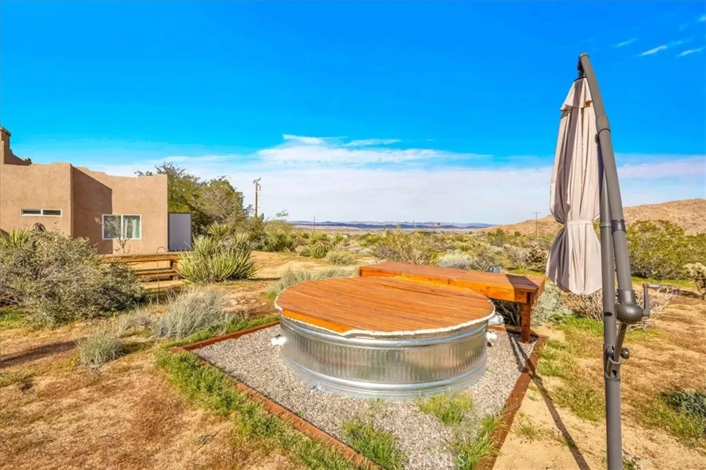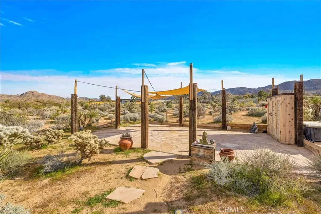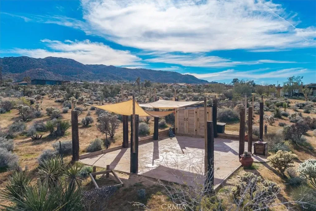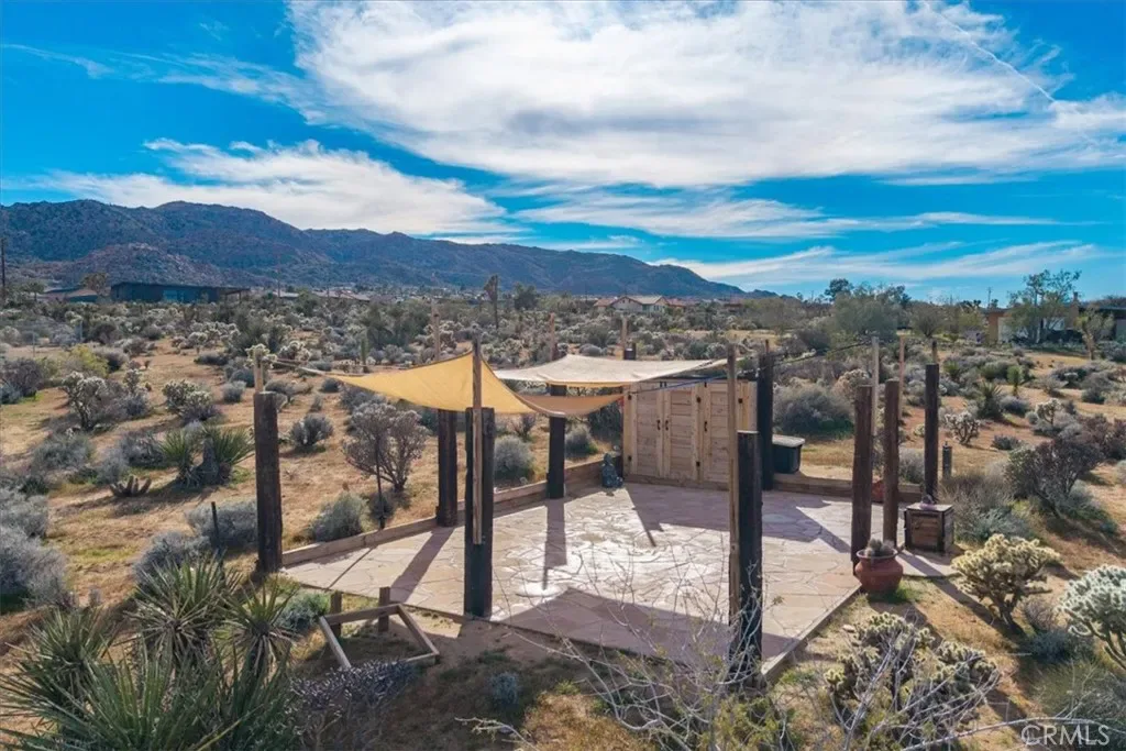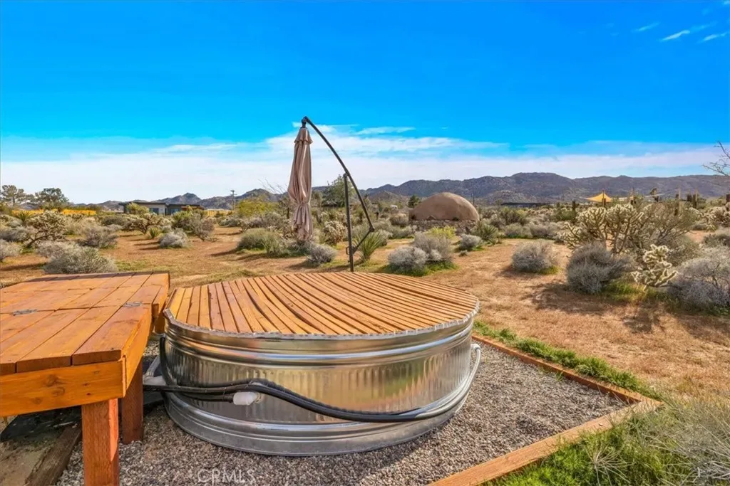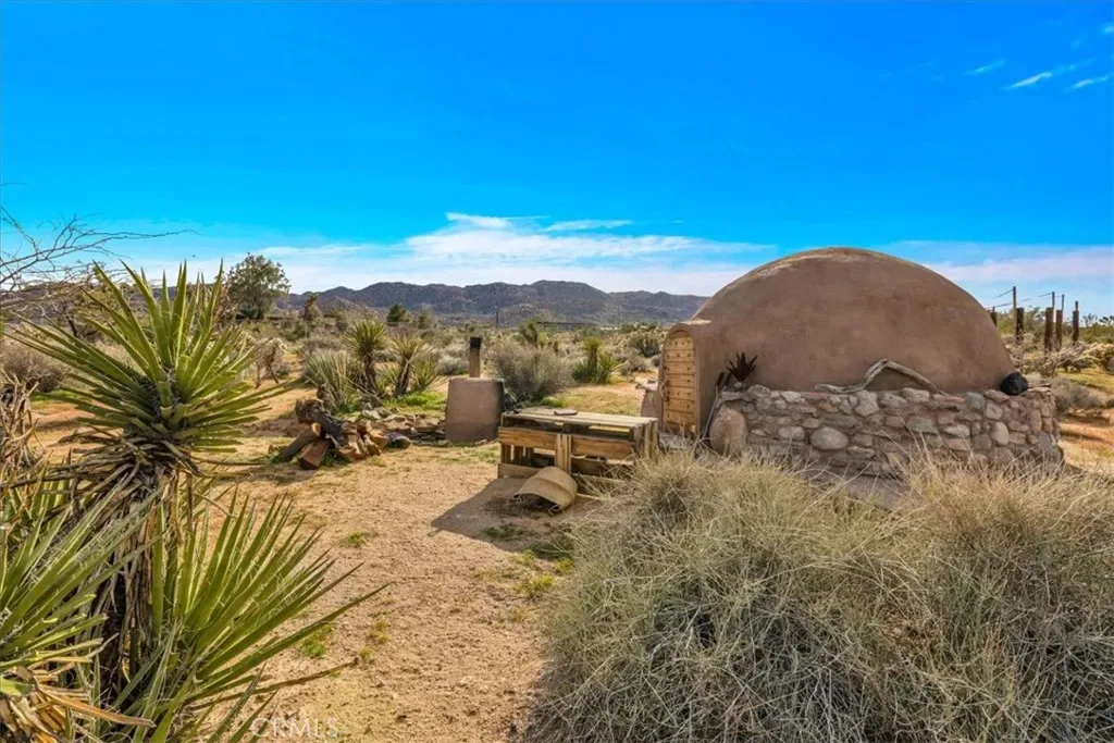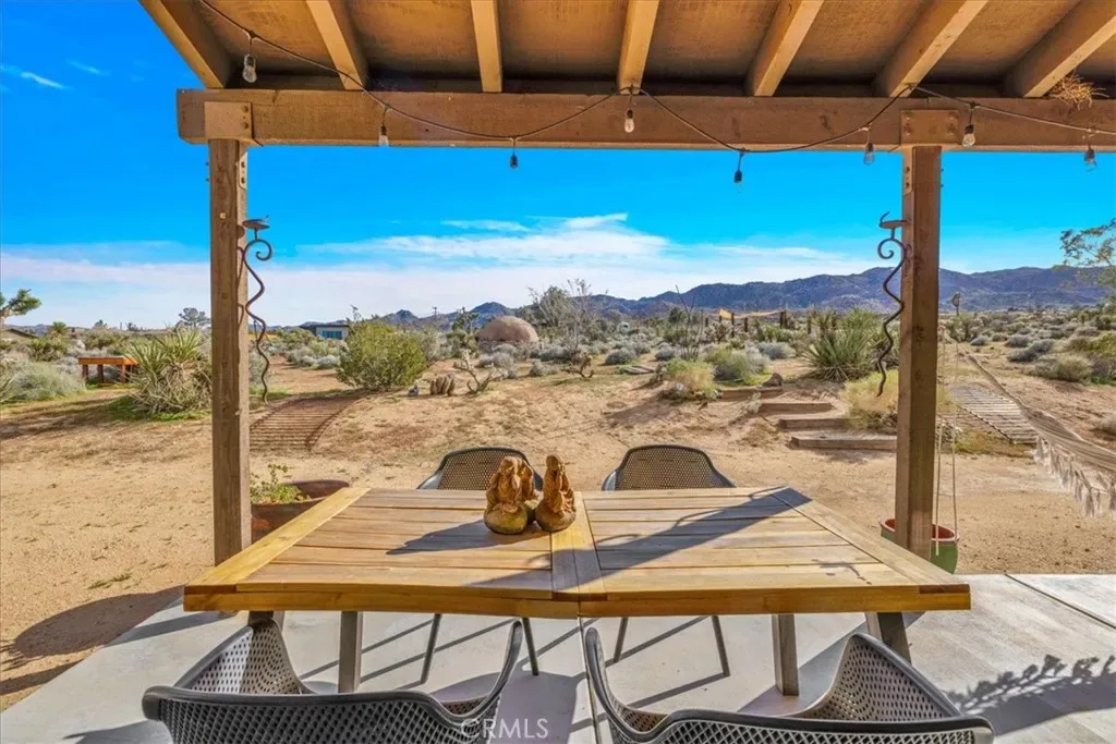 Back outside, you’ll be amazed by the ideal outdoor living space! A large rustic covered patio designed for outdoor dining or as a perfect spot to sit and admire the expansive Joshua Tree skies, incredible views of Joshua Tree National Park, a rare & spacious Temescal sweat lodge, meditation platform, cowboy tub, and more make this not just a backyard but a one-of-a-kind sanctuary!