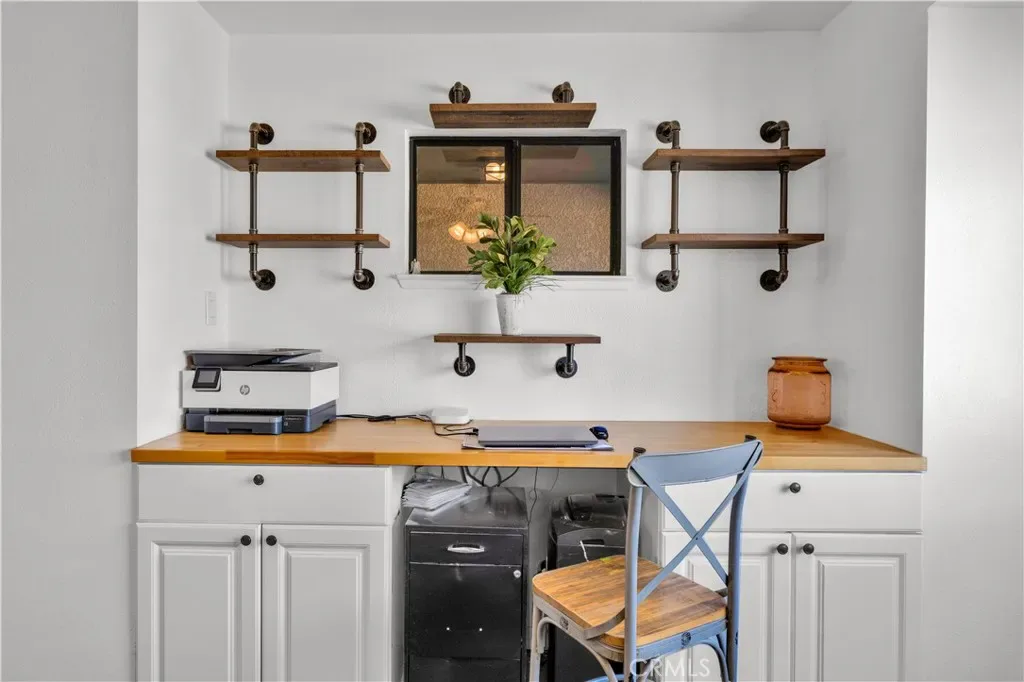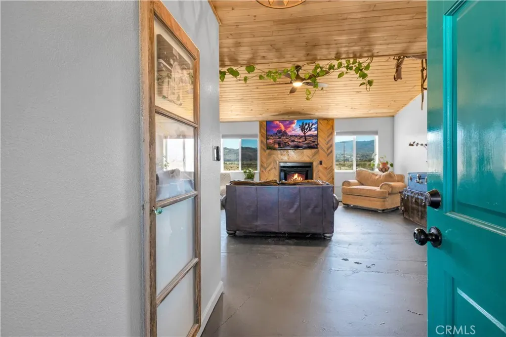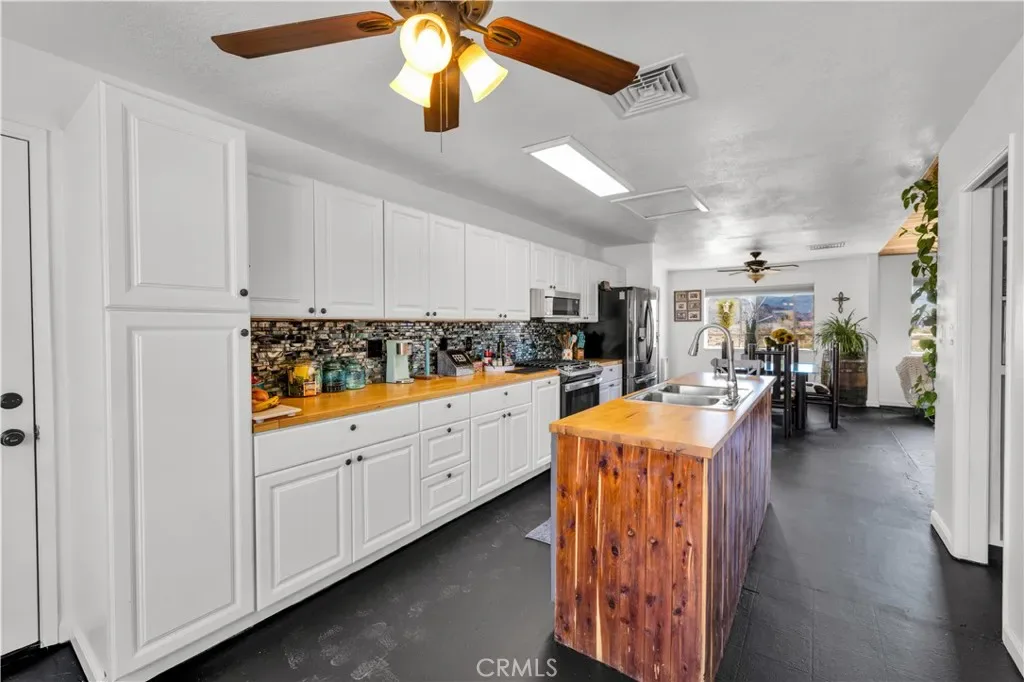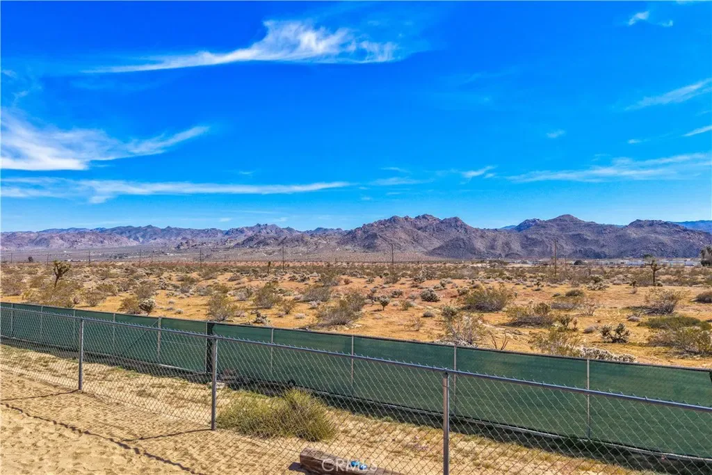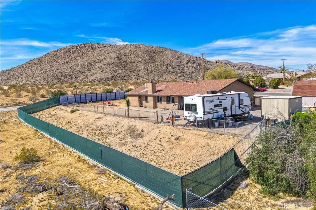 This spacious 3-bedroom, 2-bath home sits on a large corner lot and offers incredible views of the surrounding mountains near Joshua Tree National Park. As you approach the property, you’ll appreciate the mature desert landscaping and the abundance of parking. A concrete driveway leads to the attached two-car garage, while a side yard with a drive-through gate provides convenient RV parking with hookups along with plenty of additional space for trailers, vehicles, or desert toys. Before entering the home, you’ll pass through a gated front entry that creates a private courtyard, perfect for enjoying a quiet cup of coffee in the morning. Inside, the home welcomes you with beautiful vaulted tongue-and-groove ceilings in the living room and large banks of windows that bring in natural light and showcase the stunning mountain views. The open floor plan allows the living room to flow seamlessly into the dining area and kitchen, creating a comfortable and functional layout for everyday living and entertaining. The remodeled kitchen features butcher block countertops, a stylish backsplash, stainless steel appliances, and an island, along with an office desk space just off the kitchen. Nearby, a multipurpose room serves as both the laundry area and additional pantry or storage space. The primary bedroom is generously sized and offers ample closet storage. The ensuite bathroom has been remodeled and includes a new vanity and a stylish walk-in shower. The two additional bedrooms are both spacious, and the conveniently located guest bathroom has also been updated and features a shower-tub combo. The attached two-car garage includes an additional storage room, providing even more space for tools, equipment, or hobbies. Outside, the fully fenced backyard offers flat, usable space with beautiful views, along with two storage sheds, RV hookups, and a cross-fenced area that creates a large dog run. This home is ideally located close to downtown Joshua Tree, just down the street from Joshua Tree Elementary School, with the bus stop conveniently located right at the corner of the property. Homes with this combination of views, space, RV parking, and location are hard to find—schedule your showing today and come experience everything this property has to offer.