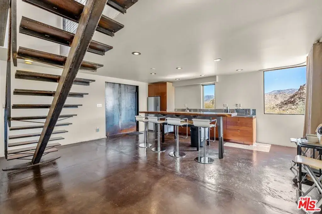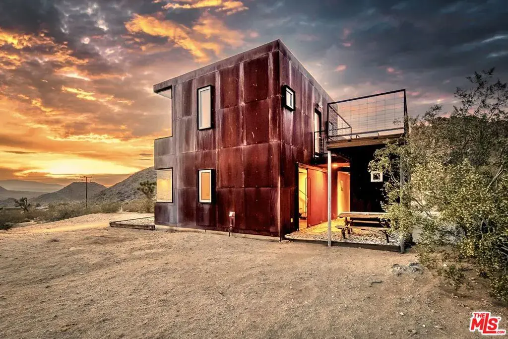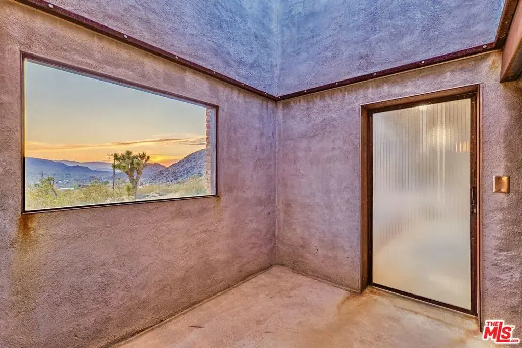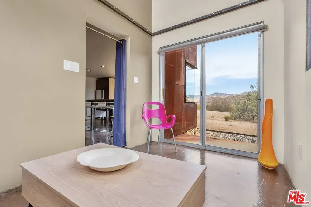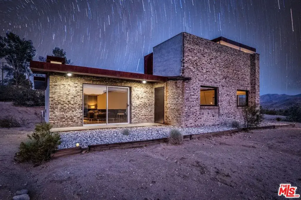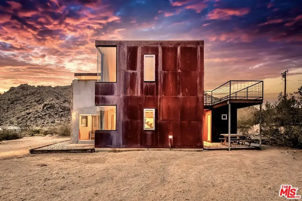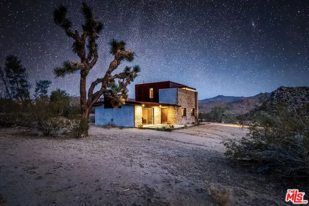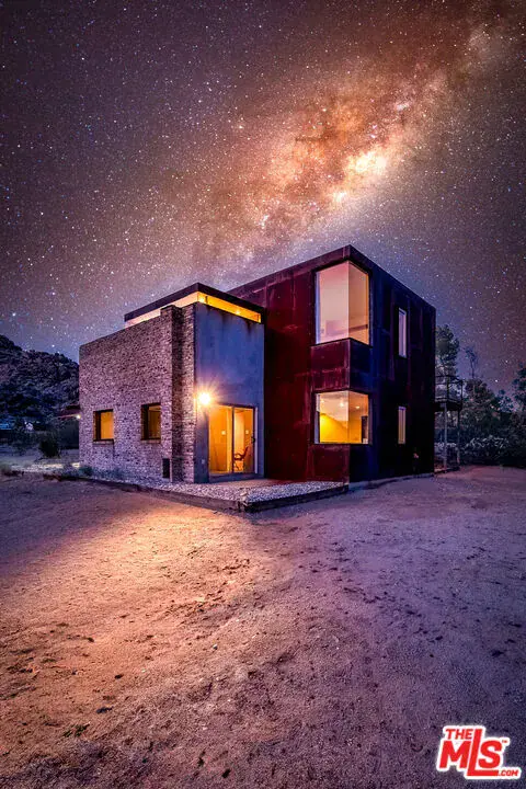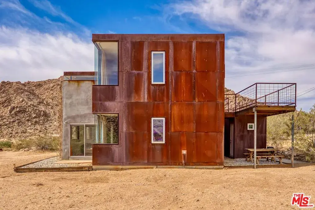 First time on the market: the prestigious Rotohouse, in the exclusive Monument Manor neighborhood of Joshua Tree, California. This organic architectural treasure is just a mile to the entrance of the popular Joshua Tree National Park, sitting between two large mounds of boulders enhanced by spectacular sunset vistas. House designed by world-class architect Michael Rotondi in 2007 and renovated over the course of 10 years. The main entrance is through a custom glass door entering a fun open-air atrium. The sophisticated floorplan incorporates 2 stories 1,845 sq feet, with 10ft. ceiling in the upstairs bedroom and 14ft. high opening on downstairs bedroom, three bathrooms, two in the master suite, his and hers. Characterized by simple forms and open volumes, the main addition is a cube 25 feet on each side. Adjacent to that is a long, narrow storage building with a roof deck pointing to a phenomenal spectacle of heaped rocks and sexy Pinto Mountains. Raw and handcrafted, the rugged exterior wrapped in corten steel set the trend for hi-desert buildings. Mondo central air eases extreme desert climate offering perfect comfort throughout. Every custom window frames extraordinary and enchanting wild desert scenery. The included adjoining 2.5 acre parcel is priceless on it’s own. It offers the perfect location for a potential second epic dwelling; perhaps on piers, so as to offer infinite vistas east and west. With this purchase you are not just buying a house but the true character that inspires the Joshua Tree nature and lifestyle.