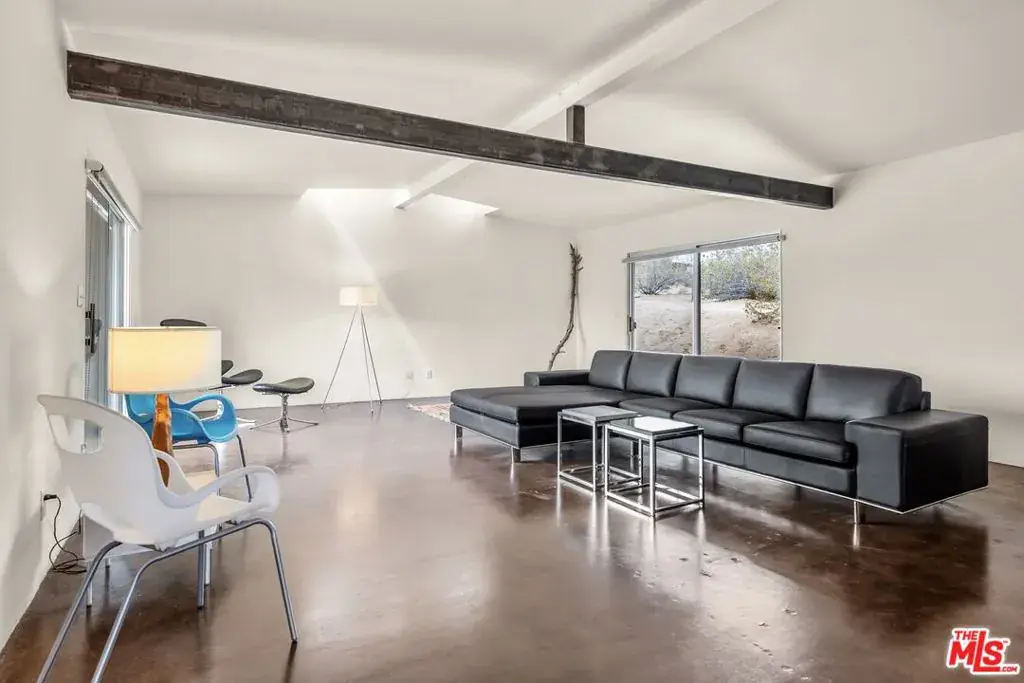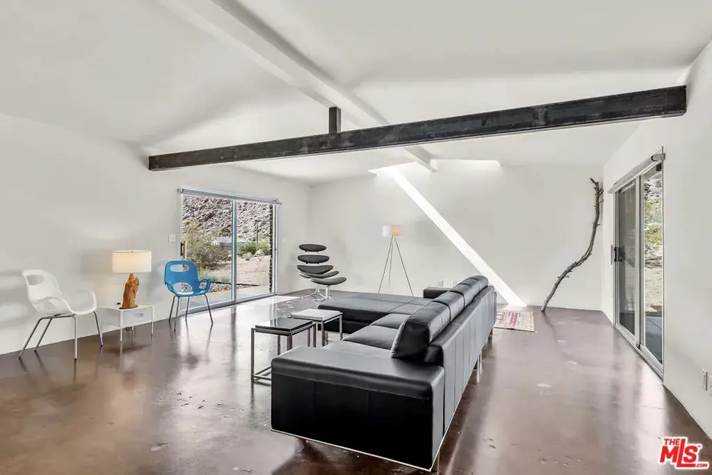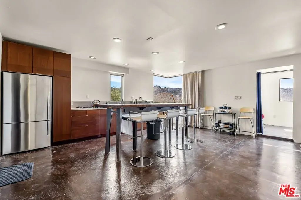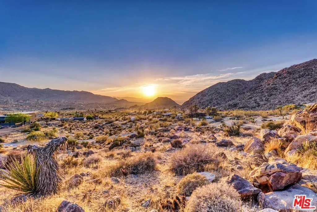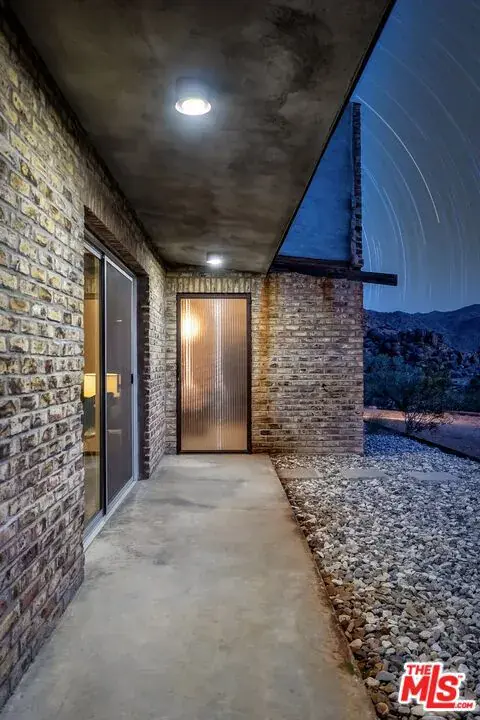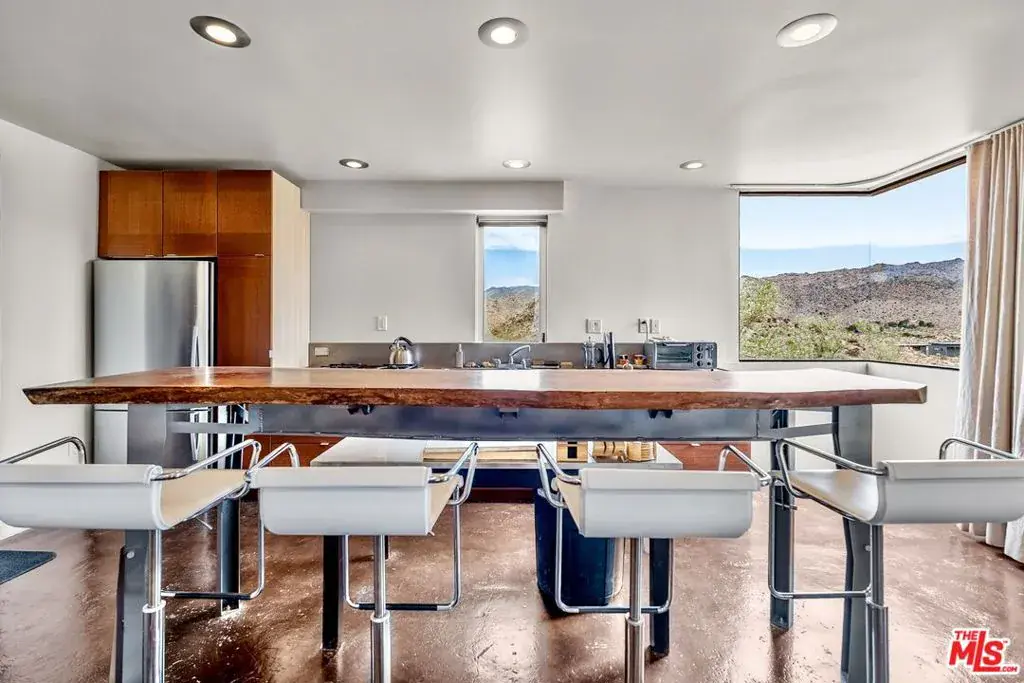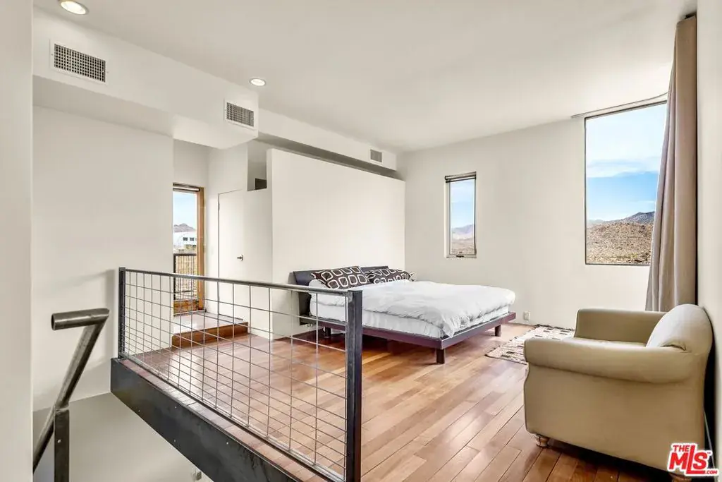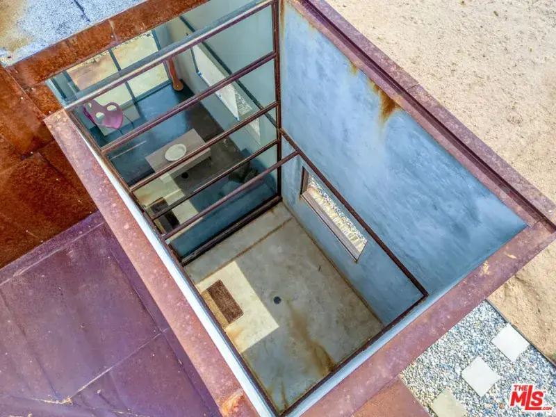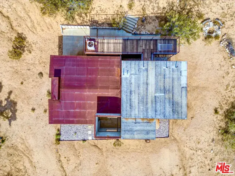 First time on the market: the prestigious Rotohouse, in the exclusive Monument Manor neighborhood of Joshua Tree, California. This organic architectural treasure is just a mile to the entrance of the popular Joshua Tree National Park, sitting between two large mounds of boulders enhanced by spectacular sunset vistas. House designed by world-class architect Michael Rotondi in 2007 and renovated over the course of 10 years. The main entrance is through a custom glass door entering a fun open-air atrium. The sophisticated floorplan incorporates 2 stories 1,845 sq feet, with 10ft. ceiling in the upstairs bedroom and 14ft. high opening on downstairs bedroom, three bathrooms, two in the master suite, his and hers. Characterized by simple forms and open volumes, the main addition is a cube 25 feet on each side. Adjacent to that is a long, narrow storage building with a roof deck pointing to a phenomenal spectacle of heaped rocks and sexy Pinto Mountains. Raw and handcrafted, the rugged exterior wrapped in corten steel set the trend for hi-desert buildings. Mondo central air eases extreme desert climate offering perfect comfort throughout. Every custom window frames extraordinary and enchanting wild desert scenery. The included adjoining 2.5 acre parcel is priceless on it’s own. It offers the perfect location for a potential second epic dwelling; perhaps on piers, so as to offer infinite vistas east and west. With this purchase you are not just buying a house but the true character that inspires the Joshua Tree nature and lifestyle.