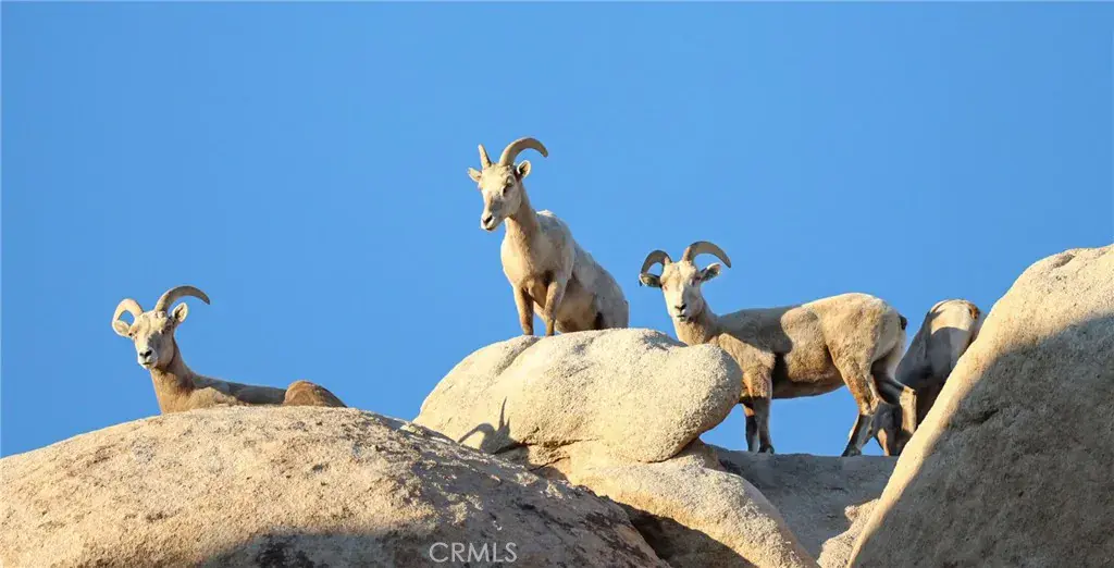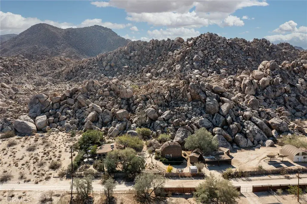 STAIRWAY TO HEAVEN: BOULDERS, BOULDERS, BOULDERS. Massive 10-Acre parcel that borders and is adjacent to Joshua Tree National Park. Hike from your own property straight into the Park – or better, camp in your own boulder retreat. Parcel is also adjacent to the Kellogg/Doolittle house – the most significant architectural home locally, which is built into the boulders and provides an example of future possibilities with this parcel. Property includes 3 separate living structures: a 2-bed/1-bath conventional home with a dining/living area that opens up to a boulder surrounded courtyard. A large 1-bed/1-bath geodesic dome with a loft bedroom and spacious living area, in addition to a second-floor deck to relax and enjoy nature. Finally, a modest 1-bed/1-bath cabin. Property is serviced by conventional electric and water (SCE & Joshua Basic Water District water meter) and septic tanks. For additional storage/workshop stands a Quonset hut, made from durable steel. A carport is built into the rocks. Paid solar. Wildlife flourishes on the property, including big horn sheep (all animal pictures were taken on the property). Few properties touch the National Park and even less are this large in size and this many rock outcroppings. One could lead private yoga retreats in your own private hidden valley, or meditate solo. Countless possibilities for a property as significant, profound and sublime as this extremely rare holding. PRICE REDUCTION
