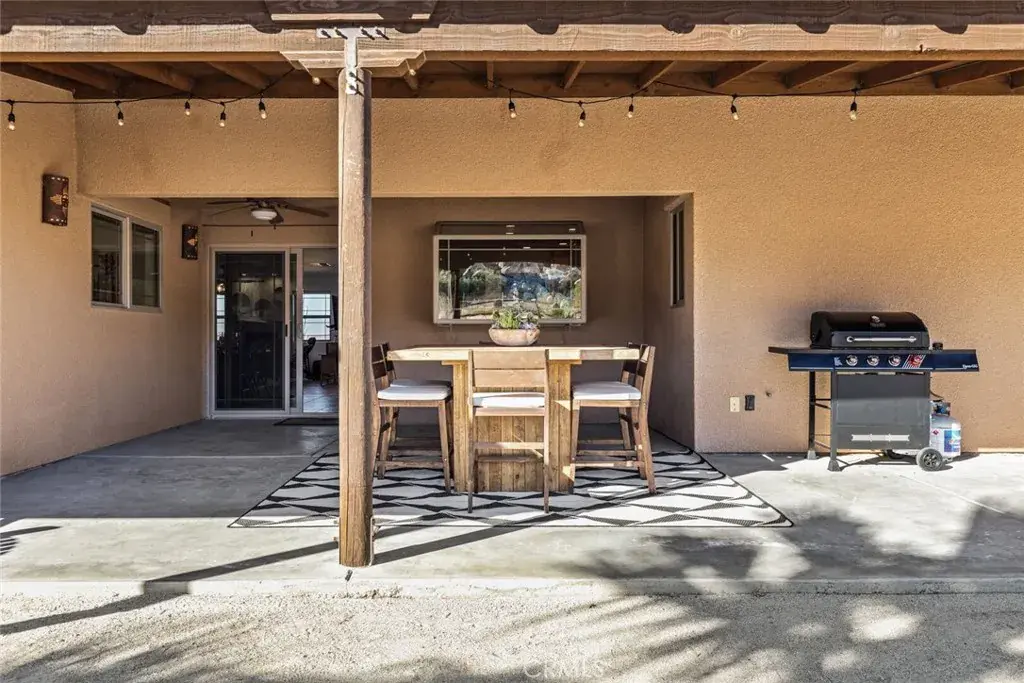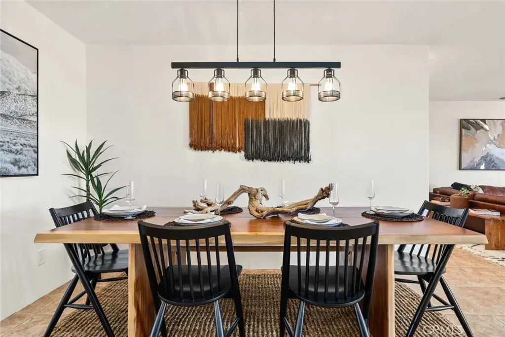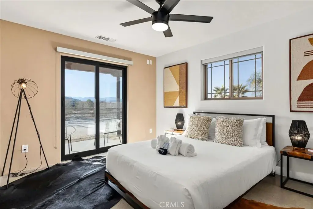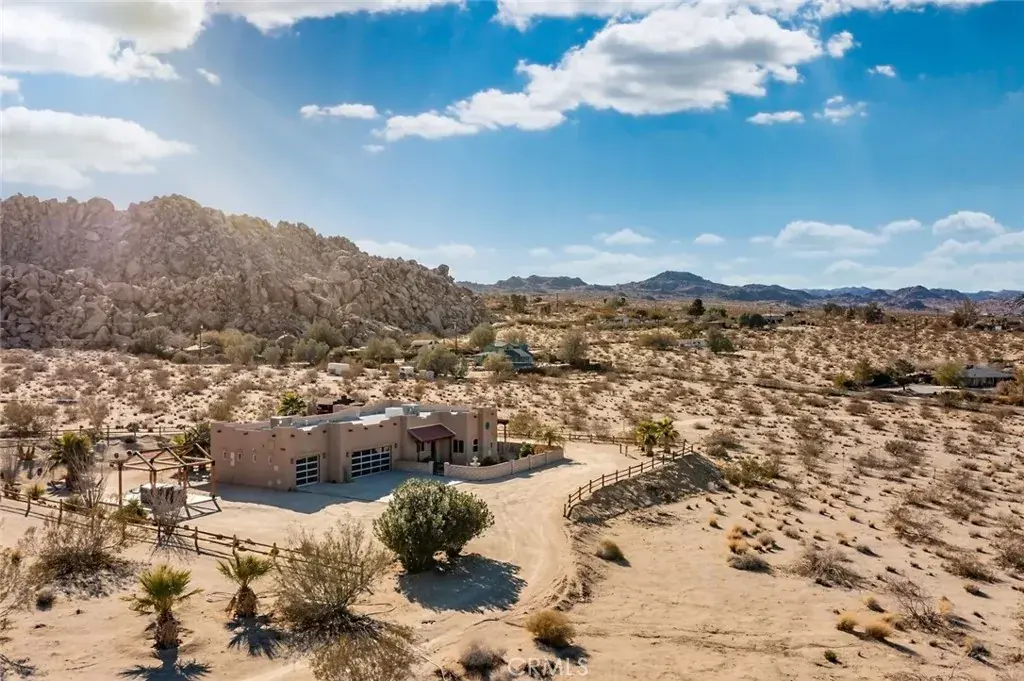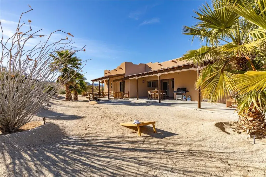 CASA MILLA: Tucked up near Joshua Tree National Park, this splendid property offers wilderness hikes from the backdoor and views of nearby boulder mountains from the back porch. Santa Fe style estate features panoramic views of the Park to the south, sweeping views of the ancient dry lakebed below to the north, and breathtaking sunsets over the mountains of Big Bear to the west. Spread out over 3 bedrooms, including a primary suite offers an ensuite bath, open living areas, in addition to a workspace, and private outdoor access. Active furnished, turnkey Airbnb. Management in place. Exterior includes a spa, firepit, BBQ, outdoor shower and two outdoor bathrooms with a double vanity, set against sprawling desert landscaped grounds. Ideal for large families, entourage, or guests, the home also features a large game room (pool table, TV and oversized games), as well as ample seating for indoor/outdoor dining. For those looking for a workcation, you’ll find 3 bedrooms perfectly outfitted with desks/work spaces. Located in the premier South Joshua Tree area and only minutes to downtown Joshua Tree. Access to Interstate-10 leading to LA and Palm Springs International Airport.