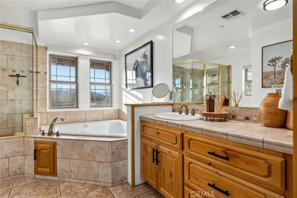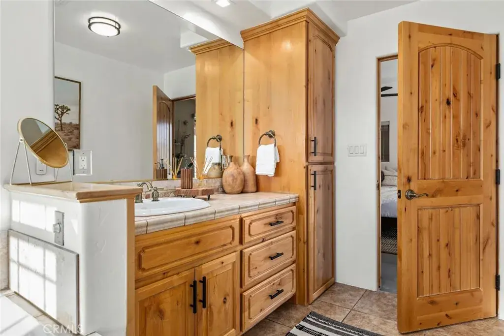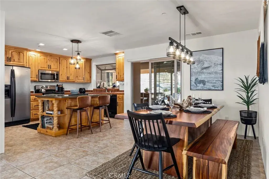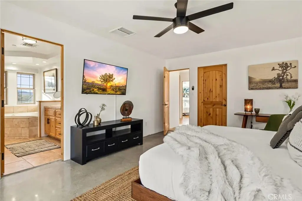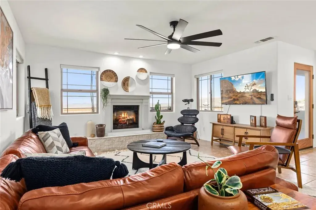 CASA MILLA: Tucked up near Joshua Tree National Park, this splendid property offers wilderness hikes from the backdoor and views of nearby boulder mountains from the back porch. Santa Fe style estate features panoramic views of the Park to the south, sweeping views of the ancient dry lakebed below to the north, and breathtaking sunsets over the mountains of Big Bear to the west. Spread out over 3 bedrooms, including a primary suite offers an ensuite bath, open living areas, in addition to a workspace, and private outdoor access. Active furnished, turnkey Airbnb. Management in place. Exterior includes a spa, firepit, BBQ, outdoor shower and two outdoor bathrooms with a double vanity, set against sprawling desert landscaped grounds. Ideal for large families, entourage, or guests, the home also features a large game room (pool table, TV and oversized games), as well as ample seating for indoor/outdoor dining. For those looking for a workcation, you’ll find 3 bedrooms perfectly outfitted with desks/work spaces. Located in the premier South Joshua Tree area and only minutes to downtown Joshua Tree. Access to Interstate-10 leading to LA and Palm Springs International Airport.