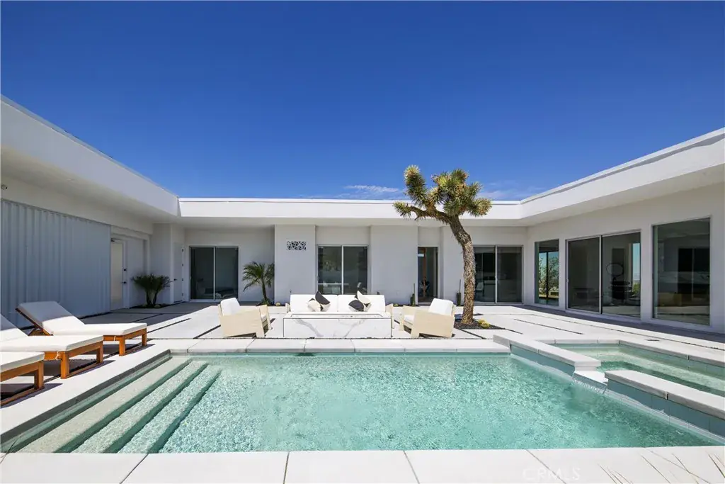 This standalone home features no shared walls, soaring high ceilings, expansive floor-to-ceiling windows that fill the space with natural light, and a clean modern aesthetic. Enjoy your own private pool and heated spa—a highly sought-after feature that only a small number of Joshua Tree properties offer.