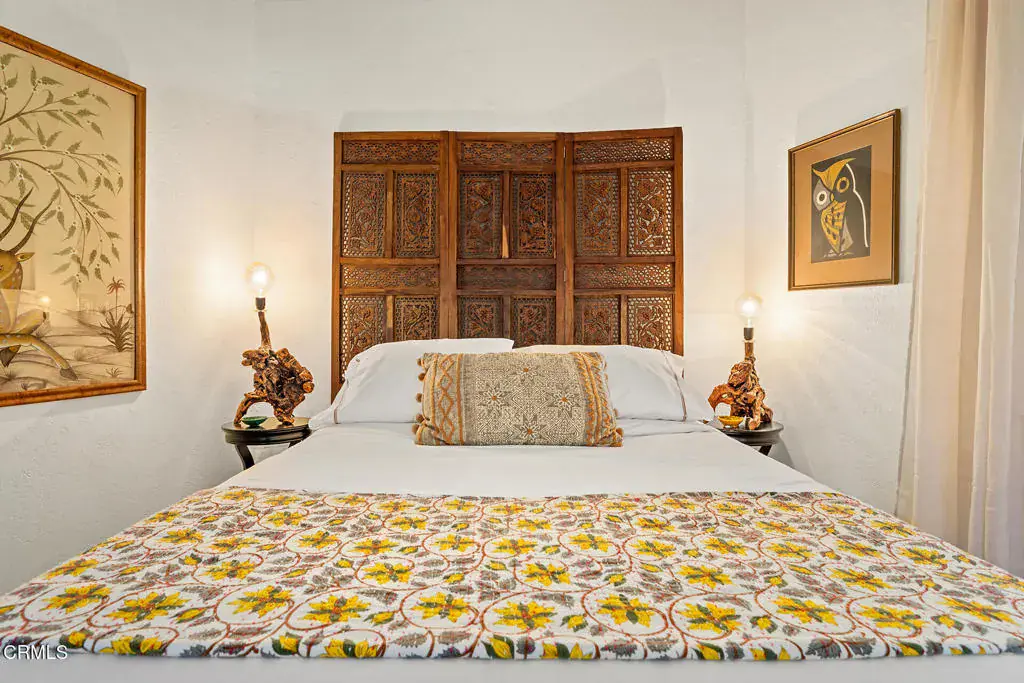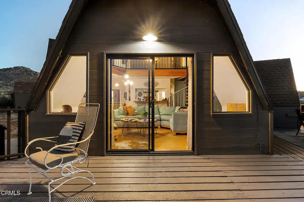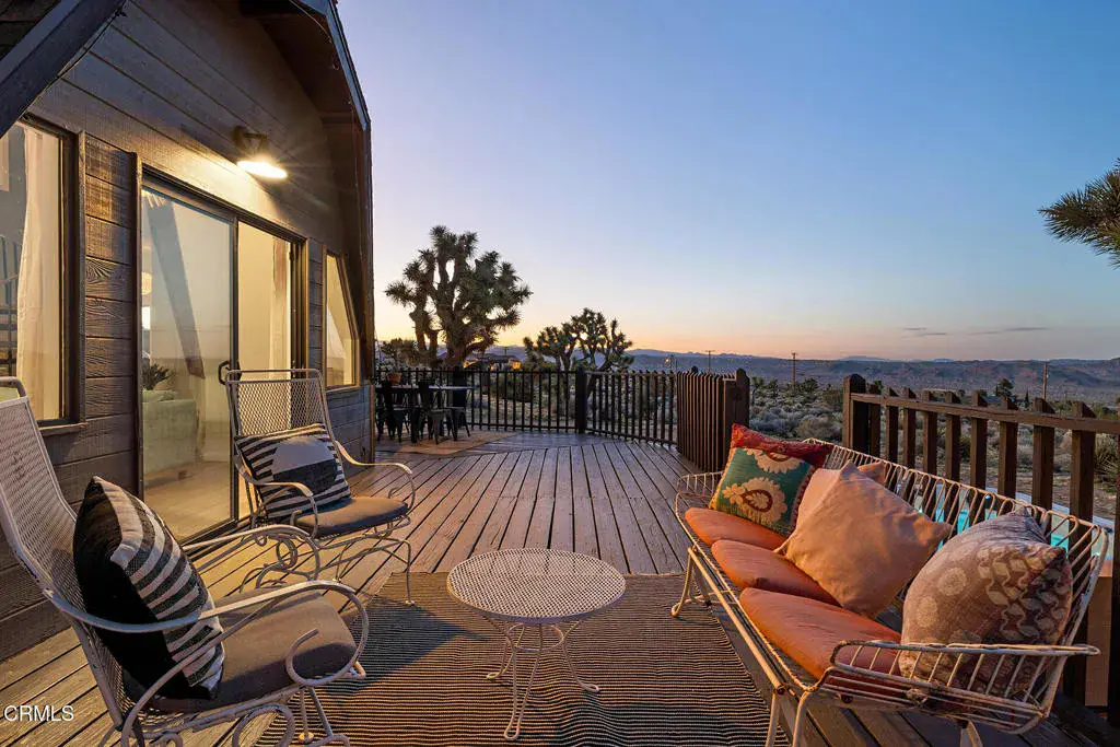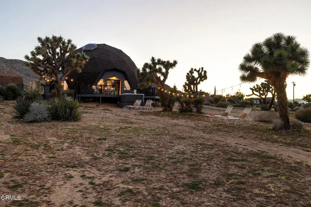 This Dwell-featured architectural jewel sits amidst Joshua Trees on over two acres in Upper Friendly Hills. 7677 Wilton Rd is a striking Buckminster Fuller-inspired geodesic dome with soaring ceilings, dramatic skylights, and stunning views of the surrounding mountains and desert. The lower level welcomes you with bamboo flooring and a bright, open layout that flows between the living, dining, and kitchen areas. The kitchen features colorful accents and stainless steel appliances, while the spacious primary suite offers a generous bedroom, large closets, and an en-suite bath. A spiral staircase leads to the lofted second level, where two additional bedrooms with unique triangular windows overlook the grounds. A modern bath showcases designer tile and dual sinks, and a flexible bonus room provides can serve as a fourth bedroom or central office space. Designed to capture natural light and frame the desert sky, the dome’s wooden hexagonal details and abundant skylights create a uniquely beautiful atmosphere. Outdoors, the property offers a wraparound deck for al fresco dining, a propane fire pit, and a hot tub perfect for stargazing. With thoughtful upgrades including a newer roof, windows and sliding doors, an updated AC condenser, refreshed baths, and a newer hot water heater, this extraordinary home blends architectural wonder with modern comfort. Whether envisioned as a primary residence, or a serene vacation retreat, this desert dome presents the rare opportunity to live inside a work of art.