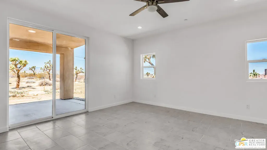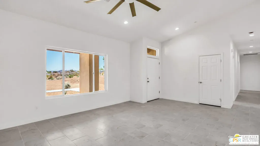 New Construction + Solar! Modern Desert Luxury in the Heart of Joshua Tree! Discover the perfect blend of contemporary design and desert serenity in this new 4-bedroom, 3-bath home spanning 2,566 sq ft. Set on nearly half an acre with breathtaking mountain views, this single-story residence offers an open-concept floor plan ideal for both relaxed living and stylish entertaining. Inside, the chef’s kitchen shines with granite countertops, walk-in pantry, and seamless flow to the spacious great room with a statement fireplace. Two luxurious primary suites one with dual showers and a walk-in closet create versatile living options for multi-generational families or guests. Sustainable and thoughtfully designed, the home features a solar system and energy-efficient finishes. The oversized 4-car finished garage, covered patio, and low-maintenance landscaping with timed irrigation make this a true turnkey retreat. Located minutes from Joshua Tree National Park, vibrant local shops, and dining, this property delivers the best of desert living modern comfort, spectacular scenery, and unmatched tranquility.