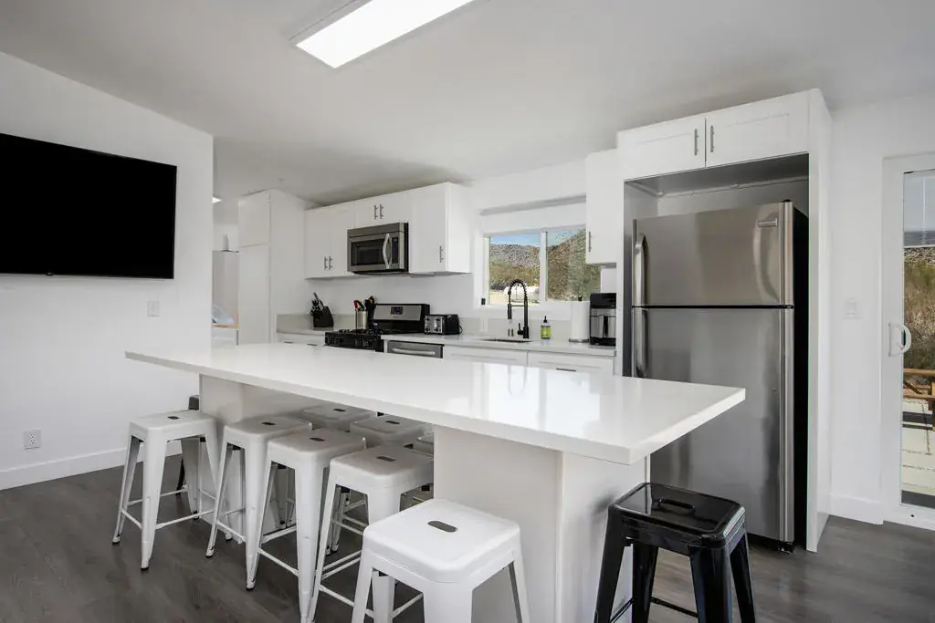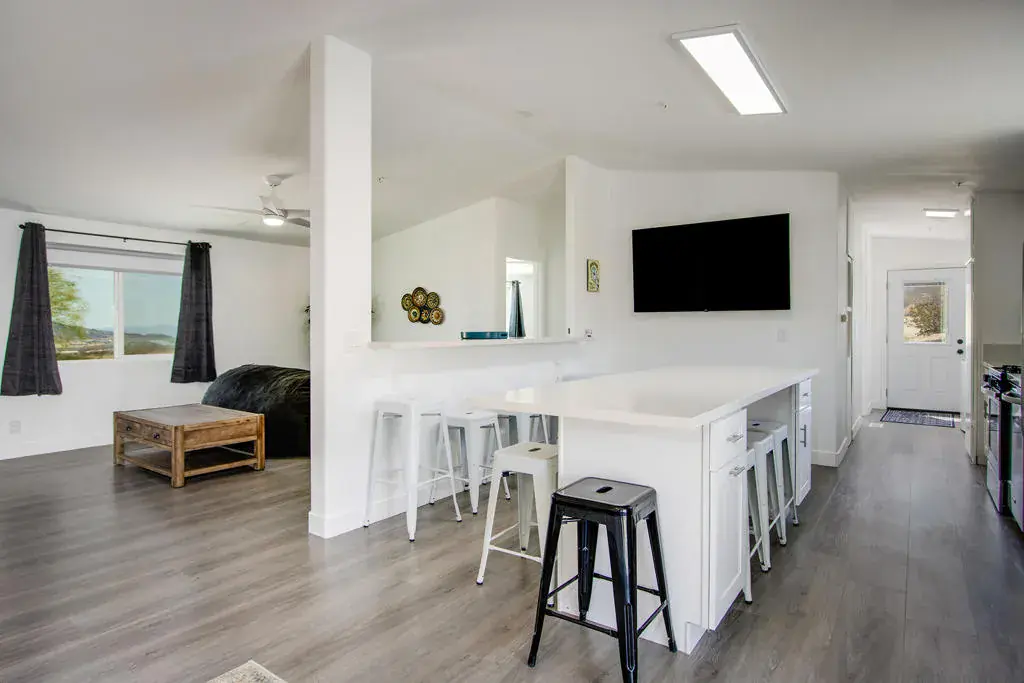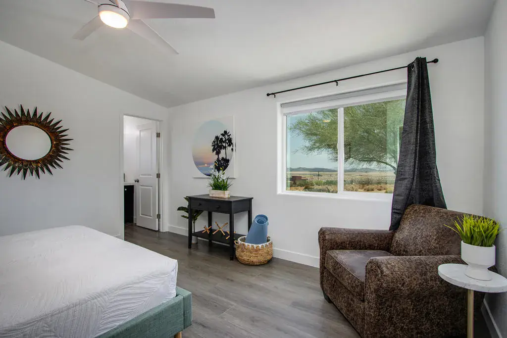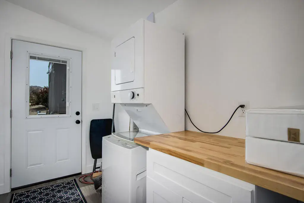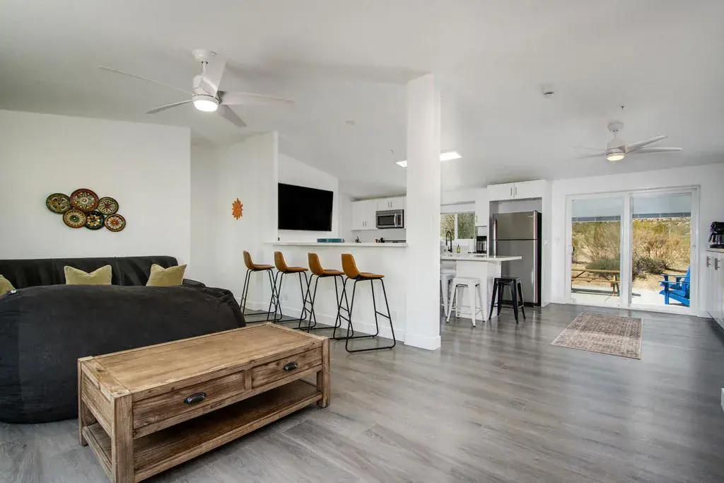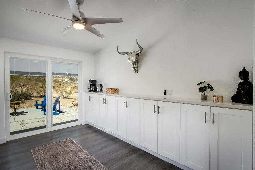 Designer remodeled home with skyline views! Set on 5+ acres of hillside in the highly desirable Panorama Heights neighborhood. Turn-key 3 bed 3 bath plus a large den that could be used as a 3rd bedroom with over 1,500sf. Pebble stone driveway with ample parking leads to the wraparound concrete patio and walkway to the front door. Living room with new floors, high sloped ceiling, recessed lighting, and gallery wall. Kitchen with new appliances, two breakfast bars with one as an island countertop. Stainless steel refrigerator, microwave, oven and cooktop, Abundant space with new cupboards and long counter tops. Additional dining area with built in cabinetry and glass sliders to the rear patio. Laundry room with double stack washer and dryer and butcher block counter. Large master bedroom with walk-in closet. Master bathroom with marble and glass shower. Guest bedroom with private bath. Backyard concrete patio enjoys picnic tables to enjoy dining alfresco with friends under the stars. STR permit approved. Inspiring views of the boulder studded mountains in the Joshua Tree National Monument. Captivating vistas for miles. Copper Mtn, Bunker Mtn, Mt Bartlette, the Bullion Mtns, and Mt San Gorgonio with snow capped peaks. Beautiful sunsets and shimmering city lights at night. Horse property. Less than 1000ft to the JTNM trails with gorgeous boulder gardens and canyons. Modern architectural new homes can be seen throughout the neighborhood. The high land value in Panorama Heights makes for sound investing. The county may allow for building another home and guest homes on this lot to expand your luxury compound. Short trip to organic restaurants, cafes, bars and boutiques in the JT Village. Close to the JTNM main gate where about 3 million tourists visit the park annually. 55 minutes to Palm Springs. Call for a showing today. (Tiny home on wheels & furniture is not included in the sale) Has 433a