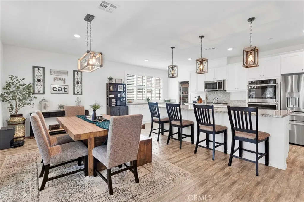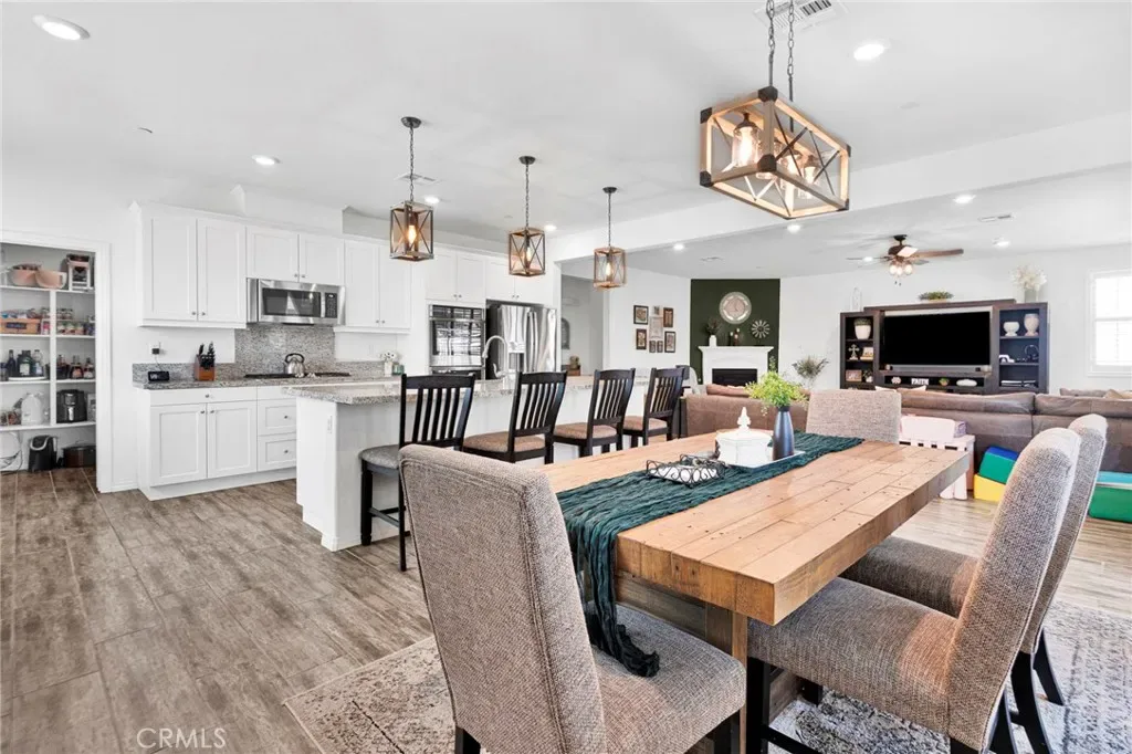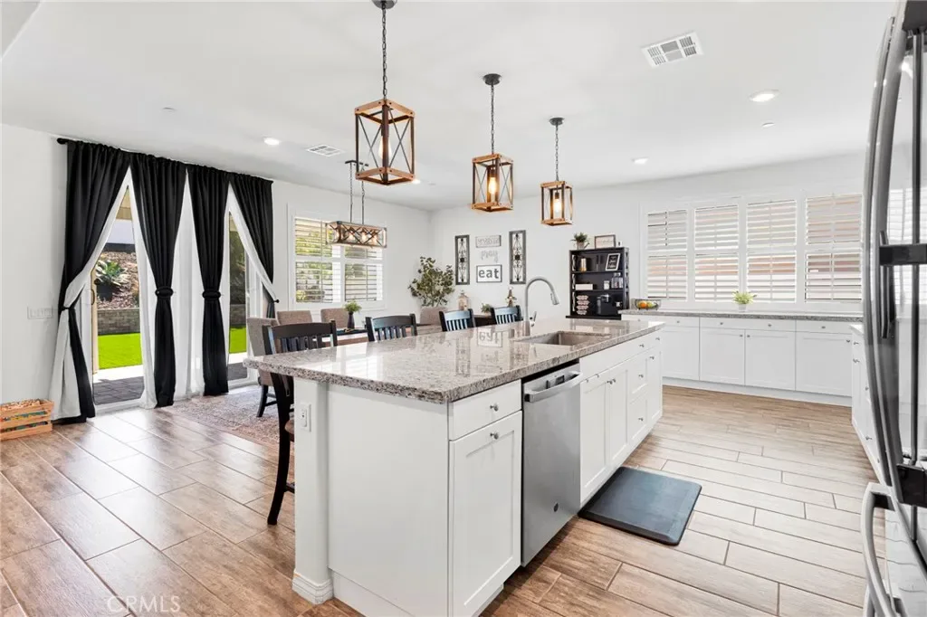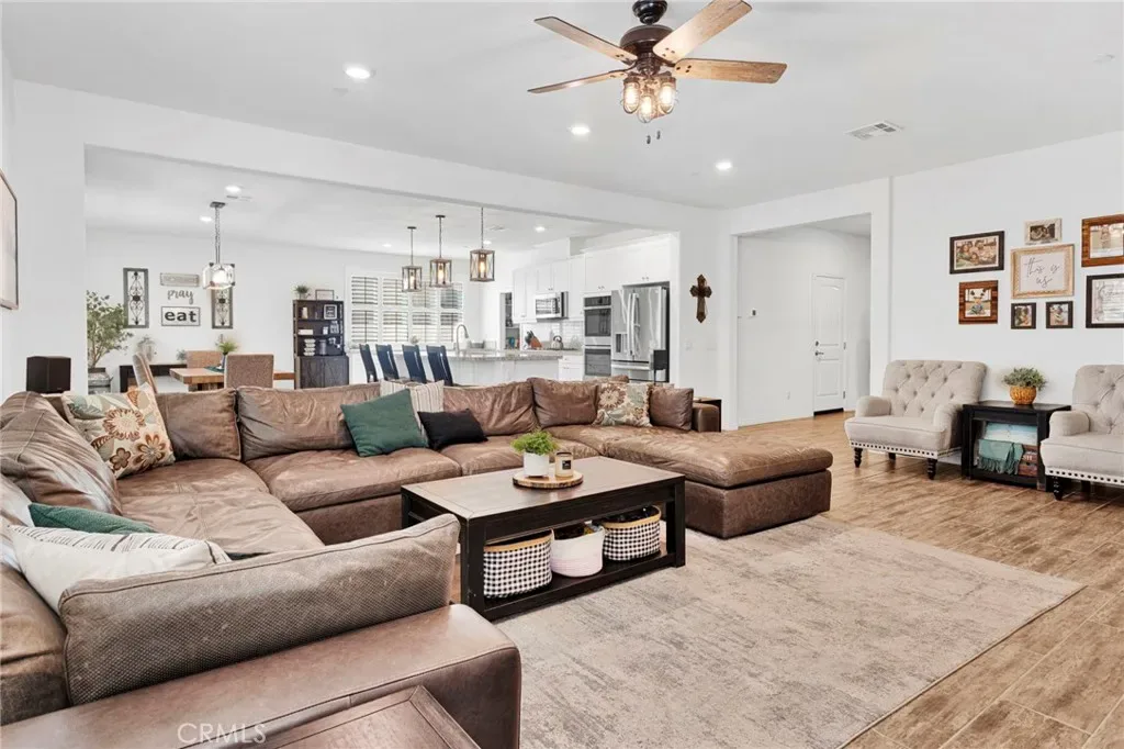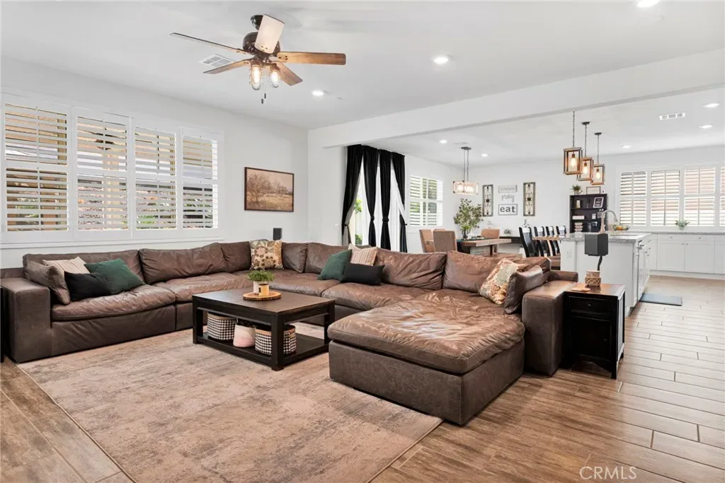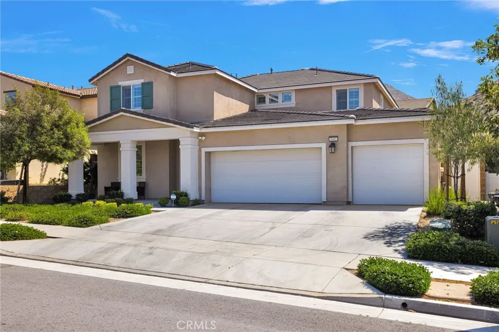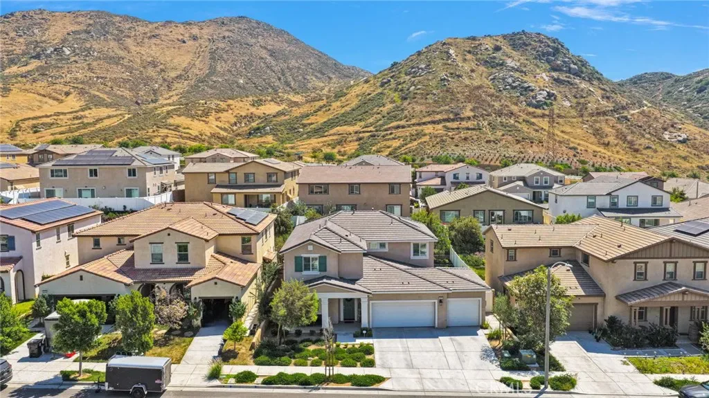 Welcome to this near-new, beautifully upgraded multi-generational home located in the desirable Shadow Rock community of Jurupa Valley! Boasting over 2,800 sq ft of living space, this thoughtfully designed home offers 5 bedrooms and 3 full bathrooms, including a spacious downstairs bedroom and full bath—perfect for guests or extended-family-style living. The home features an open-concept floor plan, with the kitchen overlooking the great room, creating the perfect space for entertaining and everyday living. The kitchen is truly the heart of the home, showcasing an oversized island, sleek white cabinetry, granite countertops, newer stainless steel appliances, and a large walk-in pantry with abundant storage. The great room features a cozy fireplace, setting the tone for warm gatherings and lasting memories. Throughout the downstairs and bathrooms, you’ll find neutral-colored designer wood-look plank tile flooring that is both stylish and easy to maintain, while the upstairs bedrooms, stairs, and loft feature durable, water-resistant carpet. Additional upgrades include custom lighting and ceiling fans, plantation shutters throughout, and a host of smart and efficiency features, such as a full interior and exterior security system, FLO by Moen smart water leak detection system, Rain Bird irrigation system with automatic rain shut-off, and Smart ovens controllable via phone. The home is equipped with a generator-ready electrical panel, including an inlet box and transfer switch, providing peace of mind and continued functionality during power outages.