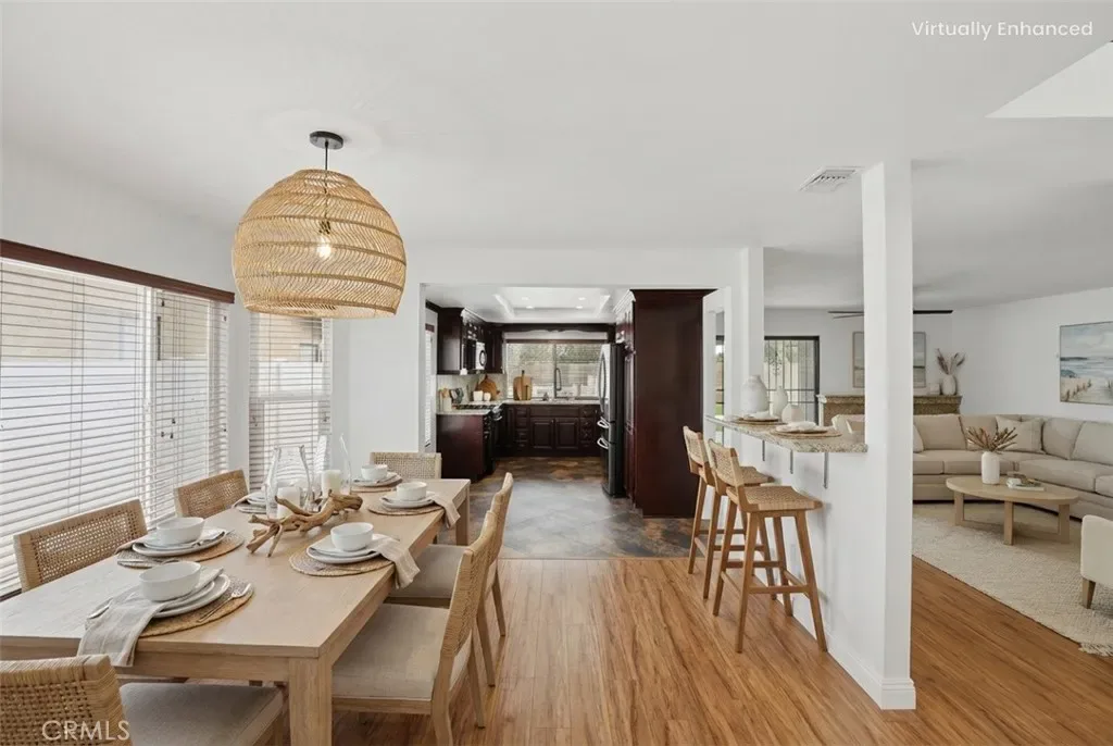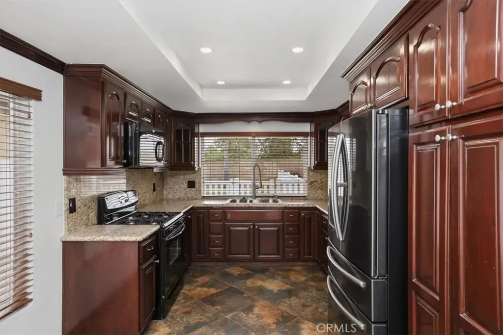The kitchen is both functional and stylish, featuring granite countertops, stainless steel appliances, rich cabinetry, ample storage, and generous counter space, all positioned to overlook the main living areas and backyard, making it perfect for both daily living and hosting.