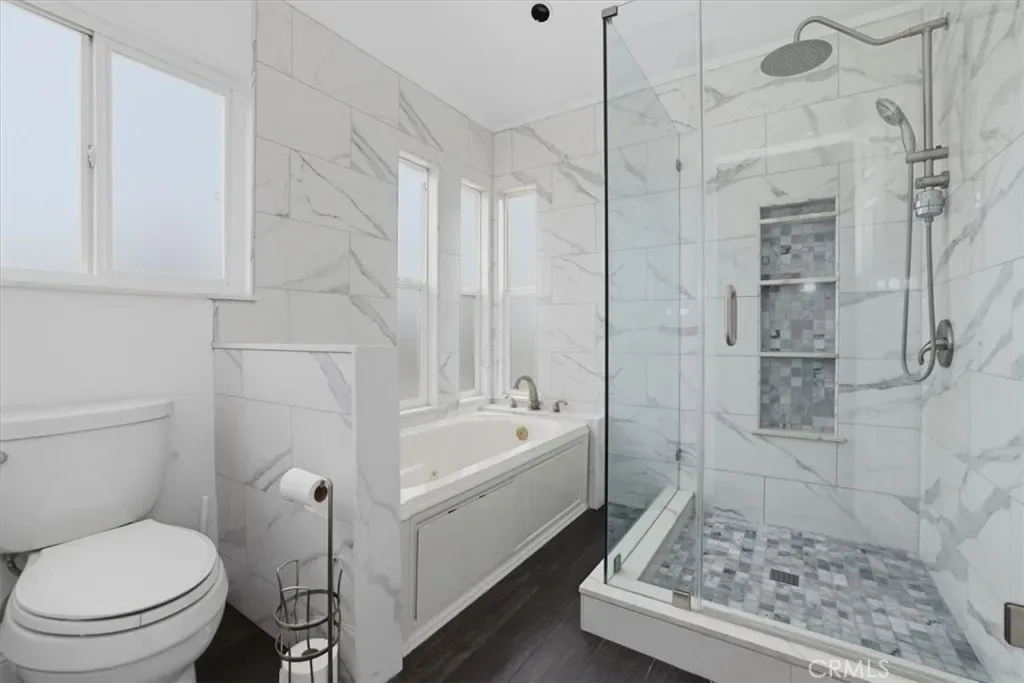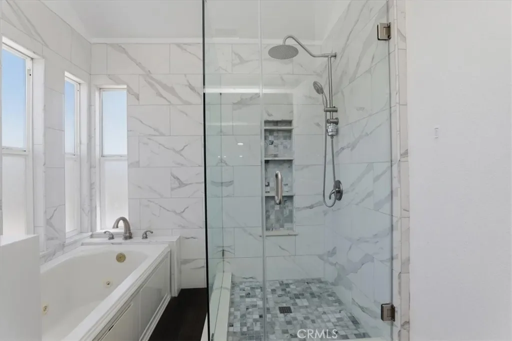 Upstairs, the primary suite offers a relaxing retreat with a walk-in closet and a beautifully updated bathroom complete with newer tile work, quartz countertops, upgraded fixtures, and modern finishes. Secondary bathrooms have also been tastefully updated with refreshed vanities, tile showers, and contemporary details, providing a cohesive feel throughout the home.