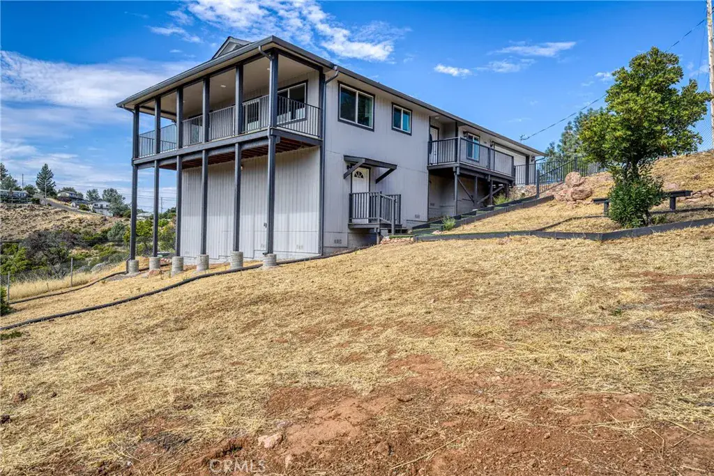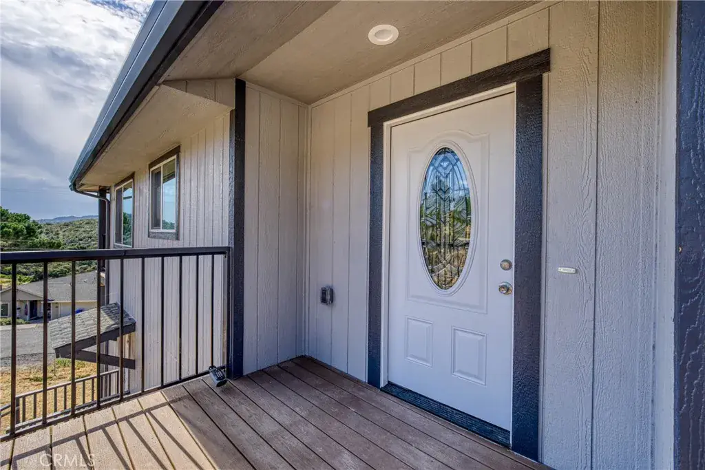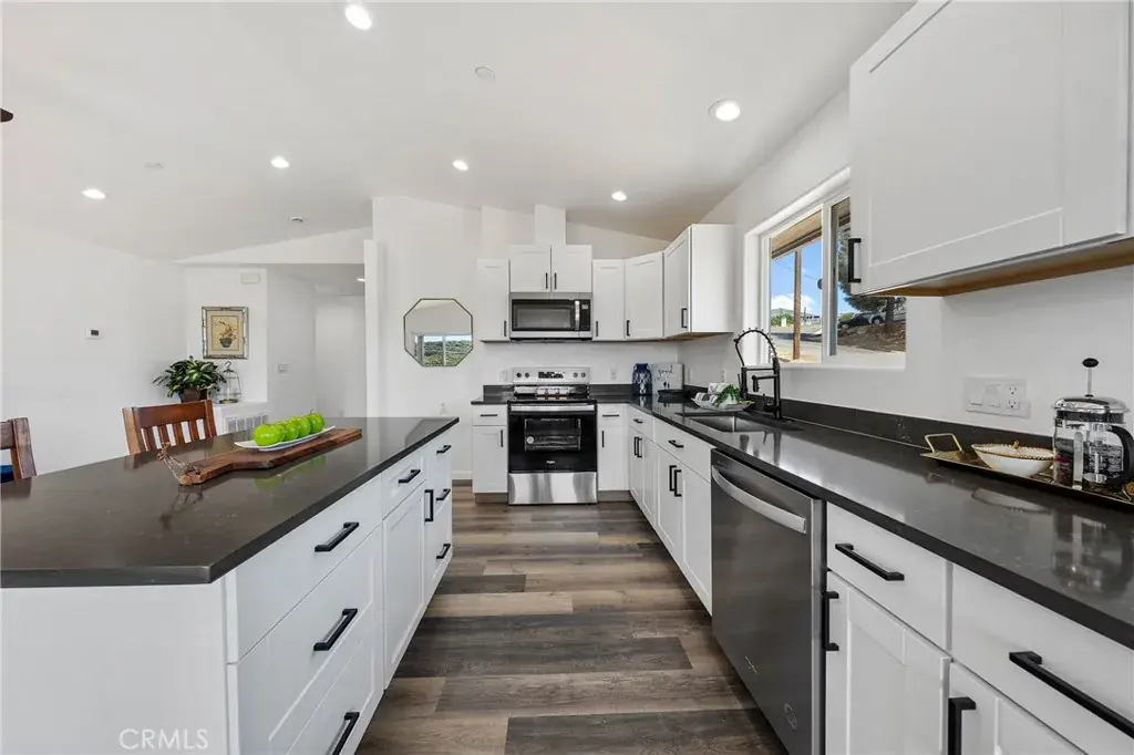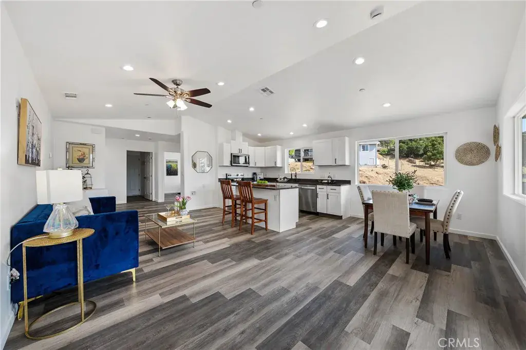 The home’s key features include a spacious, fenced yard, a level driveway, and an inviting front deck. The interior boasts an open floor plan with vinyl plank flooring, modern can lighting, sprinklers, and classic finishes. The great room has vaulted ceilings and is illuminated by numerous windows and seamlessly connects to the kitchen, which is equipped with a center island, stainless steel appliances, and quartz countertops. The adjacent dining room includes a slider door leading to a covered deck, ideal for outdoor living. The private primary bedroom offers an en-suite bath with double sink vanity and a tub/shower combo, with granite counter tops and is strategically separated from the other bedrooms. Bedroom 2 provides views of Mt. Konocti and is conveniently situated near the hall bath, also featuring a tub/shower combination. Additional amenities include an interior laundry room with direct access to an attached two-car garage. A third room would make a great home office or den. Efficiency features include solar and on demand water heater Mini split AC units and Propane heat. The seller is also offering an exciting expansion opportunity: the lower, undeveloped area of the home has received approval for a 670+ square foot bonus ADU studio unit, it can be completed to include a full kitchen and bath. For details on this current additional space and cost to expand this area, please contact the listing agent. This home is located in the Kelseyville Riviera, a desirable community situated just above Clearlake, offering convenient access to schools and shopping. Residents can enjoy year-round water sports and fishing from Californias largest natural lake.
