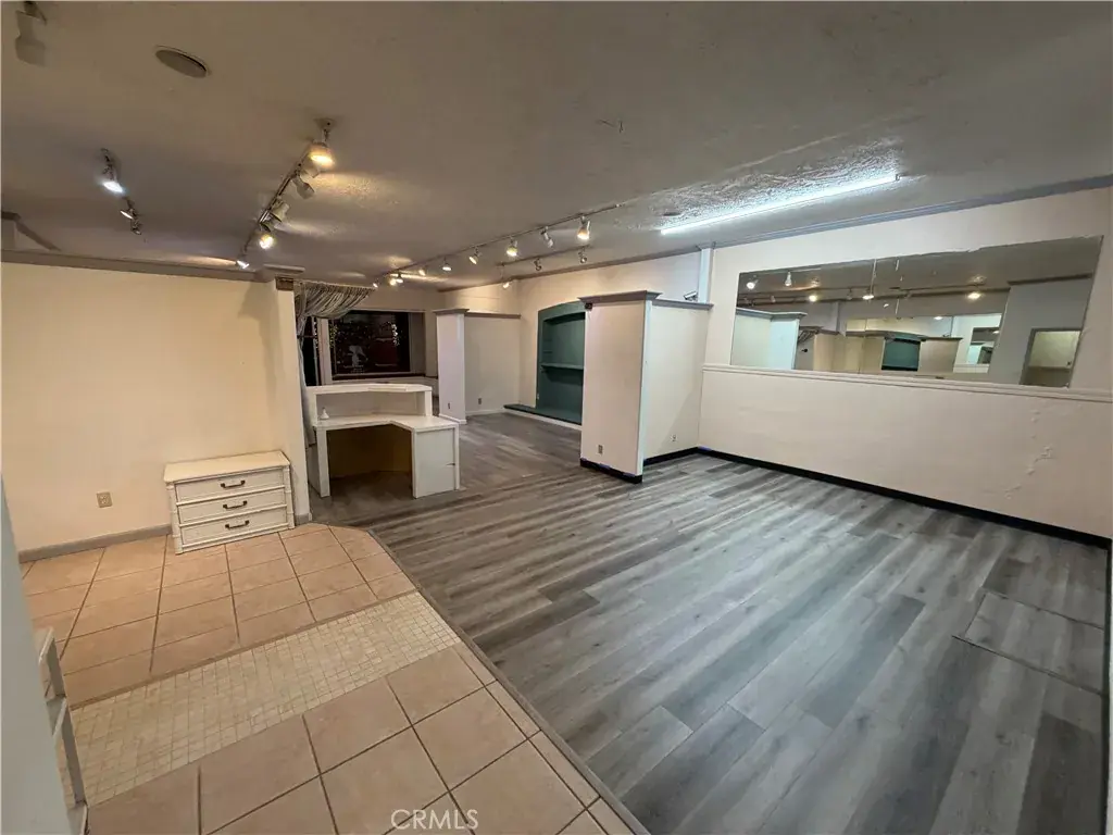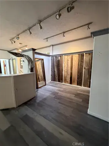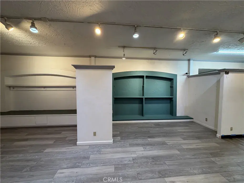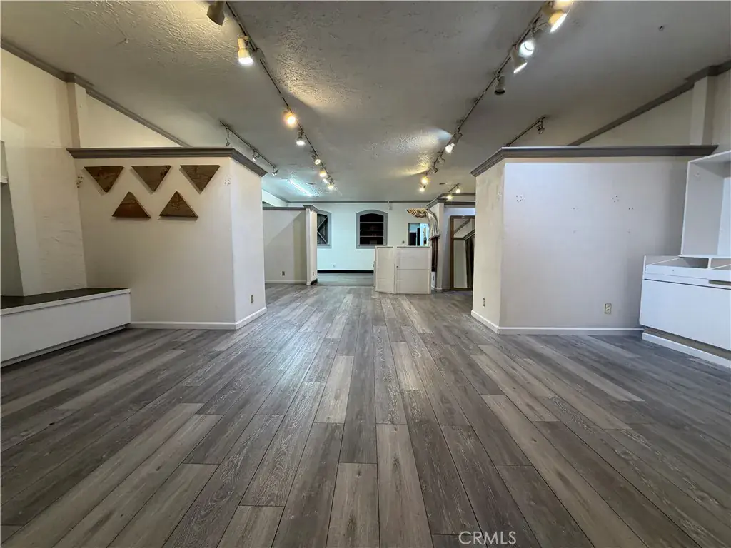 The space features an open layout with partial divider walls, multiple built in shelves, and new flooring extended all the way through to the back. There is a large additional space in the back along with 3 sinks, a kitchenette, and bathroom.