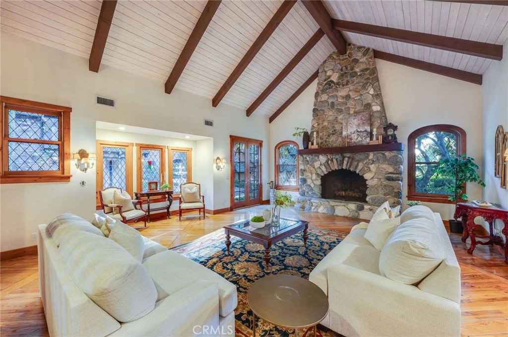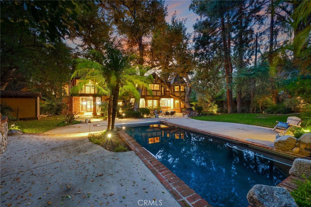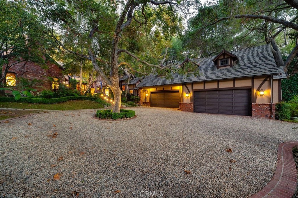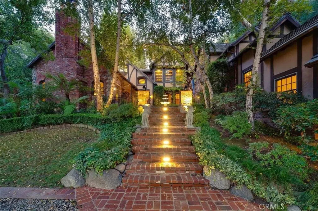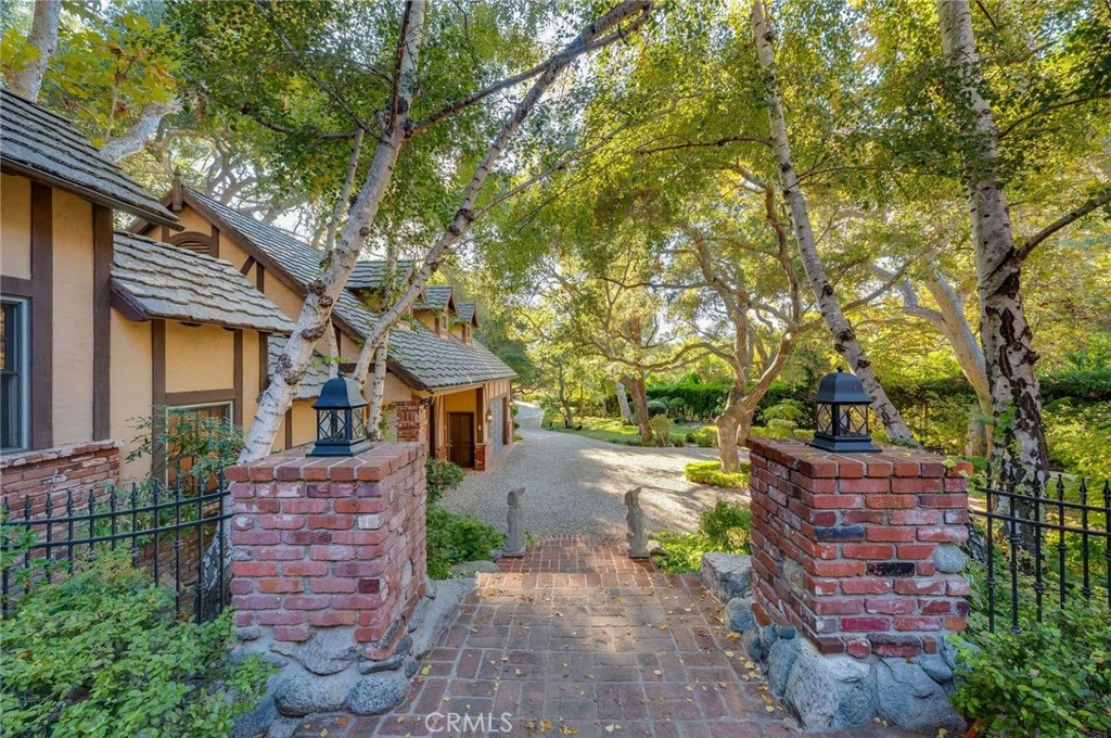 Nestled behind private gates on approximately two acres of beautifully manicured, park-like grounds, this stunning English Tudor estate offers 7,516 sq ft of timeless craftsmanship and refined elegance. From its classic timber-beamed and brick exterior, to its intricate interior woodwork, open vaulted ceilings with exposed wood beams, and stained and beveled glass windows, every detail reflects the character and grace of a bygone era—perfectly blended with modern luxury. A grand formal entry welcomes you into a two-story foyer that opens to an expansive floor plan featuring a step-down living room with a dramatic floor-to-ceiling stone fireplace, a large formal dining room, and multiple gathering spaces ideal for entertaining. The gourmet kitchen is complemented by granite countertops with custom cabinets, island with prep sink, a butler’s pantry with wet bar, walk-in pantry, and premium appliances including Sub-Zero, Thermador, and KitchenAid. Unique spaces such as a charming potting room, large craft room, upstairs bonus/play room, separate office/library, and a game room with pool table add character and versatility. There is truly plenty of space for everyone!