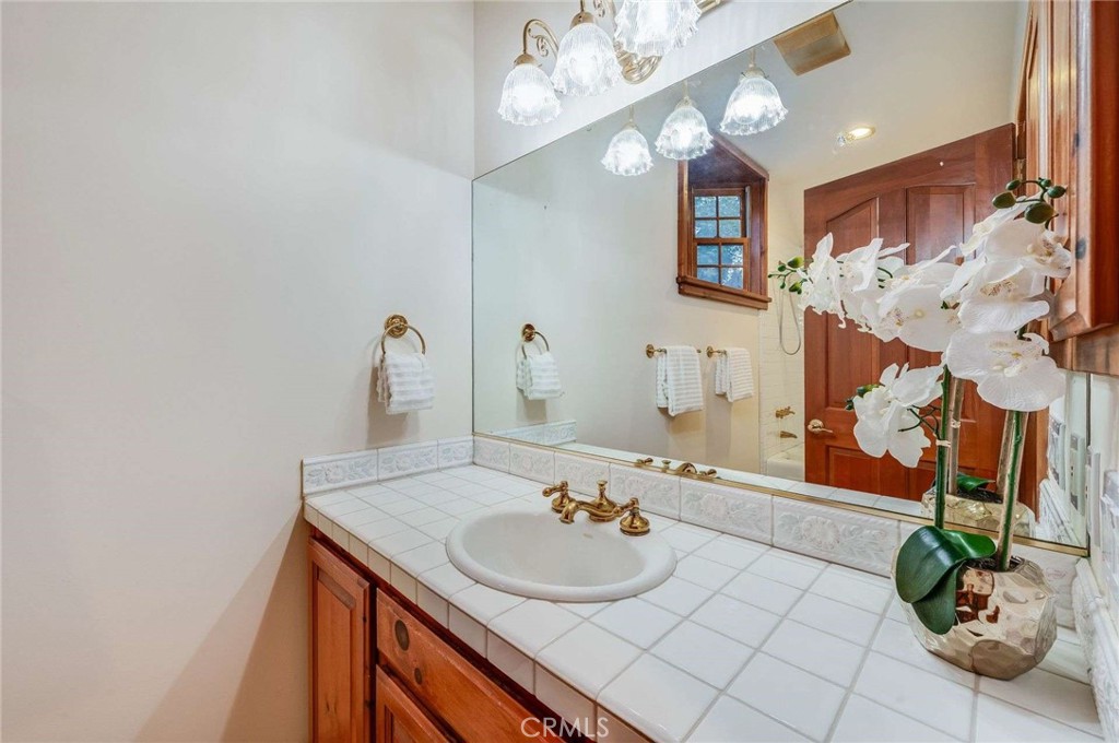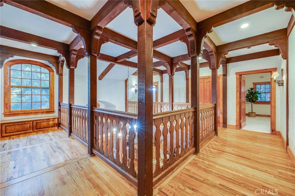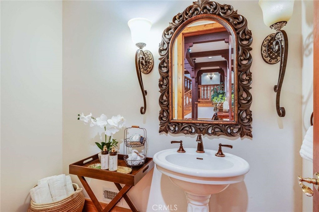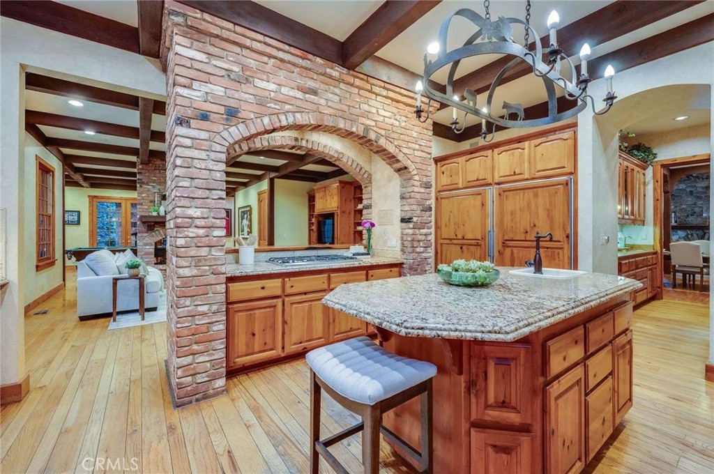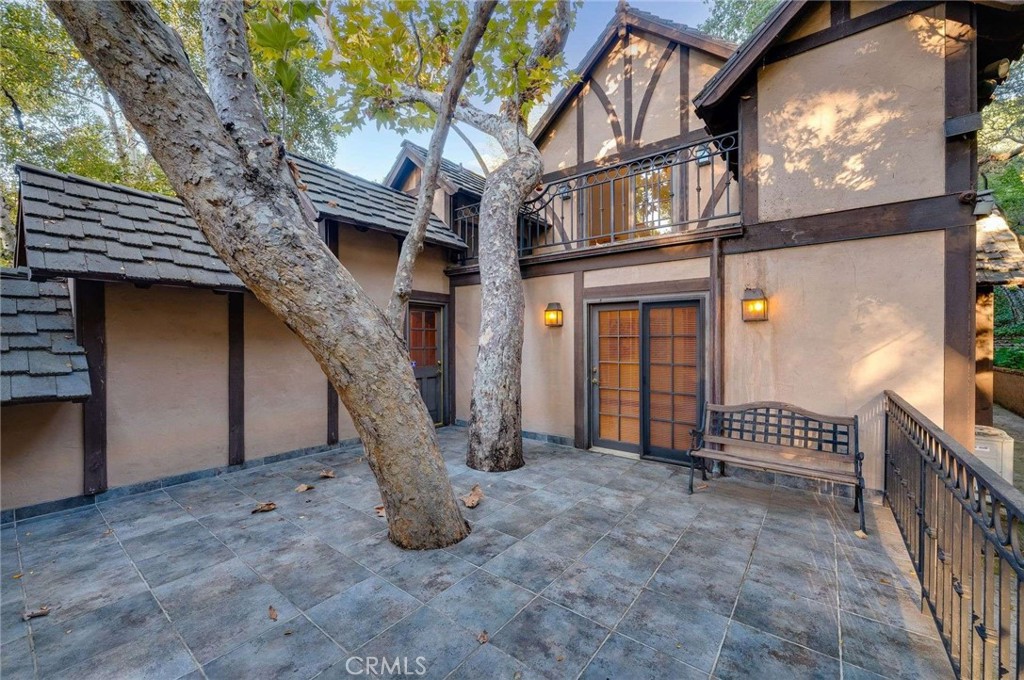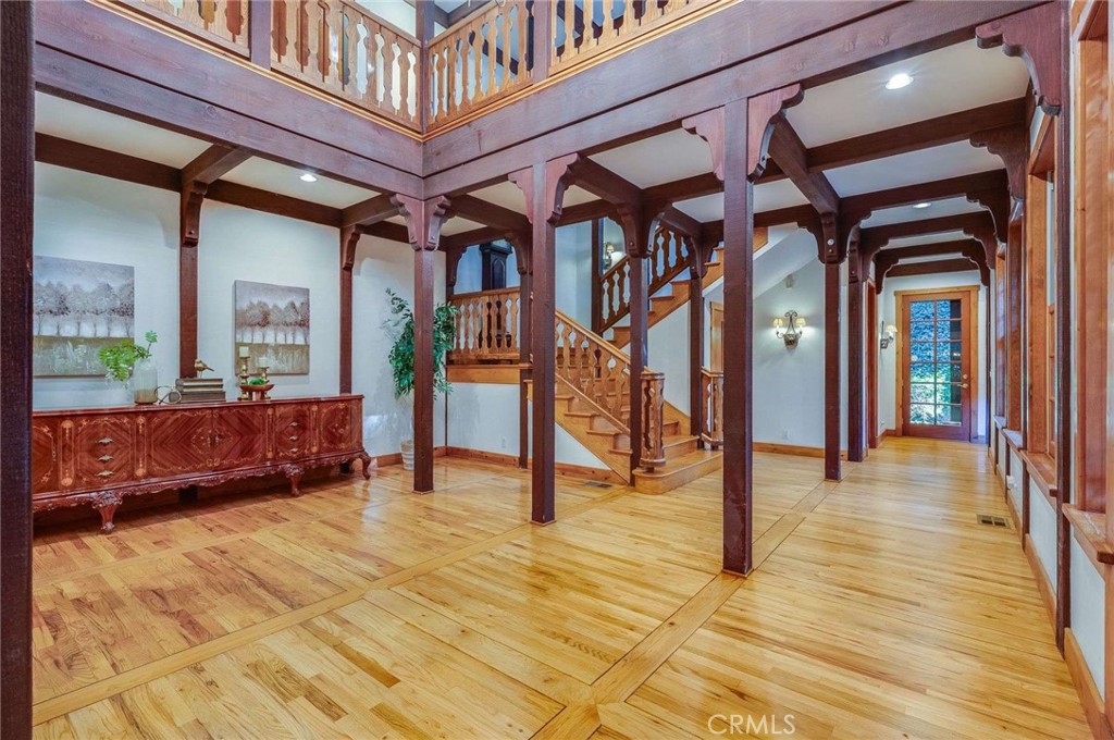 Nestled behind private gates on approximately two acres of beautifully manicured, park-like grounds, this stunning English Tudor estate offers 7,516 sq ft of timeless craftsmanship and refined elegance. From its classic timber-beamed and brick exterior, to its intricate interior woodwork, open vaulted ceilings with exposed wood beams, and stained and beveled glass windows, every detail reflects the character and grace of a bygone era—perfectly blended with modern luxury. A grand formal entry welcomes you into a two-story foyer that opens to an expansive floor plan featuring a step-down living room with a dramatic floor-to-ceiling stone fireplace, a large formal dining room, and multiple gathering spaces ideal for entertaining. The gourmet kitchen is complemented by granite countertops with custom cabinets, island with prep sink, a butler’s pantry with wet bar, walk-in pantry, and premium appliances including Sub-Zero, Thermador, and KitchenAid. Unique spaces such as a charming potting room, large craft room, upstairs bonus/play room, separate office/library, and a game room with pool table add character and versatility. There is truly plenty of space for everyone!
