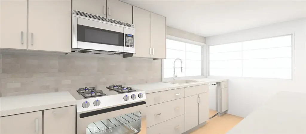 European white cabinets on order & ready to install. On call, the finalization of a totally remodeled kitchen with new gleaming stainless steel appliances. The family will enjoy a seat at the island harassing mom while doing homework.