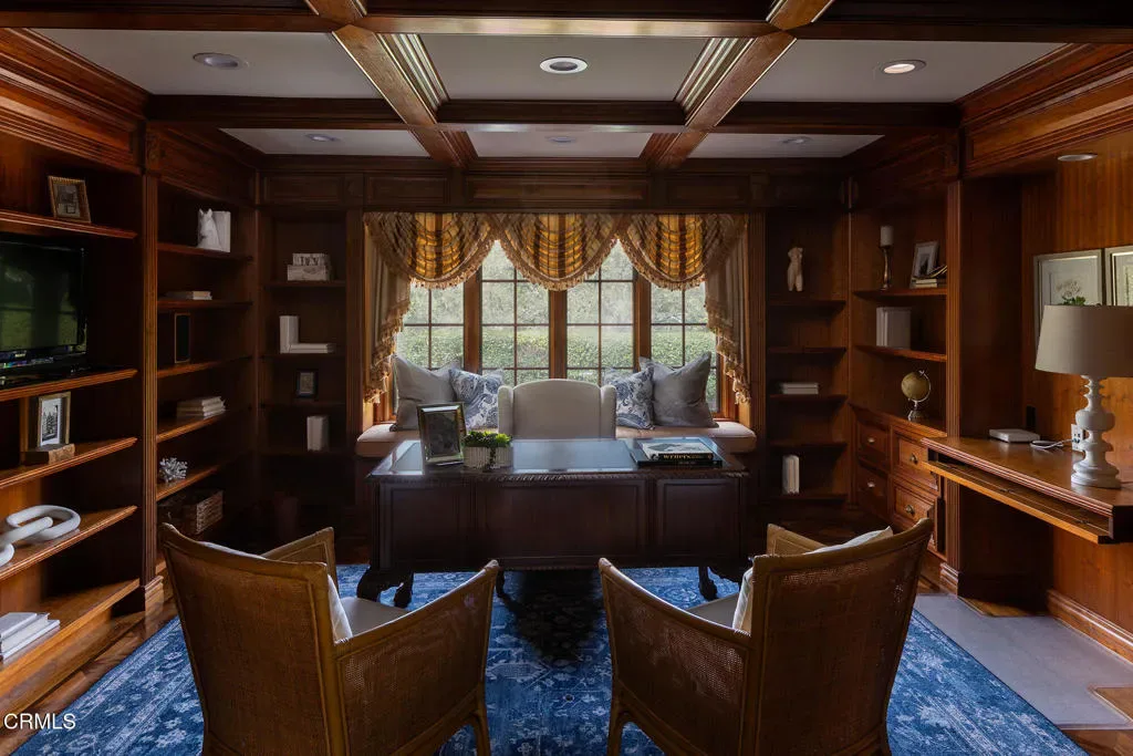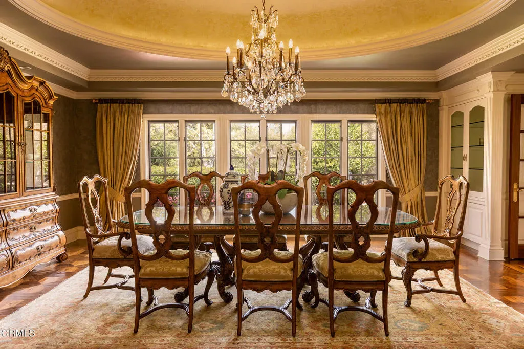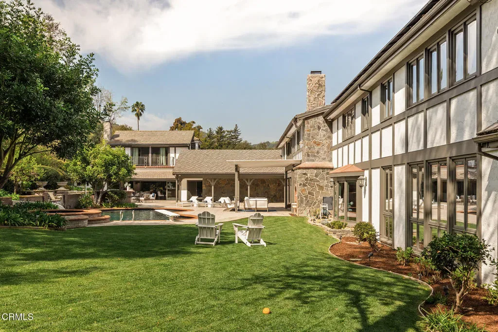 Measured at over 12,000 square feet, this magnificent gated estate offers exceptional privacy, scale and luxury amenities on a nearly one acre parcel of beautifully landscaped grounds in the coveted Flintridge enclave of La Canada. The highlights of this grand custom property include a semi-attached guest house, indoor pool and wellness pavilion, expansive outdoor entertaining areas and additional pool that seamlessly blends everyday living with large scale hosting.A dramatic double height formal entry greets guests with mahogany double doors, custom carved mouldings and an opulent chandelier. Oak parquet flooring leads to the stately formal dining room with domed ceiling and illuminated built-in cabinetry providing an elegant setting for entertaining. Gracious step-down living room, anchored by an ornate carved wood and stone fireplace is framed by windows overlooking the picturesque backyard, gardens and outdoor pool. Media room with projector and viewing screen, fireplace and bar creates an ideal setting for private screenings. The executive library offers a quiet retreat with custom walnut bookcases and window banquette. Expansive eat-in kitchen with statement fireplace, custom cabinetry, generous preparation and storage space, center island, walk-in pantries and a full complement of premium chef’s appliances. Butler’s pantry with prep sink and temperature controlled walk-in wine storage. Adjacent service spaces, including laundry and housekeeper’s quarters.Remarkable wellness pavilion with floor to ceiling windows includes an indoor ozone heated lap pool, gym with mirrored wall, sauna, changing room and bath. Upstairs, the spacious primary suite is a private retreat with fireplace, balcony, beverage bar, dual bath and dressing wings; domed sitting turret with built-in shelving and views of the San Gabriel Mountains. Opposite are four additional bedroom suites, that all include custom bathrooms and walk-in closets. The adjoining office and a turret domed meeting space offer ideal accommodations for work or study.The semi-attached guest house enjoys its own private entrance and includes a living room with fireplace and wall of sliding glass to the backyard. Upstairs bedroom suite offers balcony views of the backyard, walk-in closet and substantial bath.Designed for recreation and entertaining, the outdoor grounds feature mature landscaping, playground, short game practice green, heated pool and spa and four-car garage.