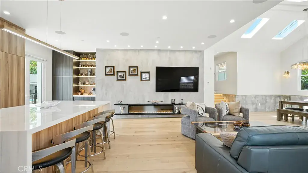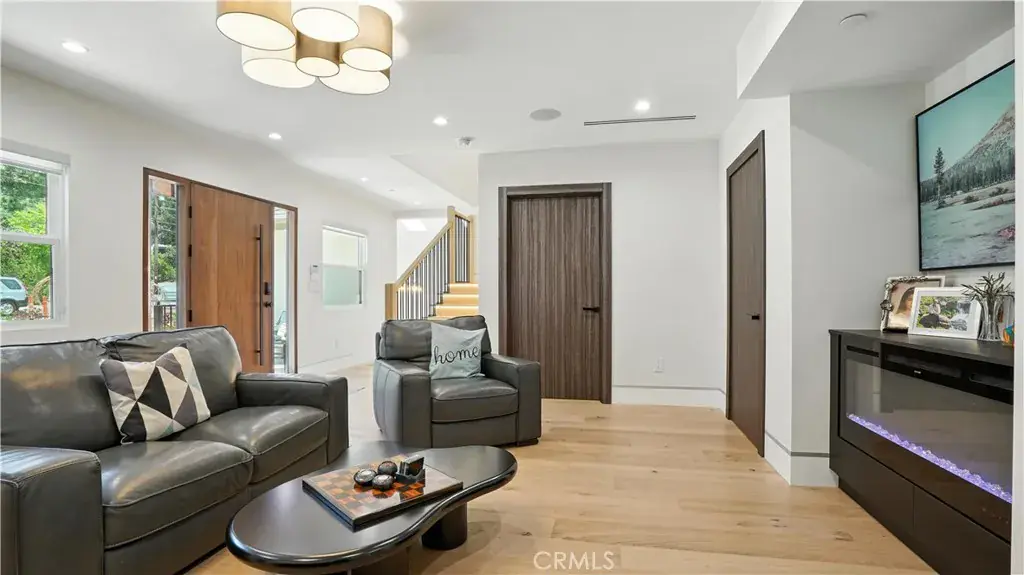 Step inside to an open-concept living and dining area that flows into a custom chef’s kitchen, featuring a large center island, premium stove, custom-built cabinets, and a sleek hidden-panel refrigerator. Elegant electric fireplaces in both the living and family rooms create warmth and ambiance throughout.