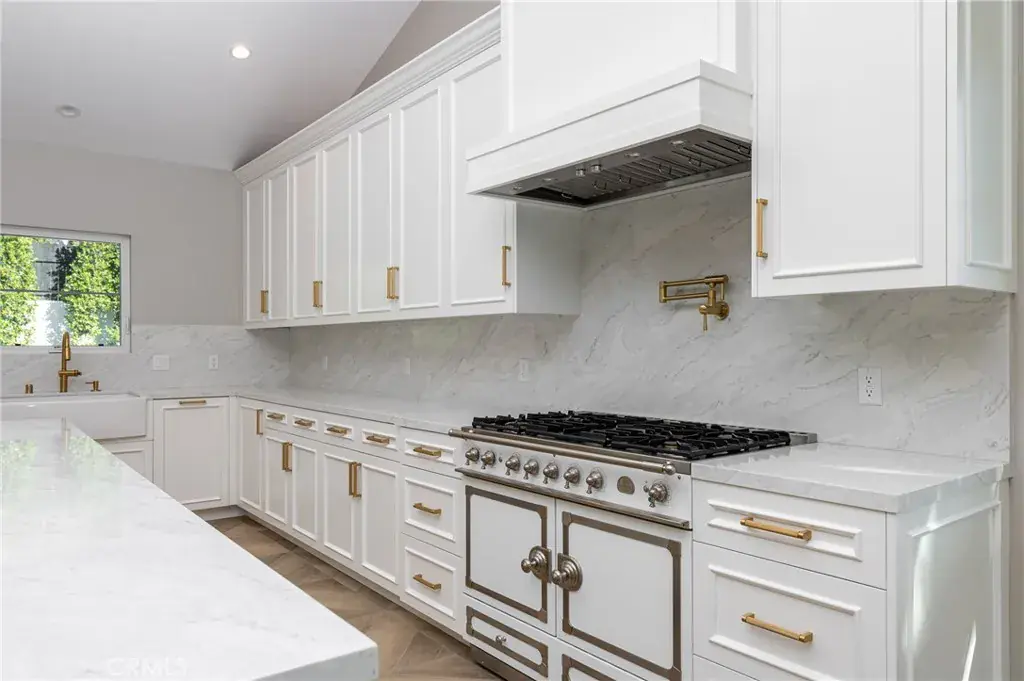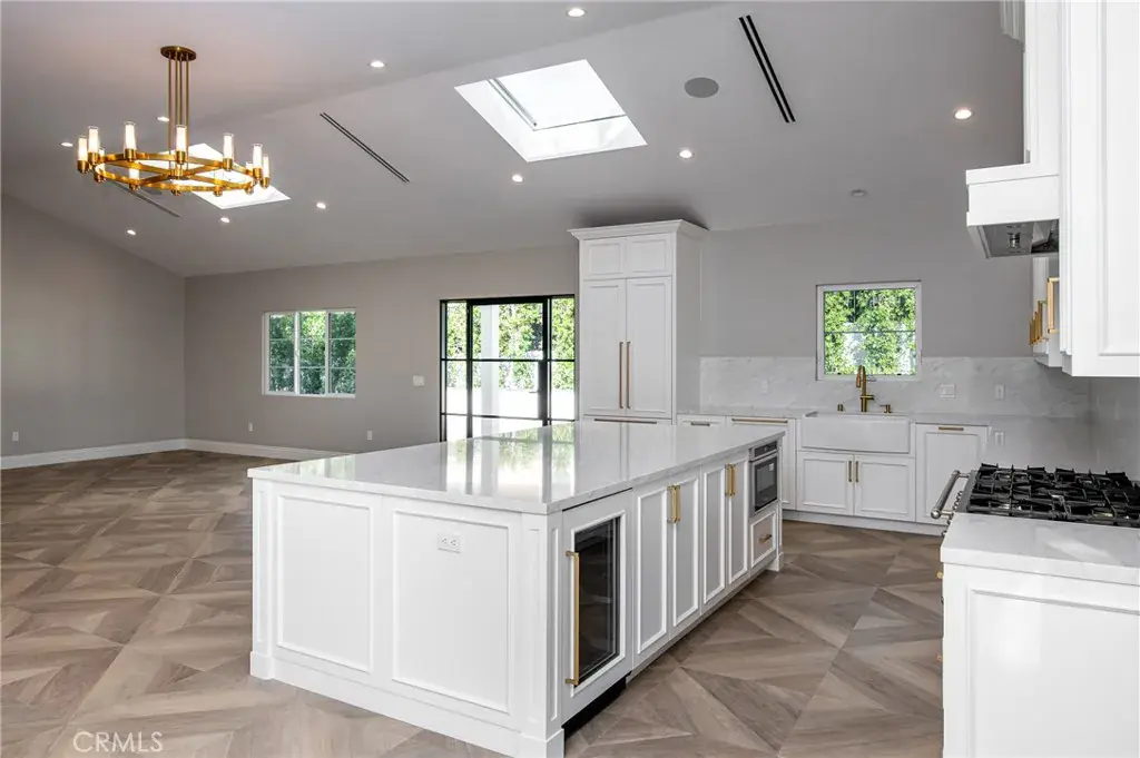 The main residence spans approximately 5,000 square feet with an open floor plan designed for both comfort and sophistication. Inside, Italian flooring flows throughout, leading you into a stunning chef’s kitchen featuring a La Cornue built-in range, quartz countertops, and an expansive kitchen island perfect for entertaining. With 6 bedrooms and 5 bathrooms, every detail has been thoughtfully crafted, from the custom finishes to the seamless indoor-outdoor living experience.