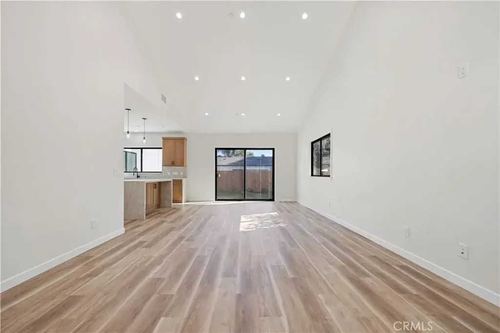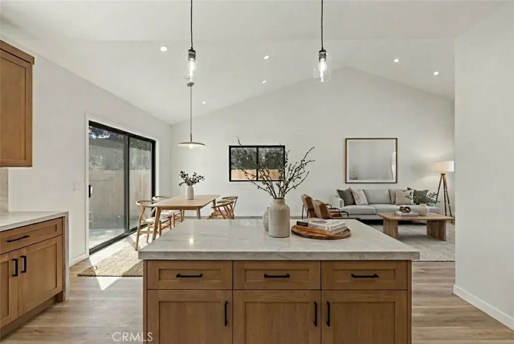 Step inside to an open-concept floor plan filled with natural light. The chef’s kitchen is the centerpiece of the home, featuring a spacious island, walk-in pantry, and seamless flow into the dining and living areas — perfect for entertaining or family gatherings. Large sliding glass doors open to a quaint, private backyard, extending your living space outdoors.