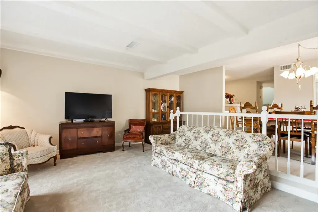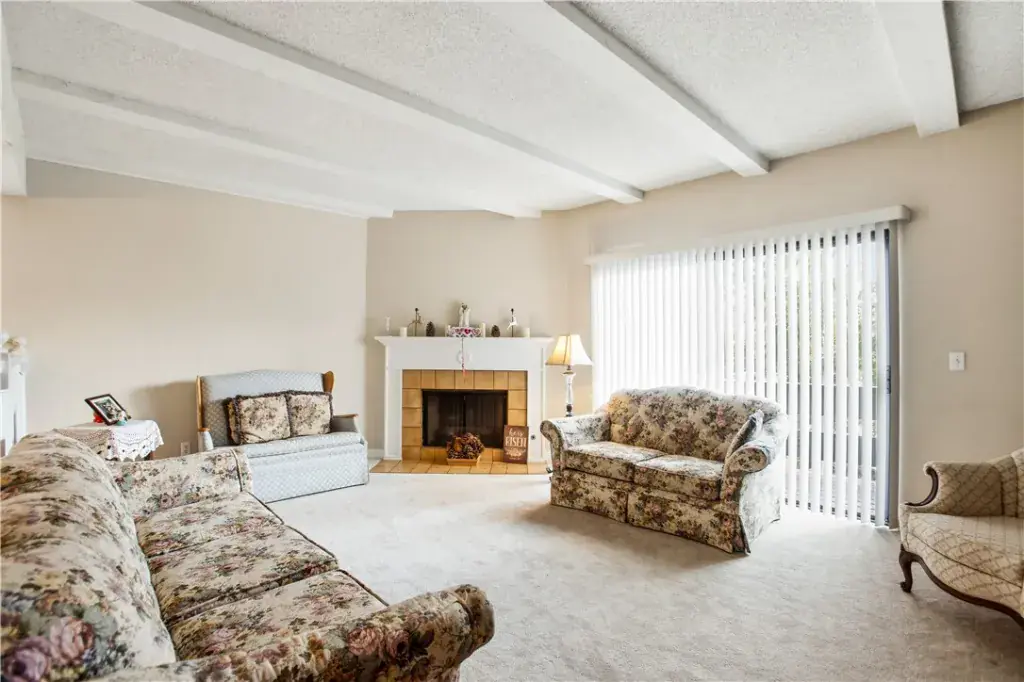 The home has been meticulously maintained and remains in excellent original condition, reflecting true pride of ownership. Natural light fills the interior through large windows and sliding glass doors, creating a bright and welcoming atmosphere throughout. A breakfast area opens directly to the front deck, while the main living area features exposed wood-beam ceilings, a classic fireplace, and sliding doors leading to a private balcony. The living and formal dining areas flow together in an open-concept layout, ideal for everyday living and entertaining.