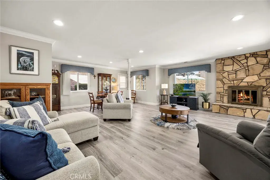 The true picture of perfection, beautifully upgraded and fastidiously maintained, this true charmer is proudly presented to the market for the first time in almost 55 years! Welcome home to 470 N. Palm Street. Manicured landscaping blends with a lush turf front lawn all perfectly complimenting a high quality paver driveway, large enough for multiple cars. Stepping inside you will be surprised and delighted by the expanded, fresh and remodeled interior. Laminate plank flooring is found in the entry, living and dining rooms, hallway and one of the bedrooms. Seamlessly enlarged, the living room and dining rooms are generously sized with a stately gas, stone fireplace and multiple windows, a sliding door leads to the private and manicured backyard. Fully remodeled, the kitchen now hosts quartz counters, warn tone maple stained wood cabinetry and newer appliances, including built-in double ovens, microwave and a gas cooktop, even the fridge and stackable washer and dryer can remain as well. An expanded counter top and cabinetry provide a peninsula area, an ideal space for a coffee bar or for a breakfast seating area. Down the hallway three secondary bedrooms features ceiling fans and plantation shutters, one bedroom has a door leading back to the living room, making it an ideal home office or flex space. A fully remodeled hall bathroom features custom tile flooring and bathtub surround. Two comfortably sized secondary bedrooms are on the right side of the hall and feature ceiling fans, updated closet doors and plantation shutters. The private primary bedroom is a peaceful space with a fully remodeled ¾ en-suite bathroom with custom tile shower with frameless shower door and smooth stone tile accents. Outside a manicured and private backyard awaits with lush plantings, a green lawn and a spacious patio area plus a custom raised deck sitting area. Other quality updates include dual paned windows, tankless water heater and newer HVAC, this home is truly move in ready!
