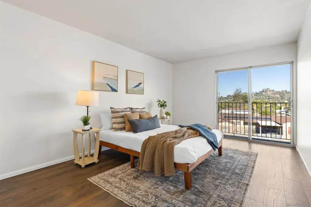 ASSUMABLE LOAN! Top-floor, end unit La Mesa gem with panoramic hilltop views from every room and unbeatable location just steps from La Mesa Village, MacArthur Park, farmers markets, restaurants, boutiques, and two trolley stops. This light-filled, open-concept unit features floor-to-ceiling sliding doors, fresh paint, recessed lighting, central A/C and heat, upgraded GFI outlets, and a spacious kitchen with stainless steel KitchenAid appliances and ample storage. Both large bedrooms (one with en suite) open to private balconies, perfect for enjoying peaceful mornings or evening breezes. Additional highlights include tandem parking for two, secure gated entry, upgraded community laundry, a rooftop deck with sweeping views, and a quiet building atmosphere. This is La Mesa living at its best—don’t miss it!