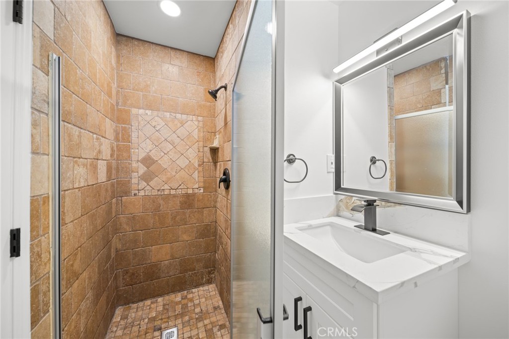 The remodeled kitchen showcases granite countertops, ample cabinetry, and a layout designed for both everyday living and entertaining. The primary bathroom has been tastefully renovated with travertine tile and modern bronze finishes, creating a relaxing, spa-like atmosphere.