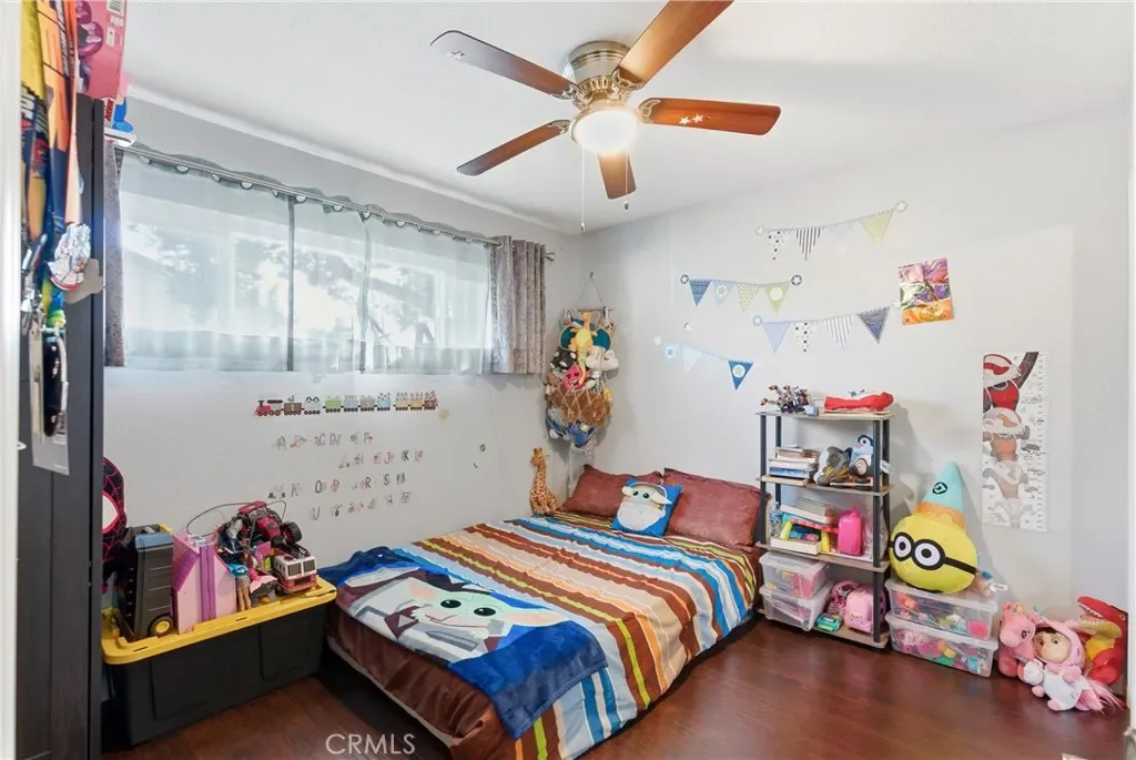 The backyard is designed to be enjoyed, featuring a covered patio with fan, lighting, and electrical outlets, creating an ideal space for gatherings or relaxing outdoors. A dedicated play area with wood chips, a treehouse, and a swing set adds to the charm and functionality of the space.