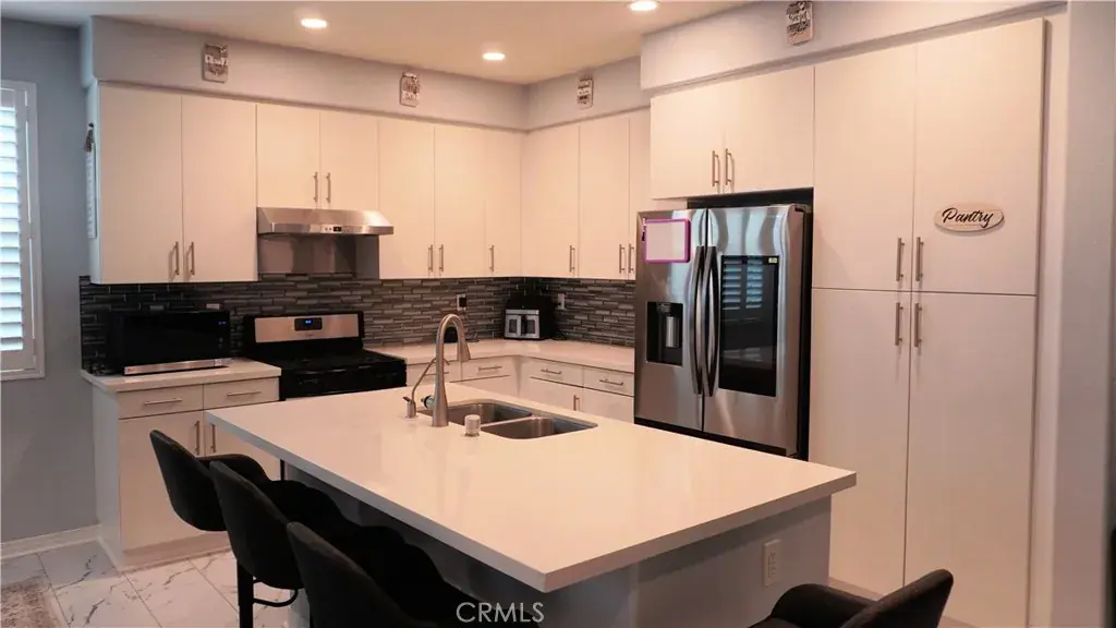 At the heart of the home is the inviting kitchen, designed for both style and function. A large island anchors the space, complemented by sleek white cabinetry, matching quartz countertops, and stainless-steel appliances. Subtle tile accents and backsplash details add warmth and character, while abundant storage and counter space make it a dream for any home chef. Just beyond, the oversized patio offers the perfect backdrop for outdoor dining, gatherings, or simply relaxing under the La Mirada sky.