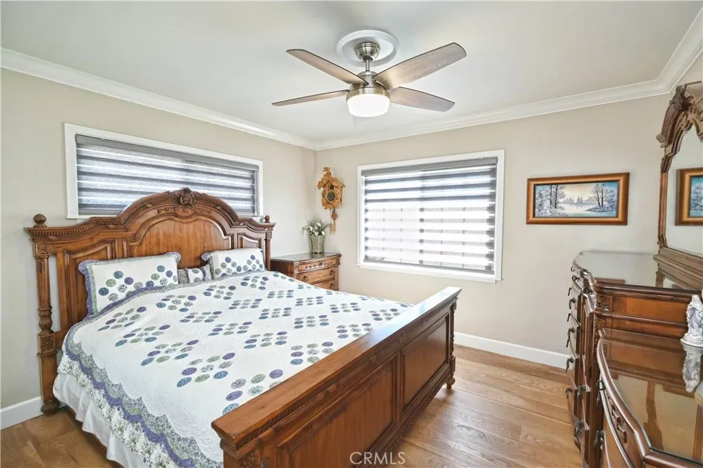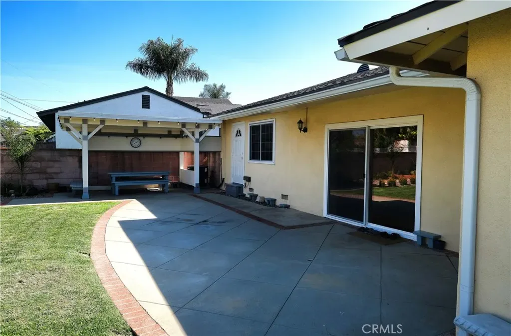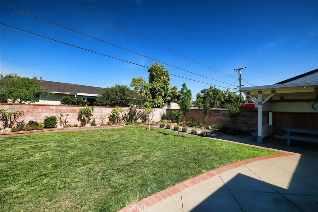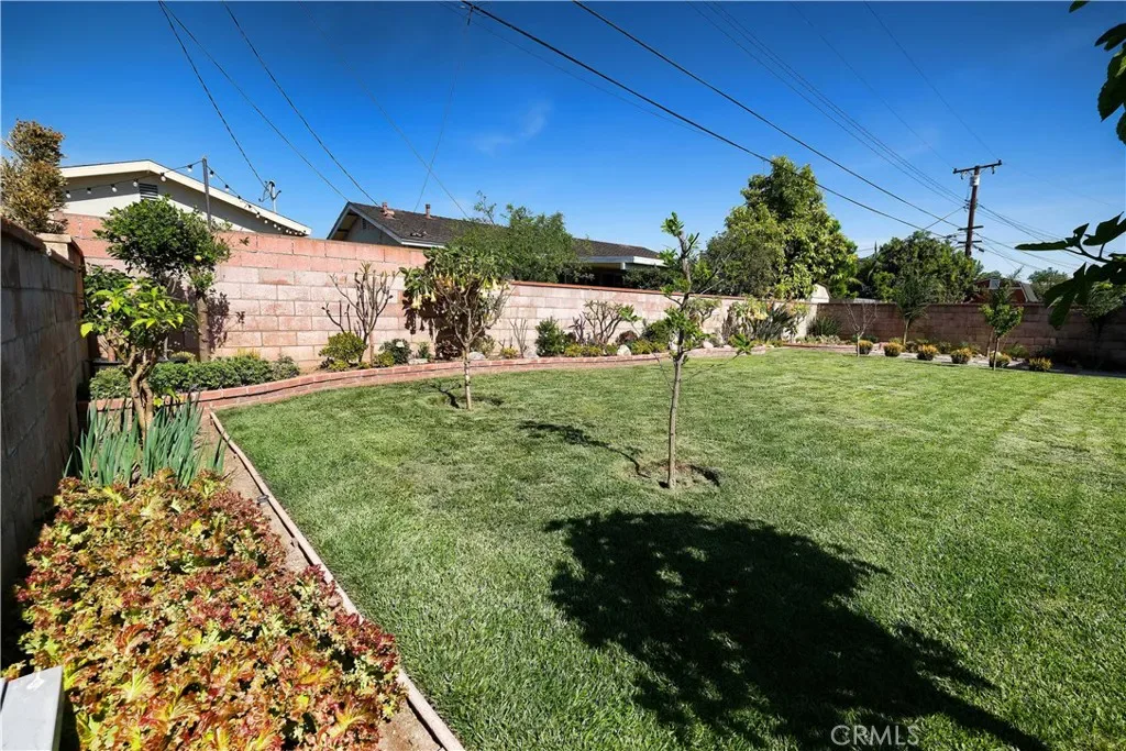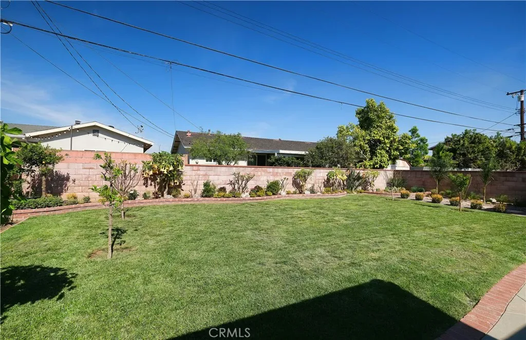 The modern kitchen is equipped with stainless steel appliances, upgraded countertops, and stylish cabinetry that continues into the bathrooms. Additional upgrades include a newer roof, double-pane windows throughout, fabric window blind throughout and a newer central air conditioning system with updated ductwork for year-round comfort. Third bedroom, making it perfect as a den or office. All bedrooms include ceiling fans, crown molding, and custom mirrored closet doors with built-in organizers. The large bathroom featuring a bathtub and a custom glass-enclosed shower. Durable SPC waterproof flooring runs throughout the home, a newer water heater. The inviting living room showcases a unique wood-paneled ceiling with a clean white finish. It opens through sliding glass doors to a beautifully landscaped backyard—perfect for entertaining—with a custom patio ideal for BBQs and relaxation. Front and backyard feature attractive brickwork, automatic sprinklers, and fruit trees. The extra-wide driveway accommodates up to 4 cars or an RV with ease.