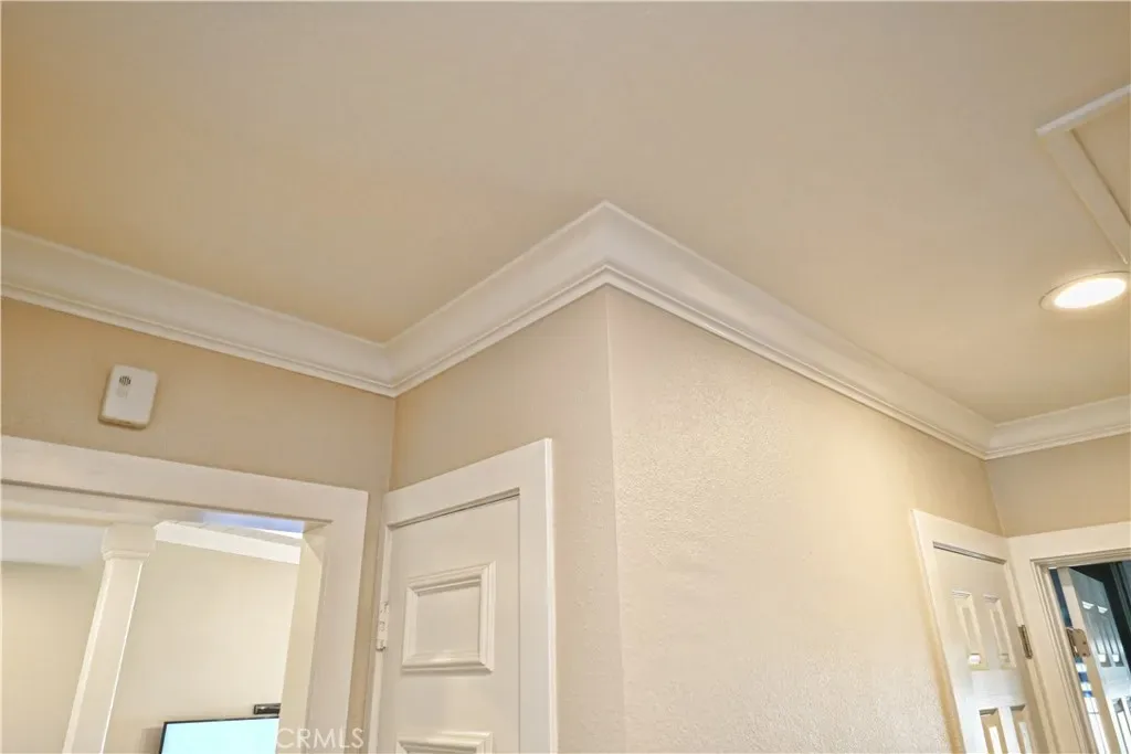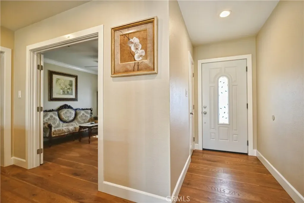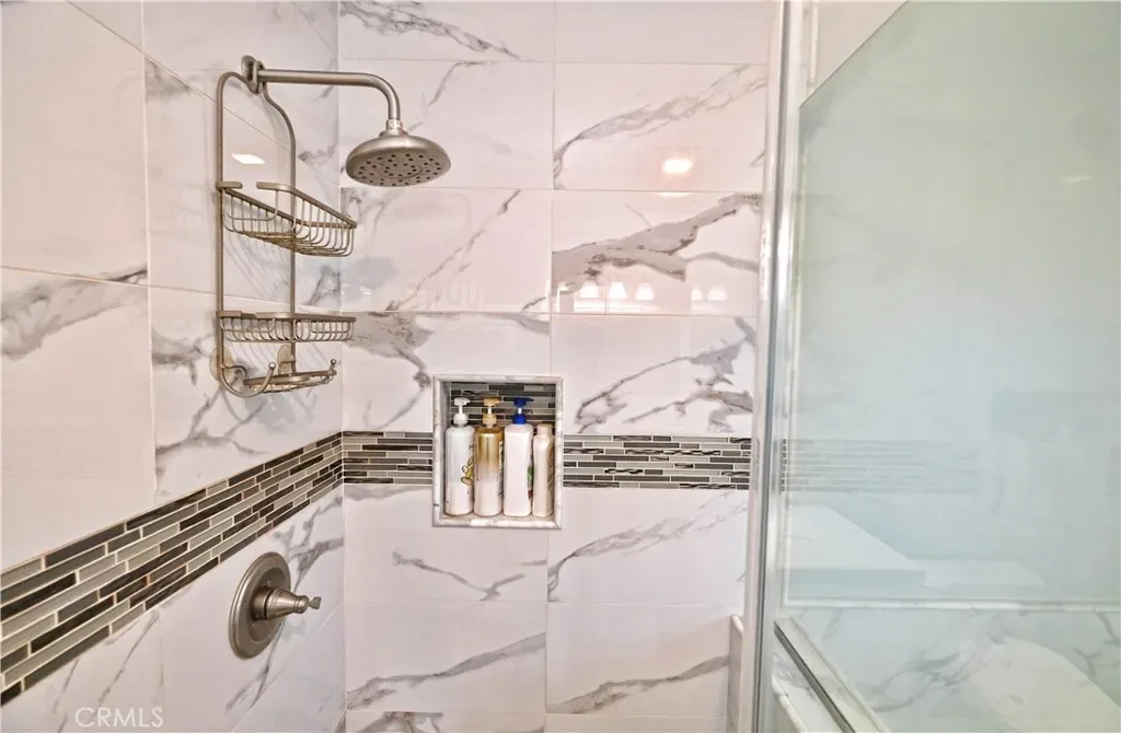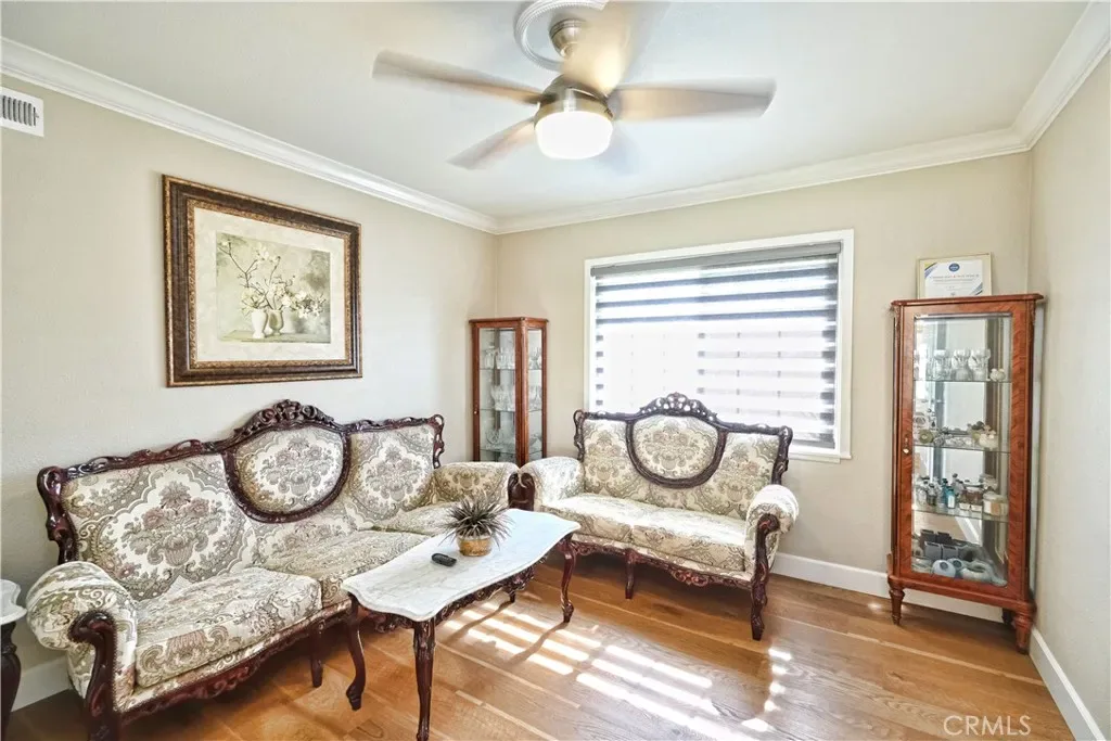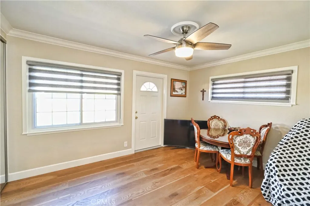 The modern kitchen is equipped with stainless steel appliances, upgraded countertops, and stylish cabinetry that continues into the bathrooms. Additional upgrades include a newer roof, double-pane windows throughout, fabric window blind throughout and a newer central air conditioning system with updated ductwork for year-round comfort. Third bedroom, making it perfect as a den or office. All bedrooms include ceiling fans, crown molding, and custom mirrored closet doors with built-in organizers. The large bathroom featuring a bathtub and a custom glass-enclosed shower. Durable SPC waterproof flooring runs throughout the home, a newer water heater. The inviting living room showcases a unique wood-paneled ceiling with a clean white finish. It opens through sliding glass doors to a beautifully landscaped backyard—perfect for entertaining—with a custom patio ideal for BBQs and relaxation. Front and backyard feature attractive brickwork, automatic sprinklers, and fruit trees. The extra-wide driveway accommodates up to 4 cars or an RV with ease.