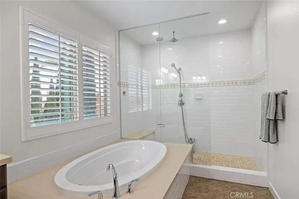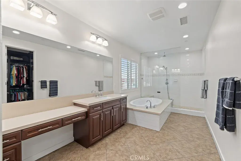 Inside, the open layout includes two downstairs bedrooms with full baths—ideal for guests or multigenerational living—while upstairs offers four additional bedrooms, a convenient upper-level laundry room, and a spacious primary suite with a walk-in closet, soaking tub, and large walk-in shower. Every bedroom has direct access to a bathroom.