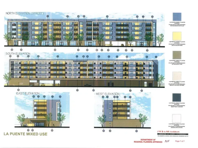 This is La Puente mixed use plan and READY TO BUILD !!! Total 5 floors, Building area approx. 46,314 SF including 7,854 SF commercial area at 1st floor, and 38,450 SF residential area total 44 units apartment from 2nd floor to 5th floor, and 11 units in each floor.