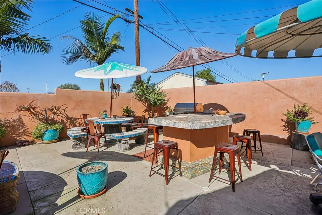 The curb appeal is next-level. Custom succulent and pebble-rock landscaping, framed by railroad ties, is accented by two massive date palm trees and new colored cement walkways. The exterior is finished in a smooth Santa Barbara terracotta stucco, with matching block walls, BBQ island, and elegant stonework across the front of the home for a high-end, custom look.