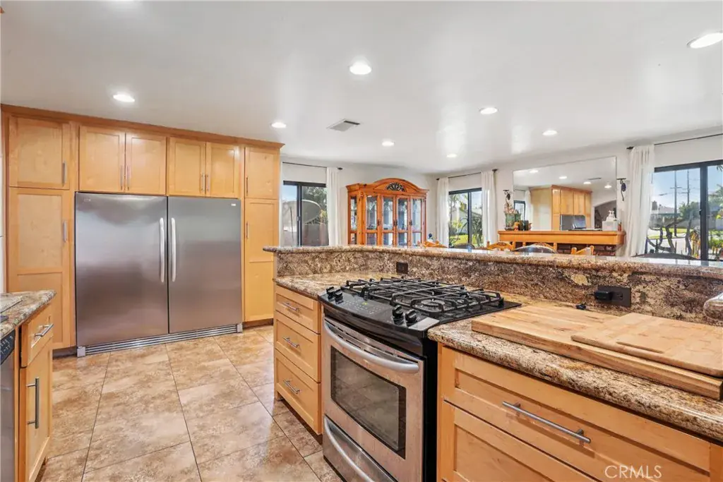 Inside, comfort and style come together with double-pane Milgard windows (bronze-tinted to keep the home cool), recessed lighting, tile flooring, hardwood bedroom floors, ceiling fans, and extra insulation in the walls and attic. The kitchen is a standout, featuring updated cabinetry, granite countertops, a center island, and a massive separate refrigerator and freezer built seamlessly into custom cabinets.