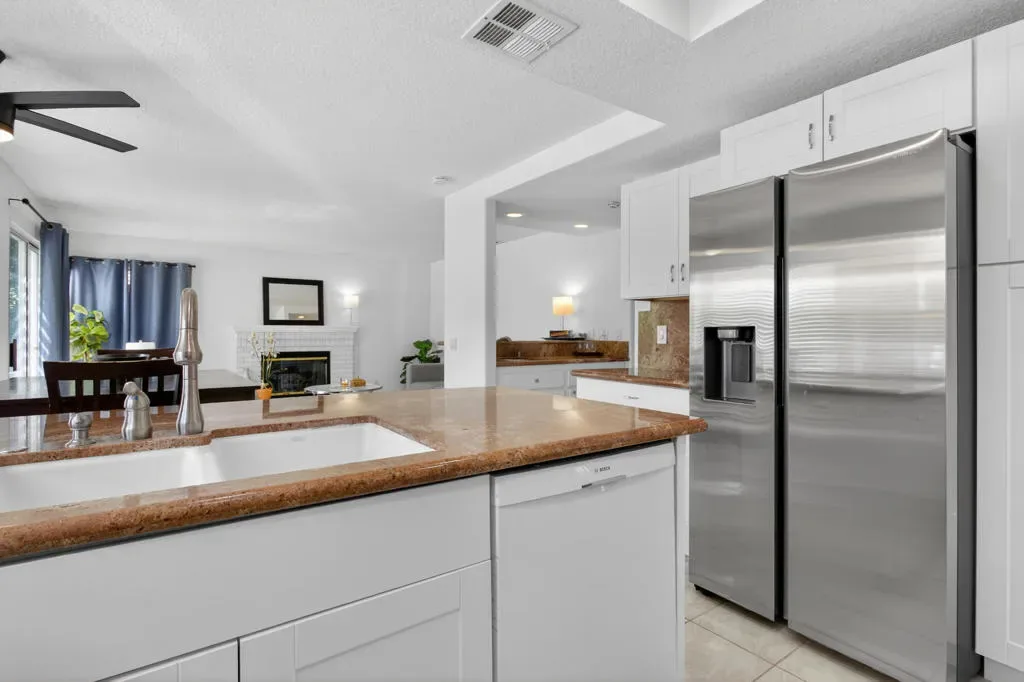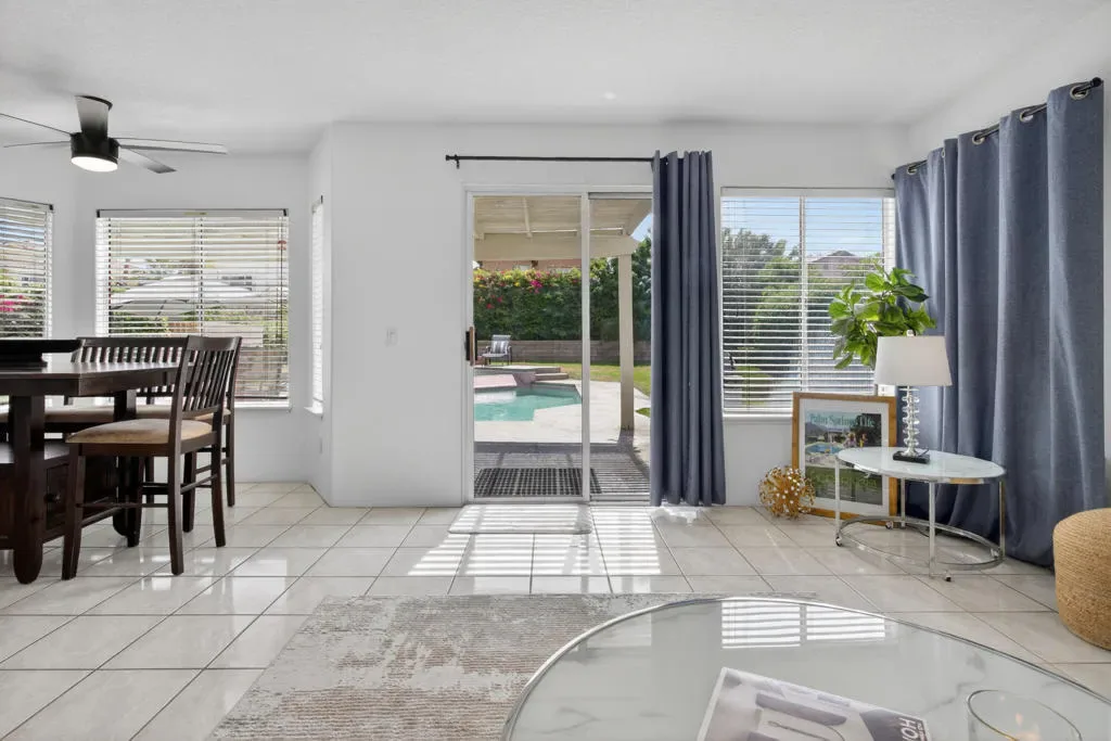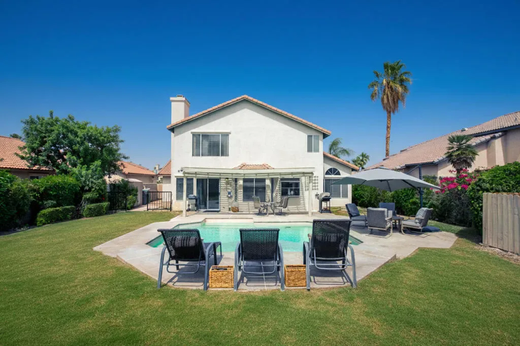 Charming south facing home in the heart of North La Quinta. 4 bedroom 2.5 bath 3 car garage with no HOA! Great bones, solid layout and tons of upside possibilities. This two-story home sits on a large level lot with private pool and spa covered patio. Ideal for full-time living or vacation rental (30 day minimum). All bedrooms are upstairs with a split staircase and open overview of great room. Open floor plan features kitchen overlooking the bonus room and the pool so you can keep an eye on the Fun while you prep for meals. Wet bar with extra storage. The garage has direct access to home. The third garage has separate entrance ( perfect for ADU conversion extra income potential) Also features workshop and storage great for hobbies. The swamp cooler keeps garage cool usable all year round. Kitchen has granite countertops, stainless steel appliances and newer cabinets. Ceiling fans in every room, wired for high speed internet, and pre wired alarm system. Close to the famous INDIAN WELLS TENNIS Gardens! In the DSUSD school district just minutes from Shopping, Restaurants, and Dog Park nearby. Home needs some cosmetic updates. Bring your vision and make it your own. Turnkey, furnished, and ready for you to add your touch!