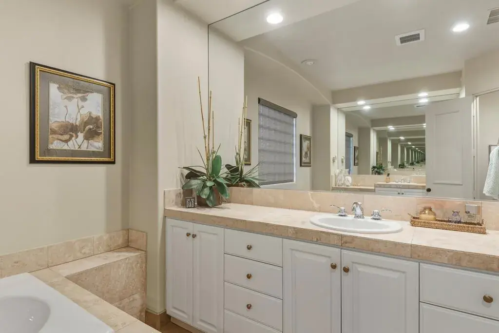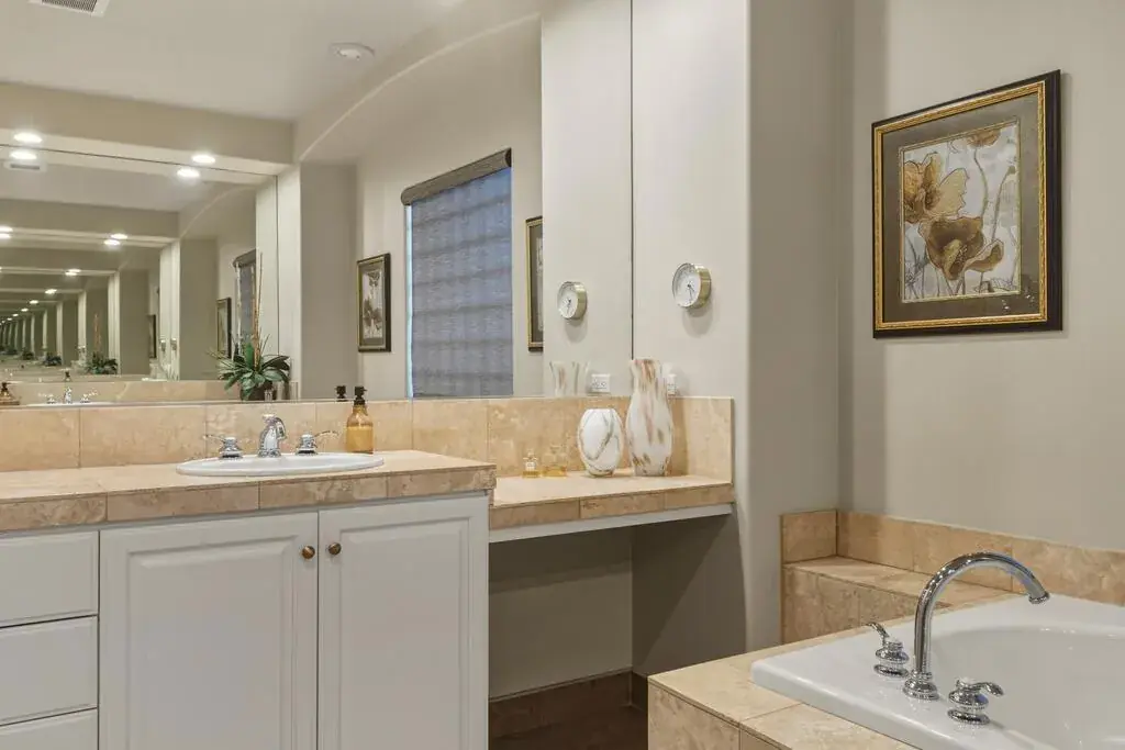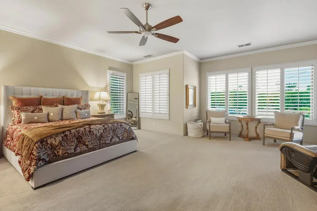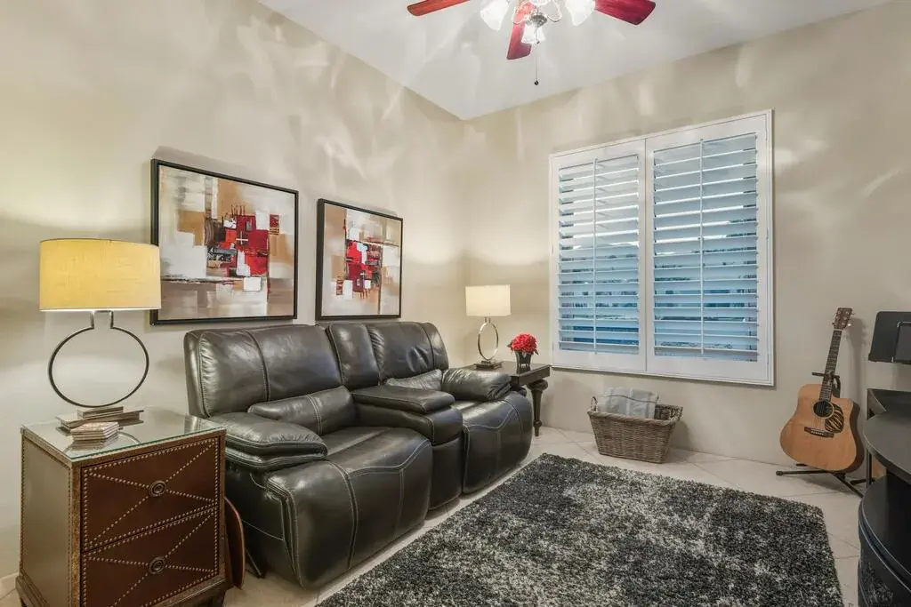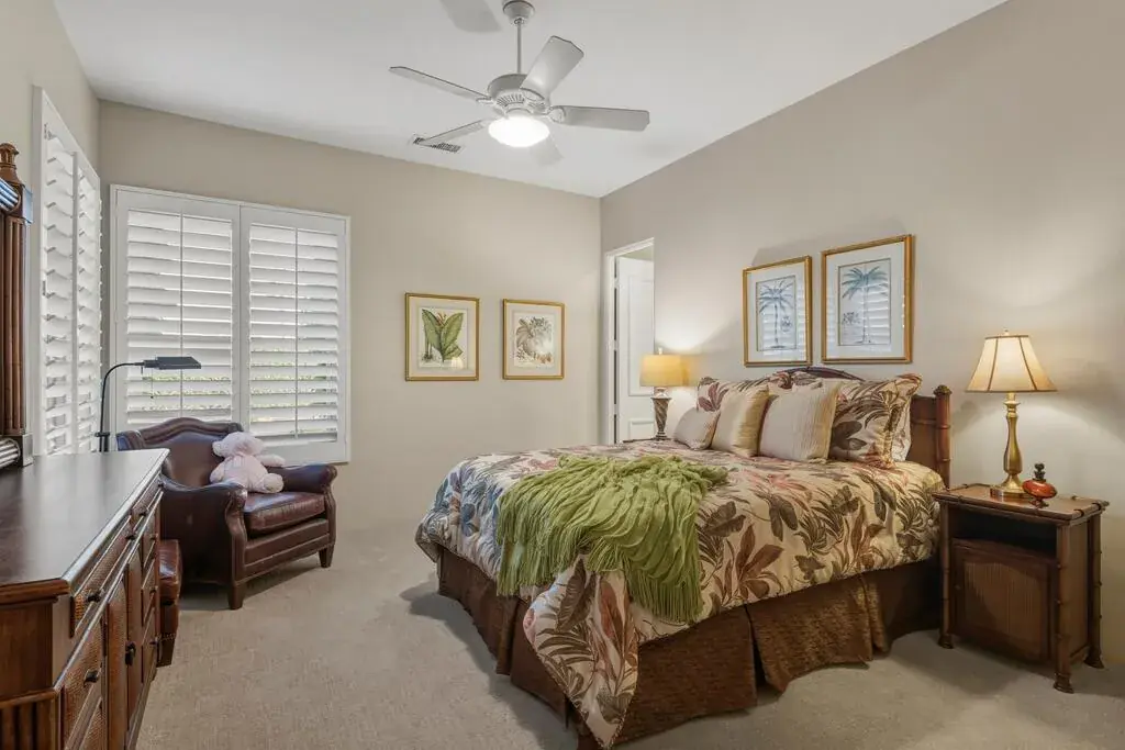 Truly stunning 3 bed, 3.5 bath home sitting at the end of a cul-de-sac street in the gated Althea community is ready for its new owner and offers beautiful curb appeal with artificial turf and the interior of the home is open and spacious with high ceilings, recessed lights, plantation shutters, tile flooring in the main living spaces and carpet in the bedrooms. The living room features an abundance of natural light with sliding glass doors – great for seamless indoor/outdoor hosting. The chef’s kitchen has GE Cafe appliances including the double ovens, cooktop, and refrigerator. The kitchen also offers gorgeous countertops with matching full wall backsplash, white cabinetry with lots of storage space, a huge center island with bar seating, and a pantry. The kitchen also overlooks the breakfast nook area as well as the living room. There is also a formal dining room. All 3 bedrooms are generously sized, have private bathrooms, and walk-in closets! The large primary suite also features crown molding, private backyard access as well as, 2 walk-in closets, and a spa-like ensuite with dual sinks, a soaking tub, and a separate shower. A laundry room with extra storage and there is a half bathroom for guests complete the interior. Enjoy the entertainer’s dream backyard with private in-ground pool and spa, there is also a covered patio, a built-in BBQ bar, a large private putting green and there is also an additional grass side yard! This home also has an attached 3-car garage, and is conveniently located near shopping, dining, golf courses and more! Ready for its next chapter, this home is the perfect place to create lasting memories!