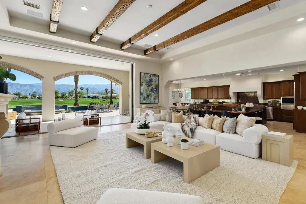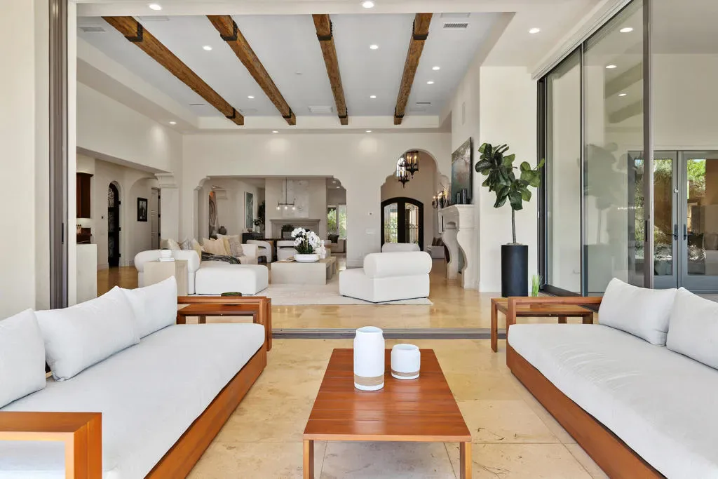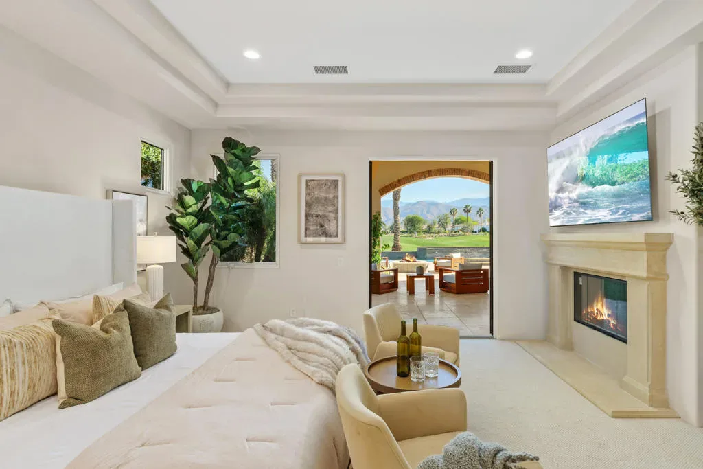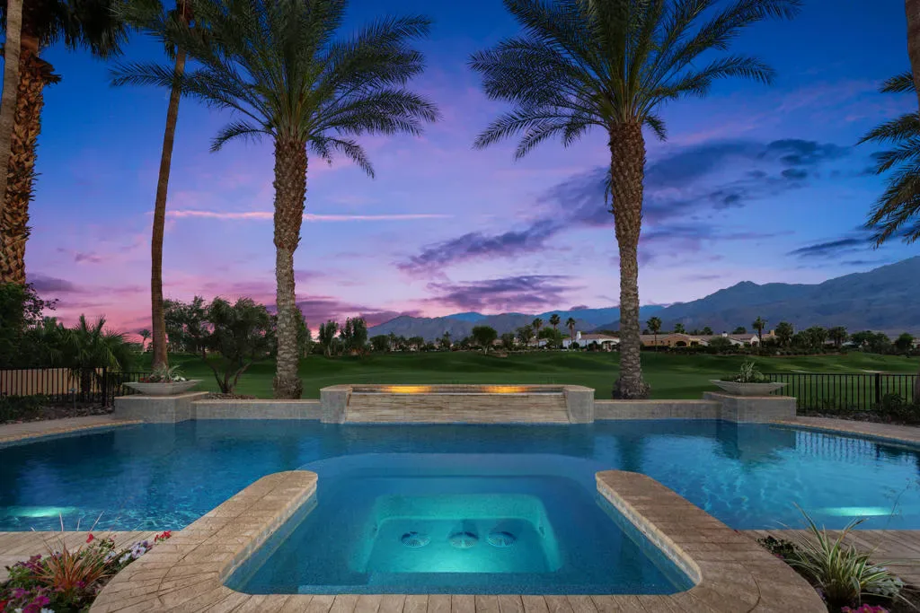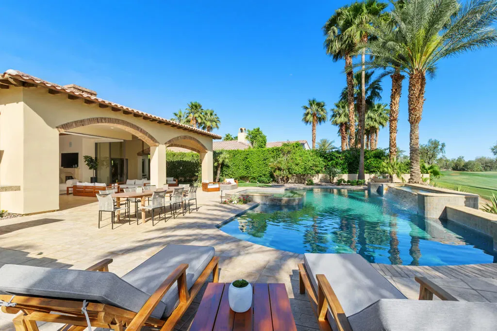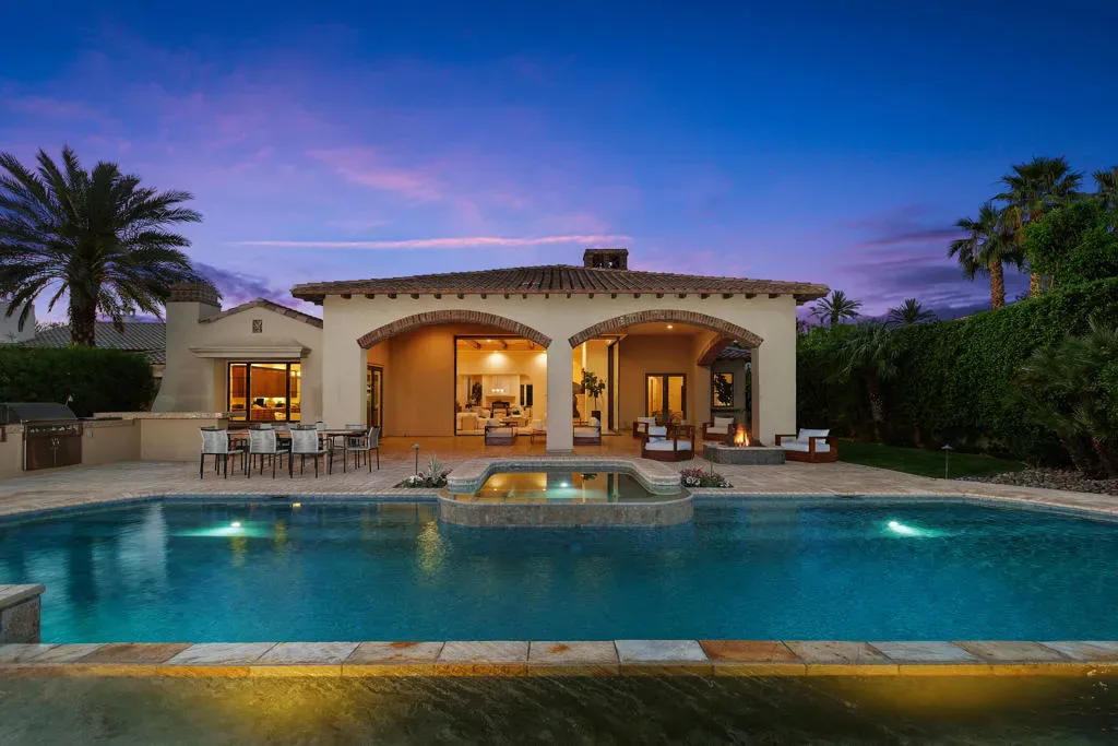 Imagine a life where every day unfolds against a backdrop of breathtaking beauty and unparalleled luxury. 58154 Aracena, an exceptional Finana Villa in Andalusia CC, is set on a premier half-acre lot with southern views stretching across two fairways to the Santa Rosa Mountains. Step through the wrought-iron gate into the protected courtyard, and the outside world slips away. The great room, crowned by a soaring 13-foot beamed ceiling, features Fleetwood glass walls that disappear for seamless indoor-outdoor living. Entertain in the formal dining room, warmed by a dual-sided fireplace that also serves an intimate family room. The chef’s kitchen is equipped with Wolf & Sub-Zero appliances, a sunlit breakfast area, a step-down wet bar, and a 147-bottle, temperature-controlled wine cellar. Retreat to the luxurious primary suite, a sanctuary of comfort featuring its own fireplace and a spa-inspired bath with a double-headed shower, jetted tub, and walk-in closets. Guests will delight in the privacy of the one-bedroom casita, complete with its own living room, fireplace, kitchenette, and full bath. The west wing includes two additional en-suite bedrooms, a full laundry room, and a 3-car garage. The backyard is a private resort with an oversized saltwater pool, waterfall and infinity-edge spa. Gather around the fire pit, dine al fresco from the barbecue island, or compete on the new bocce court. Andalusia CC offers a lifestyle beyond compare. HOA includes social/sports membership, pool & spa, tennis & pickleball courts, walking trails, dog parks, and Tapas Restaurant. The Rees Jones championship course is a masterpiece of challenging design and manicured beauty.This isn’t just a home; it’s a passport to one of the desert’s most sought-after luxury lifestyles, offering security, serenity, and endless opportunities for recreation and relaxation.