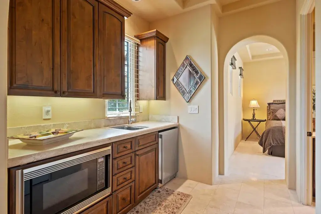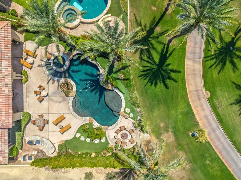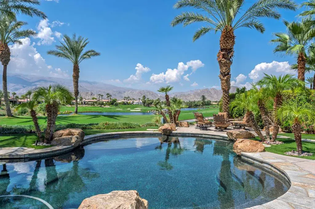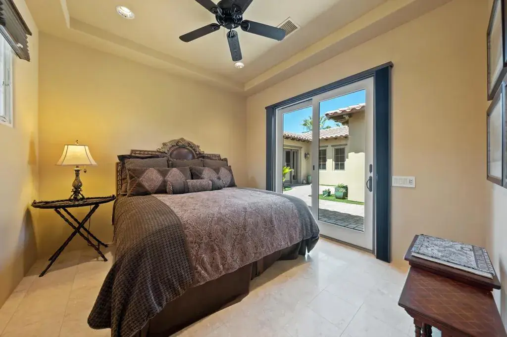 Elevated above the 4th green, this residence captures sweeping South-West views of the Rees Jones designed course, shimmering lake, and the majestic Santa Rosa and Coral Mountains. Step inside to an open floor plan highlighted by elegant travertine floors, crown molding, recessed lighting, and expansive motorized walls of glass that disappear with the push of a button, creating seamless indoor/outdoor living. The gourmet kitchen is equipped with upgraded cabinetry, Wolf/Sub-Zero appliances, two dishwashers, a wet bar, and a morning room that takes in the spectacular views. A temperature-controlled wine room adds the perfect touch for wine enthusiasts, while a dedicated office provides a quiet retreat for work or study. The luxurious primary suite features a cozy fireplace and a spa-inspired bathroom with direct patio access. Guests will enjoy the detached casita, complete with a fireplace in the living room, bedroom, bathroom, and kitchenette. The backyard is a true entertainer’s dream, boasting a custom pool and spa, an outdoor kitchen with BBQ, smoker, and bar seating, plus a fire pit to gather around on cool desert nights. A large side yard with a private horseshoe court completes this exceptional outdoor living experience. Come live the life you’ve always imagined!
