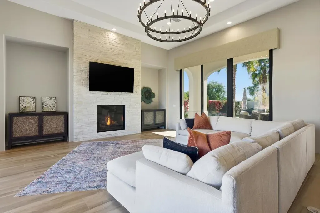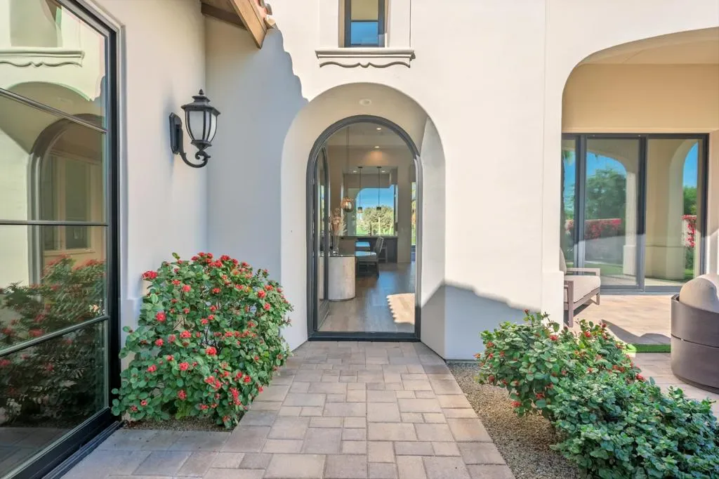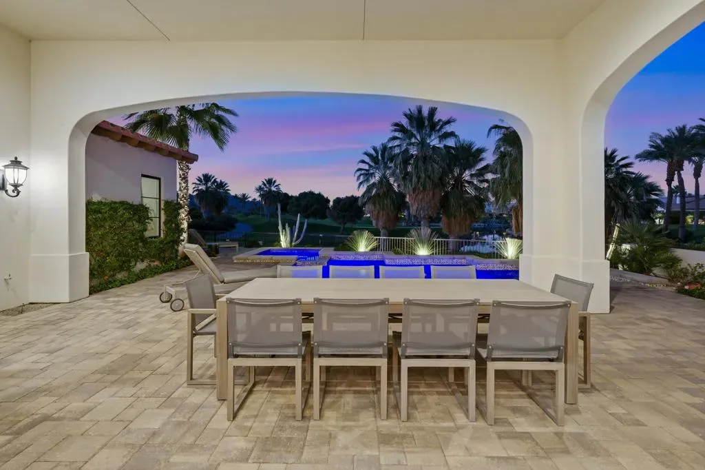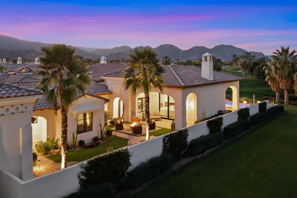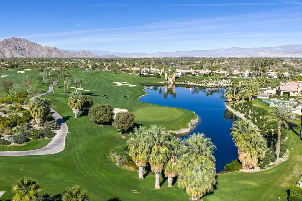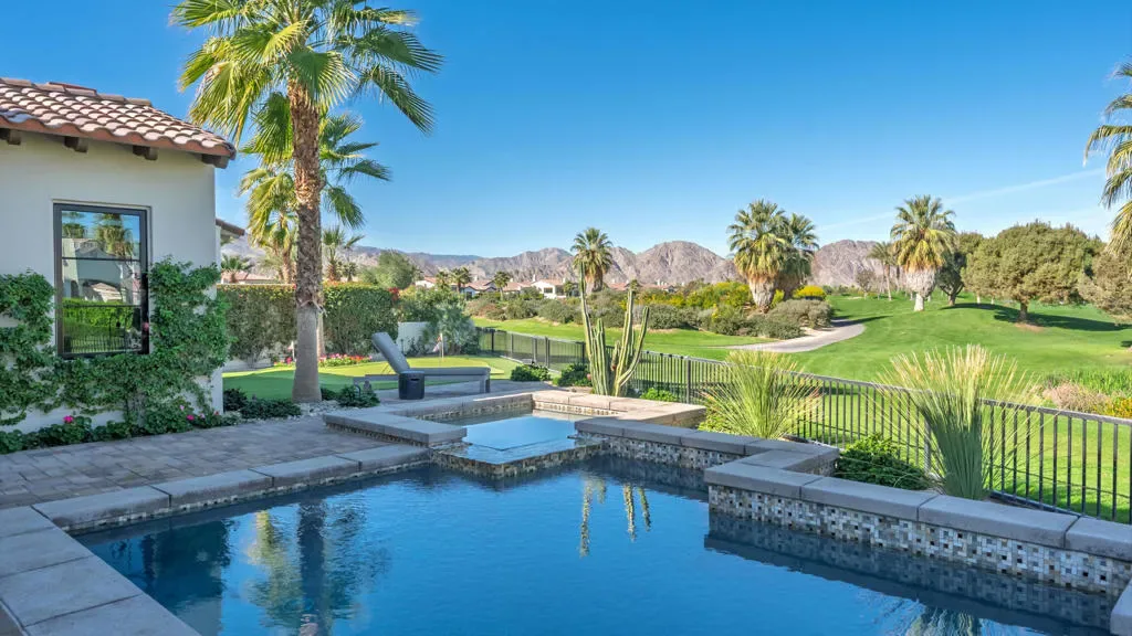 Set on a coveted end lot bordered by a lush greenbelt, this exceptional residence offers remarkable privacy and sweeping desert beauty from nearly every angle. Thoughtfully positioned to capture lake views, the 5th green, and the 6th fairway of the Rees Jones designed course. The home is further framed by dramatic vistas of the Santa Rosa and Coral Mountains, visible from both the courtyard and the backyard. The outdoor living spaces are truly special. A private courtyard welcomes you with a cozy fire pit that is perfect for evenings under the stars while the backyard is designed for both relaxation and play, featuring a personal putting green and serene golf course views that stretch into the distance. The expansive open space creates a quiet backdrop, reinforcing the home’s relaxed, resort-style atmosphere. Inside, the 4-bed, 5-bath home is designer furnished, blending comfort with refined style. Wood-look ceramic tile flooring runs throughout the main living areas, adding warmth and continuity to the interior spaces. The great room is anchored by a striking stacked-stone fireplace, creating a natural focal point and an inviting atmosphere for entertaining or quiet nights in. Every detail has been curated to complement the home’s surroundings, allowing the outdoor views to take center stage while maintaining a sophisticated, modern feel inside. This is a rare opportunity to own a private, view-oriented retreat where indoor and outdoor living come together seamlessly. Come live the life you’ve always imagined.