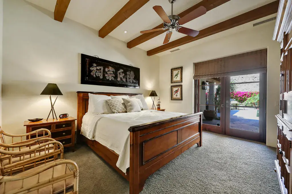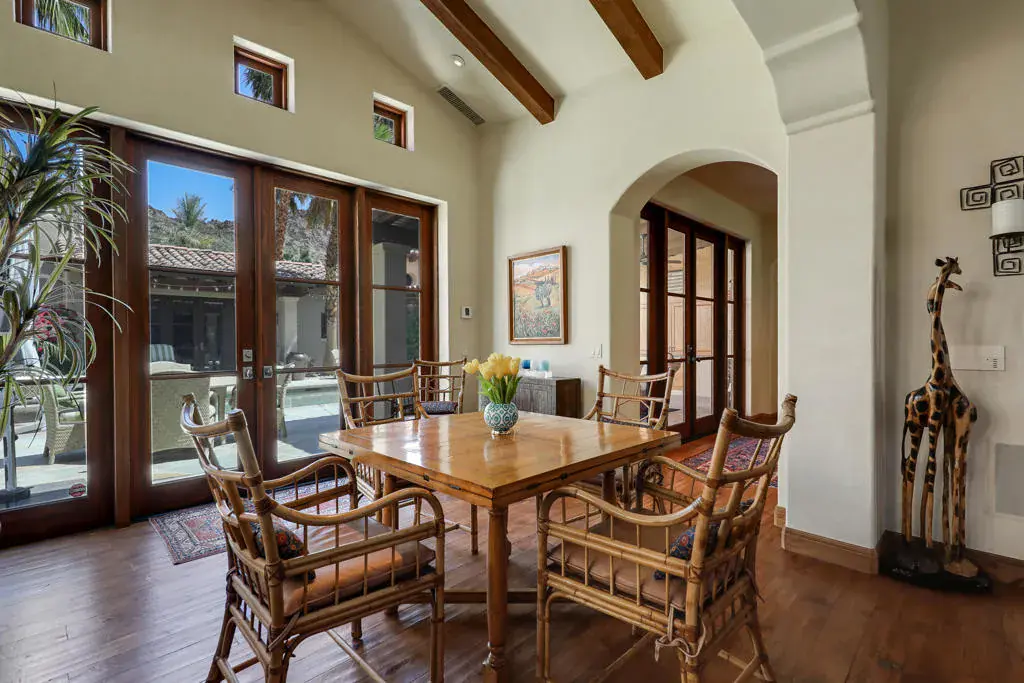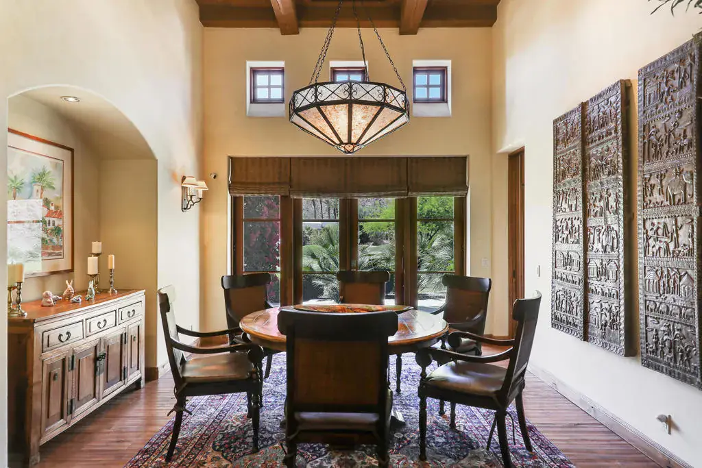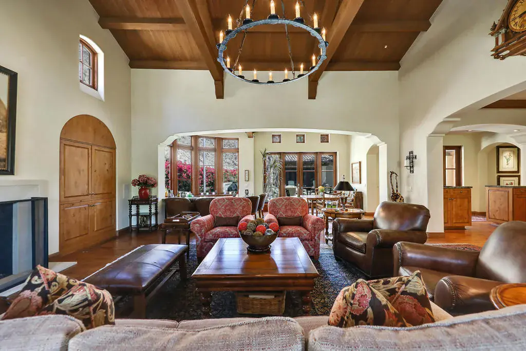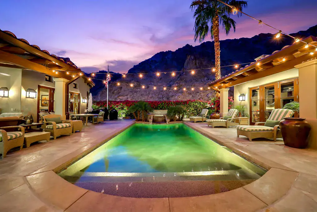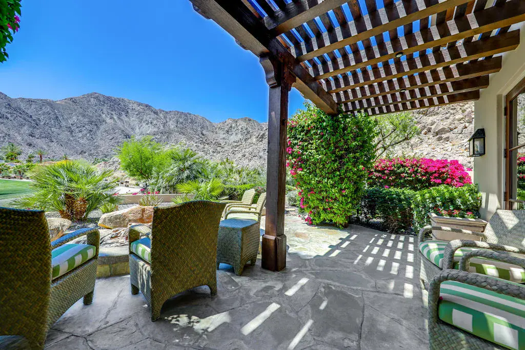 Surrounded by dramatic mountain vistas from every room, this beautifully customized home embodies the essence of refined desert living. Overlooking the 13th Green of the the world-renowned Mountain Course, it captures the magic of La Quinta’s most enchanting setting–spectacular sunsets, star-filled nights, and the sweet scent of citrus in bloom. Private arched wood entry doors lead into a serene courtyard featuring a sparkling pool and spa framed by soaring mountain peaks. Designed for seamless indoor-outdoor living, the entire home opens from the courtyard through the main living spaces to a rear patio that invites relaxation and entertaining. Here, you’ll find a built-in fire pit that glows beneath the desert sky, creating the perfect gathering space for evening conversations or quiet stargazing. An additional outdoor fireplace and seating area in the courtyard enhance the home’s inviting ambiance, ideal for hosting friends and family. Inside, timeless Spanish-inspired details shine through with wood-beamed ceilings, grand chandeliers, and artisan craftsmanship throughout. The kitchen is a chef’s dream, appointed with Sub-Zero refrigeration, a Viking six-burner gas cooktop, wine refrigerator, extensive counter space, and a generous central island that makes cooking and entertaining effortless. Four spacious bedroom suites, each with a private en-suite bath, offer both comfort and privacy. Expansive living and dining areas provide a graceful setting for gatherings, while the cozy den or office adds flexibility for work or leisure. An air-conditioned two-car garage with built-in storage, plus additional space for two golf carts, underscores the home’s thoughtful design and functionality. Located just minutes from the iconic La Quinta Resort, residents enjoy easy walk, bike, or golf cart to world-class dining, shopping, spa experiences, tennis, and golf. Blending elegance, warmth, and authentic desert charm, this exquisite home delivers a perfect balance of luxury and relaxation amid the breathtaking landscapes of La Quinta.