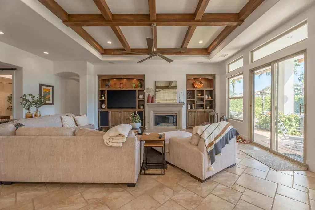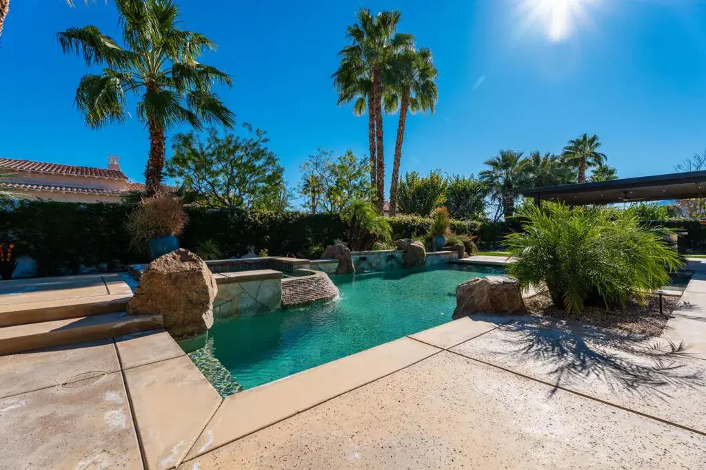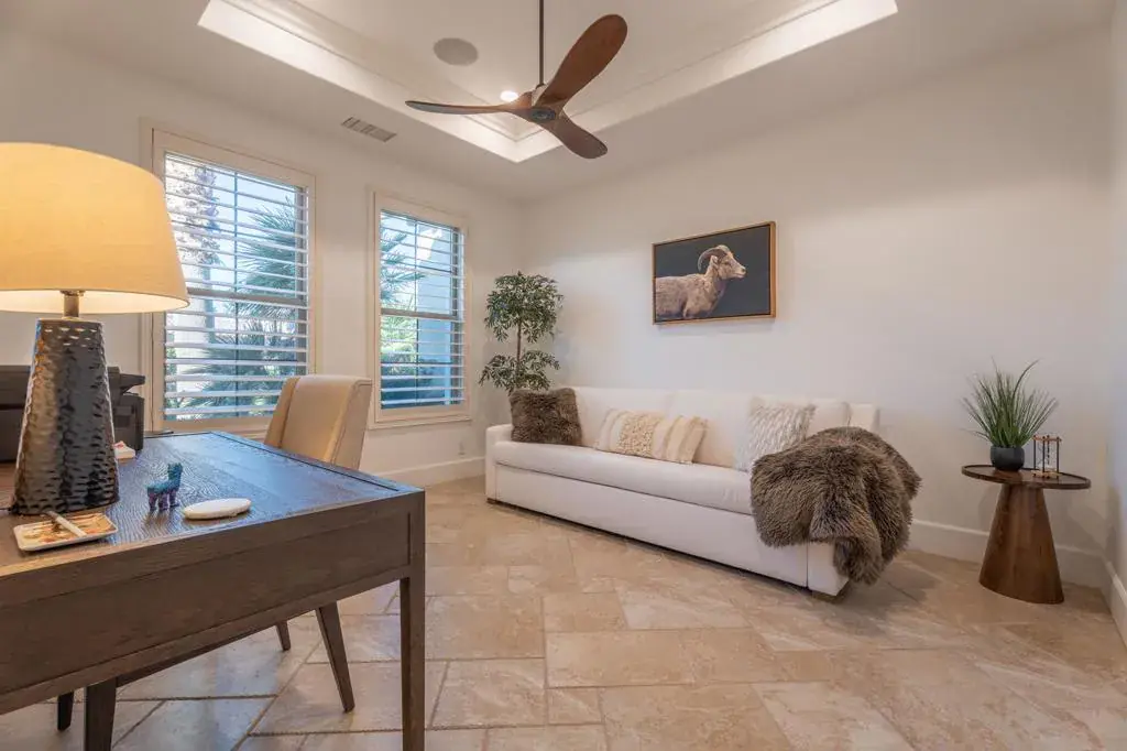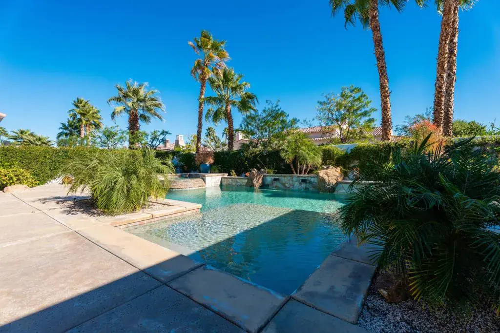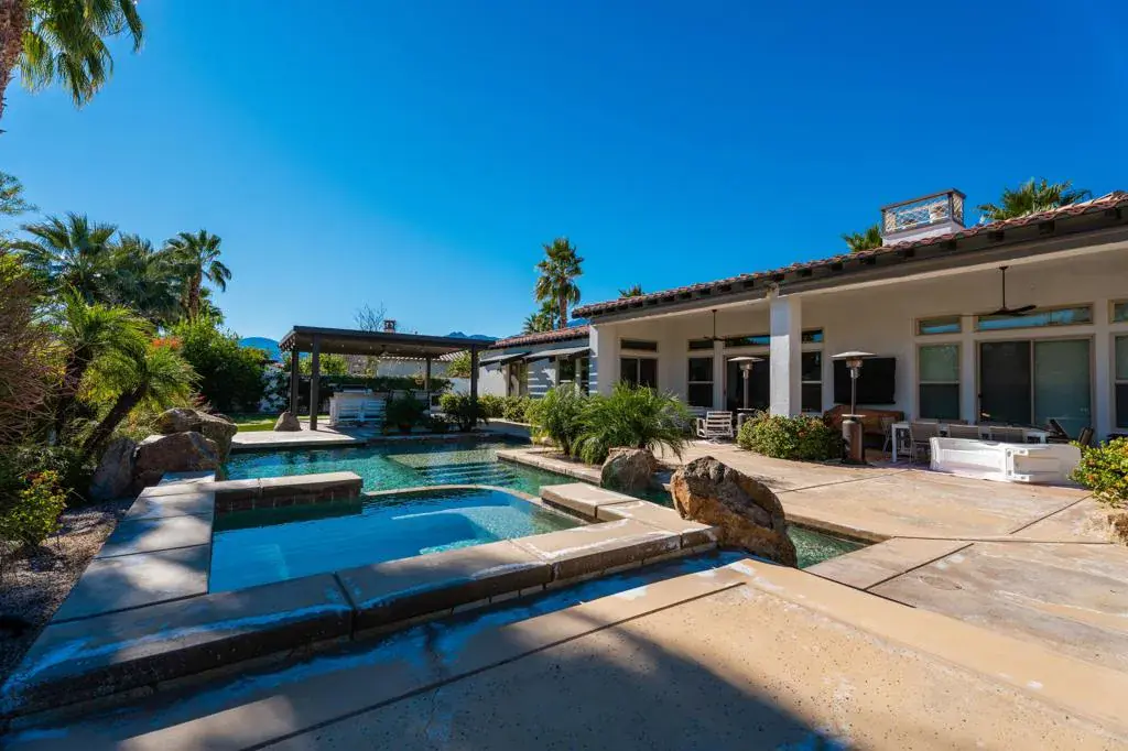 Located on a quiet cul-de-sac in the gated community of Griffin Ranch, located near the empire polo grounds. This upgraded single-story home offers approx. 3,152 sq ft with 3 bedrooms, 3.5 baths, plus a private office. Open floor plan features a spacious great room, formal dining area, and chef’s kitchen with dual ovens and wine refrigerator.Resort-style backyard includes private pool and spa, fire pit, putting green, turf landscaping, and covered patio–ideal for desert living and entertaining. All bedrooms are ensuite with walk-in closets. Additional features include indoor/outdoor sound system, electric shades, and 3-car garage.Community amenities include clubhouse, fitness center, tennis, pickleball, bocce ball, dog park, and walking trails. Close to golf, shopping, and dining.
