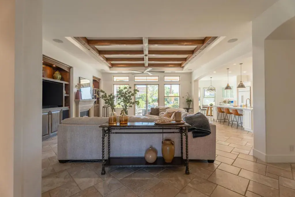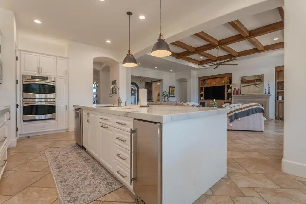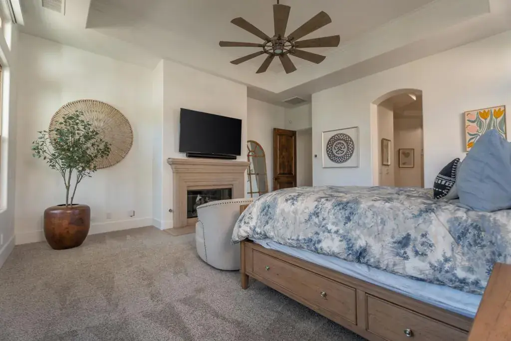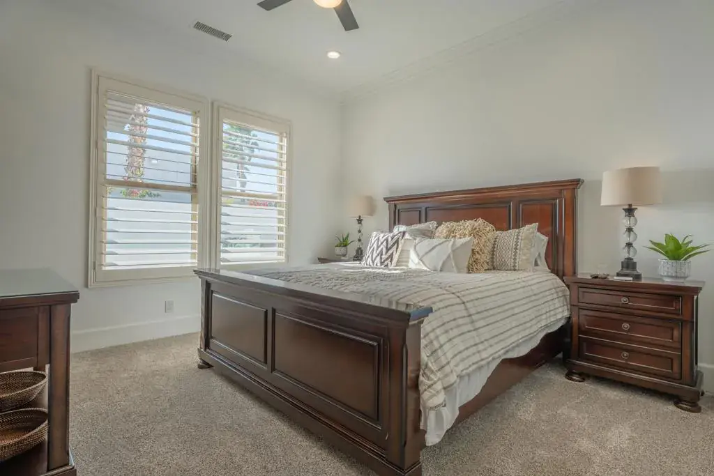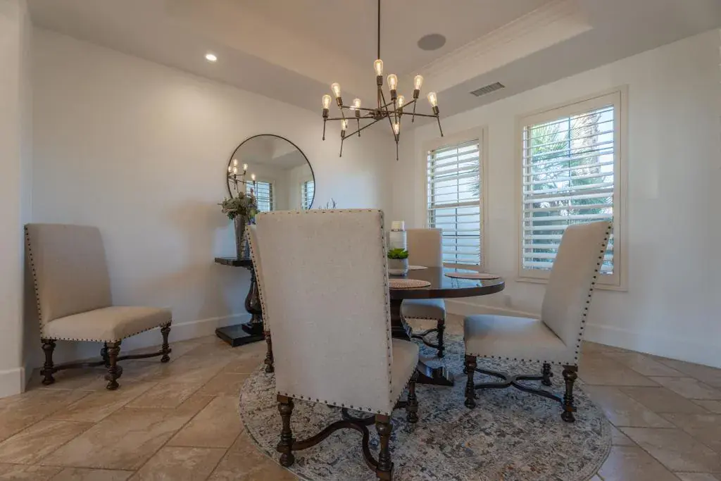 Located on a quiet cul-de-sac in the gated community of Griffin Ranch, located near the empire polo grounds. This upgraded single-story home offers approx. 3,152 sq ft with 3 bedrooms, 3.5 baths, plus a private office. Open floor plan features a spacious great room, formal dining area, and chef’s kitchen with dual ovens and wine refrigerator.Resort-style backyard includes private pool and spa, fire pit, putting green, turf landscaping, and covered patio–ideal for desert living and entertaining. All bedrooms are ensuite with walk-in closets. Additional features include indoor/outdoor sound system, electric shades, and 3-car garage.Community amenities include clubhouse, fitness center, tennis, pickleball, bocce ball, dog park, and walking trails. Close to golf, shopping, and dining.