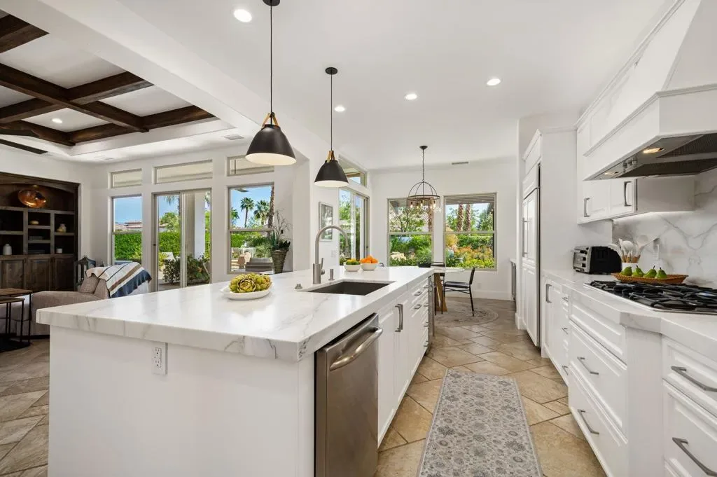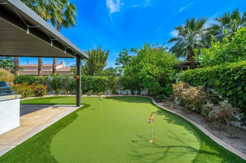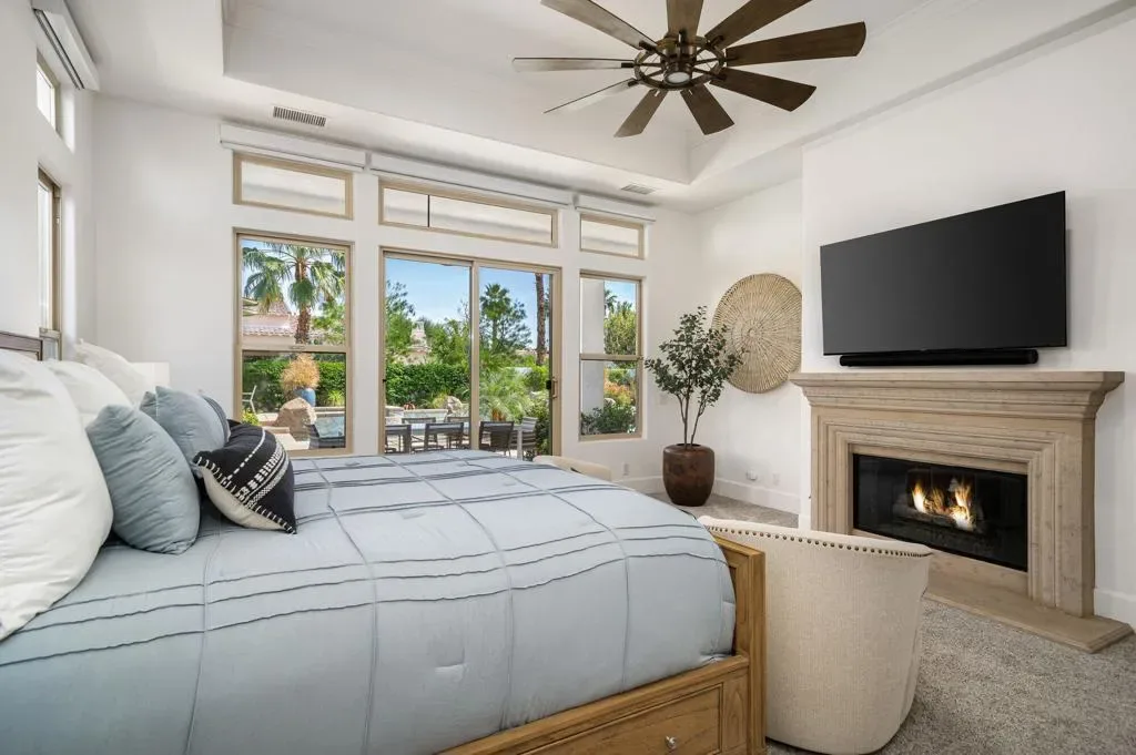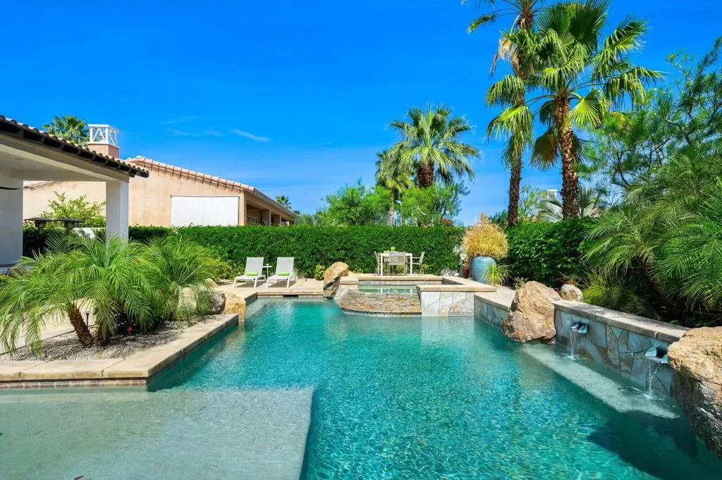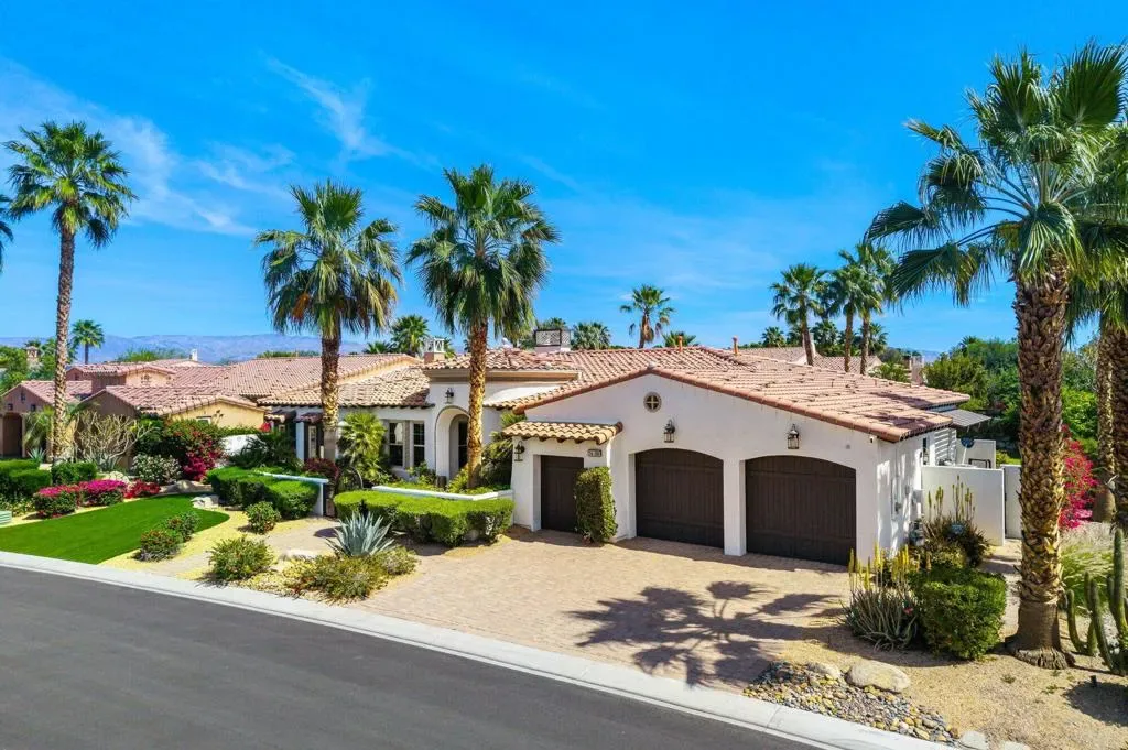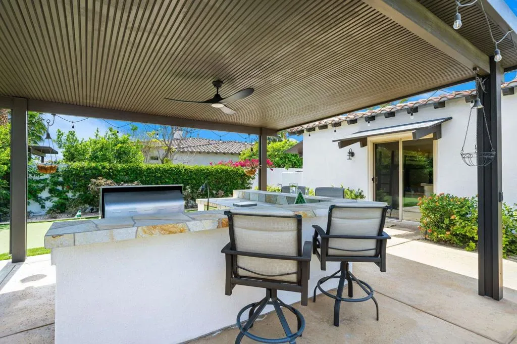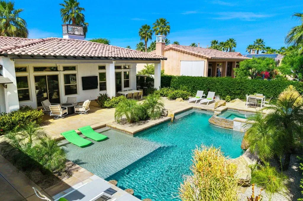 Welcome to this beautifully upgraded retreat behind the guard gates of Griffin Ranch in La Quinta.Surrounded by some of the most prestigious golf communities, including The Madison Club, The Hideaway, Andalusia, & The Quarry, this location delivers a lifestyle that’s equal parts refined & relaxed. This home is designed for effortless indoor-outdoor living. Sun-filled interiors flow seamlessly into a stunning private backyard built for both entertaining and unwinding. The covered patio with multiple dining and relaxing areas, resurfaced pool and spa, fire pit, outdoor television, fans, heaters, outdoor sound system, putting green, and mature landscaping create a resort-style atmosphere, while the covered outdoor kitchen and upgraded lighting set the stage for evenings under the desert sky, enjoying your favorite libation while firing up the grill. Inside, the open-concept chef’s kitchen anchors the home with Quartz counters, a huge island, dual ovens, multiple wine fridges, a walk-in pantry, and generous space for the whole gang to gather. The great room with its built-ins framing the fireplace, and wood-beamed ceiling is a dramatic focal point. A dedicated office/den/4th bedroom, behind a barn door, offers a quiet place to work, while the two en suite guest bedrooms with walk-in closets provide comfort and privacy for family and guests alike. The spacious primary retreat, with its own fireplace and an amazing, upgraded walk-in closet, is elevated by the gorgeous bath with separate dual sinks, a soaking tub, and a sizable shower that feels like a spa experience. Thoughtful upgrades throughout–updated flooring, refreshed finishes, enhanced lighting, ceiling fans, and whole-home audio–add both style and convenience. Additional highlights include a three-car garage with epoxy floors, updated HVAC systems, electric sunshades, and professionally designed landscaping with an automatic drip system. Life at Griffin Ranch extends well beyond your front door. Residents enjoy onsite access to a world-class clubhouse, fitness center, Pilates room, game room with a pool table and table tennis, tennis and pickleball courts, bocce ball courts, scenic walking paths, & a dog park. Outside the gates, you are close to many golf courses, hiking, biking, dining, entertainment at the Acrisure Arena, and everything that the desert has to offer.