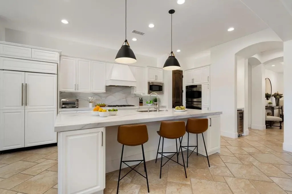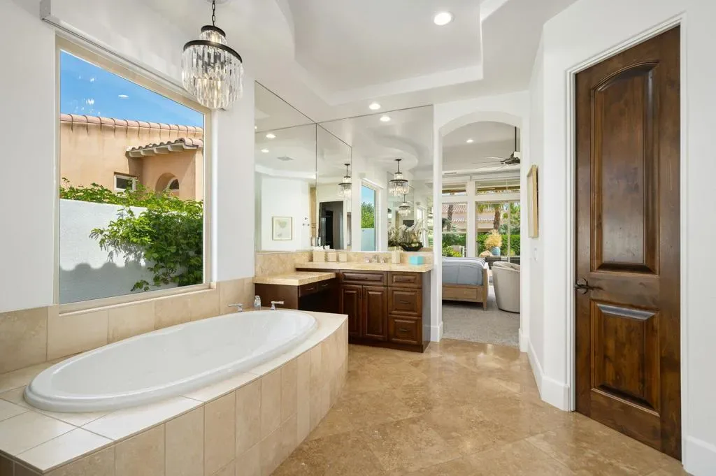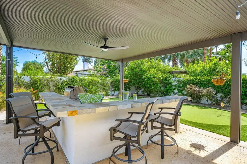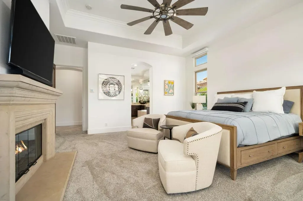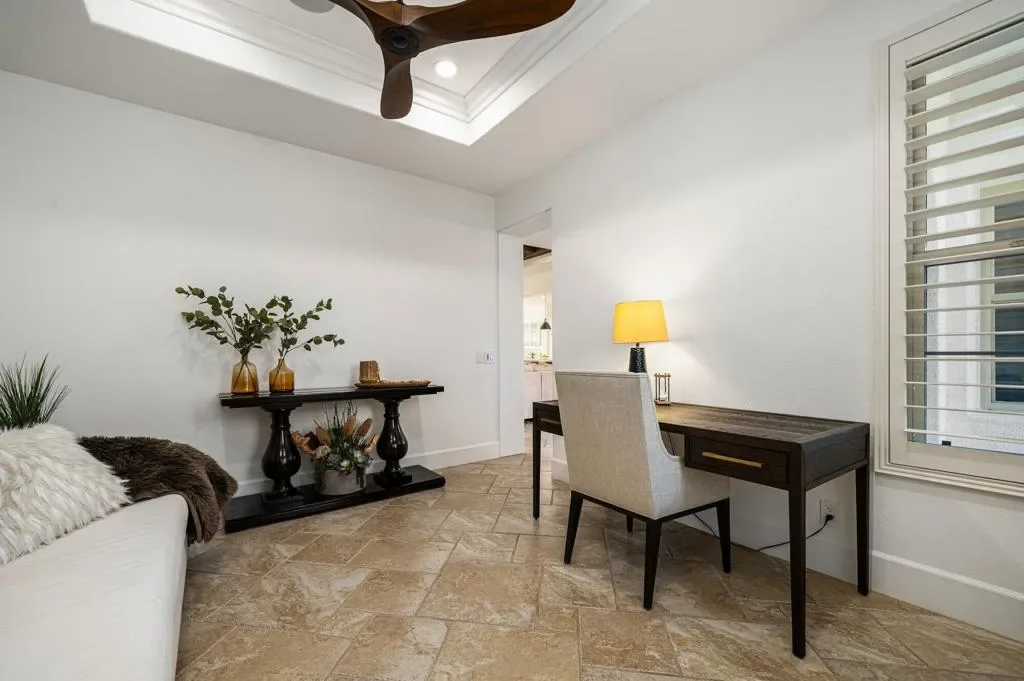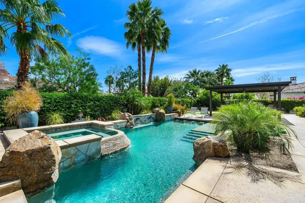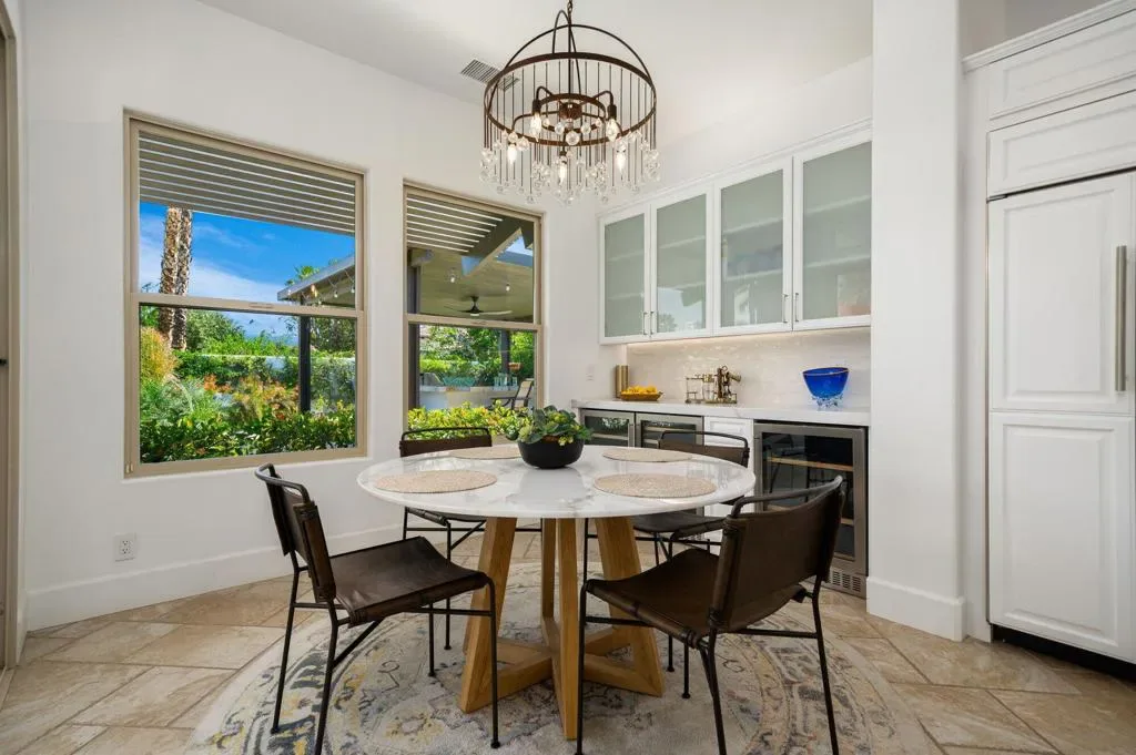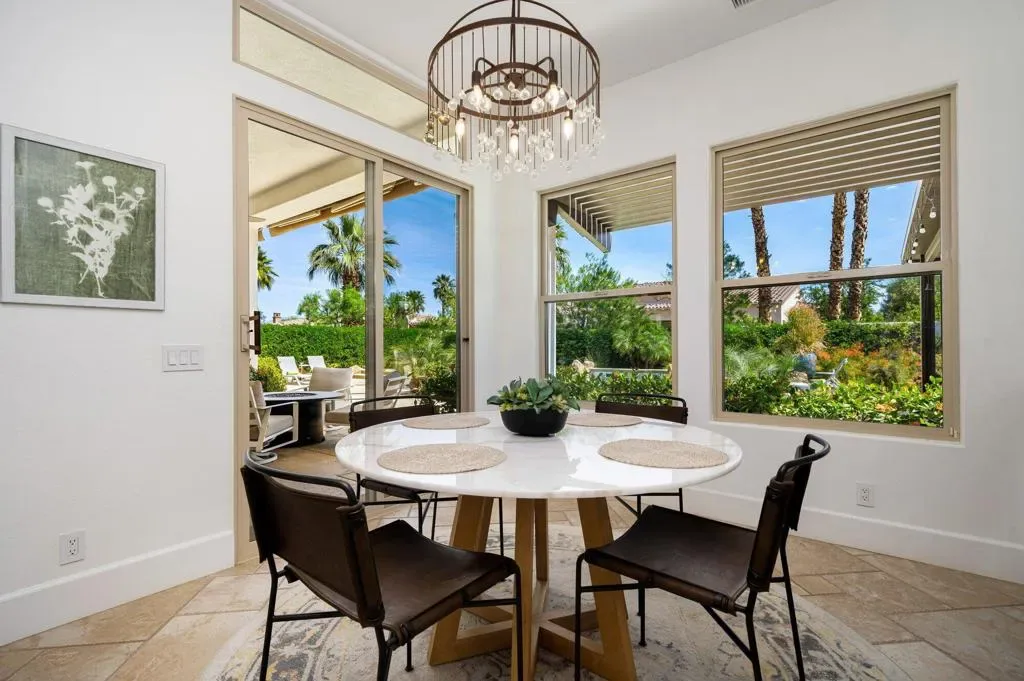 Welcome to this beautifully upgraded retreat behind the guard gates of Griffin Ranch in La Quinta.Surrounded by some of the most prestigious golf communities, including The Madison Club, The Hideaway, Andalusia, & The Quarry, this location delivers a lifestyle that’s equal parts refined & relaxed. This home is designed for effortless indoor-outdoor living. Sun-filled interiors flow seamlessly into a stunning private backyard built for both entertaining and unwinding. The covered patio with multiple dining and relaxing areas, resurfaced pool and spa, fire pit, outdoor television, fans, heaters, outdoor sound system, putting green, and mature landscaping create a resort-style atmosphere, while the covered outdoor kitchen and upgraded lighting set the stage for evenings under the desert sky, enjoying your favorite libation while firing up the grill. Inside, the open-concept chef’s kitchen anchors the home with Quartz counters, a huge island, dual ovens, multiple wine fridges, a walk-in pantry, and generous space for the whole gang to gather. The great room with its built-ins framing the fireplace, and wood-beamed ceiling is a dramatic focal point. A dedicated office/den/4th bedroom, behind a barn door, offers a quiet place to work, while the two en suite guest bedrooms with walk-in closets provide comfort and privacy for family and guests alike. The spacious primary retreat, with its own fireplace and an amazing, upgraded walk-in closet, is elevated by the gorgeous bath with separate dual sinks, a soaking tub, and a sizable shower that feels like a spa experience. Thoughtful upgrades throughout–updated flooring, refreshed finishes, enhanced lighting, ceiling fans, and whole-home audio–add both style and convenience. Additional highlights include a three-car garage with epoxy floors, updated HVAC systems, electric sunshades, and professionally designed landscaping with an automatic drip system. Life at Griffin Ranch extends well beyond your front door. Residents enjoy onsite access to a world-class clubhouse, fitness center, Pilates room, game room with a pool table and table tennis, tennis and pickleball courts, bocce ball courts, scenic walking paths, & a dog park. Outside the gates, you are close to many golf courses, hiking, biking, dining, entertainment at the Acrisure Arena, and everything that the desert has to offer.
