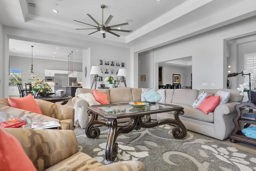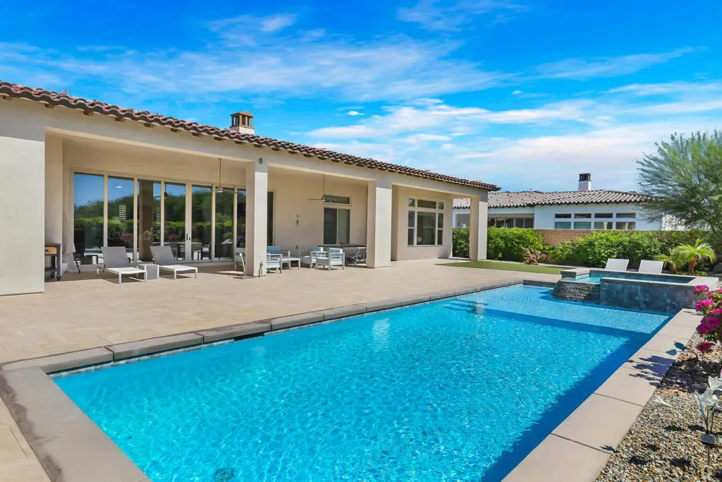 Turnkey Furnished Fabulous View south facing,theatre room, oversized pool and spa Tennis, Racketball ,, Pool Fitness center , next to Golf at PGA , 3 car tandem garage , model 6 with a stand alone casita ,great restaurants , costco and Ralphs,Old town Laquinta ,backs up to Norman course PGA ,small gated friendly community